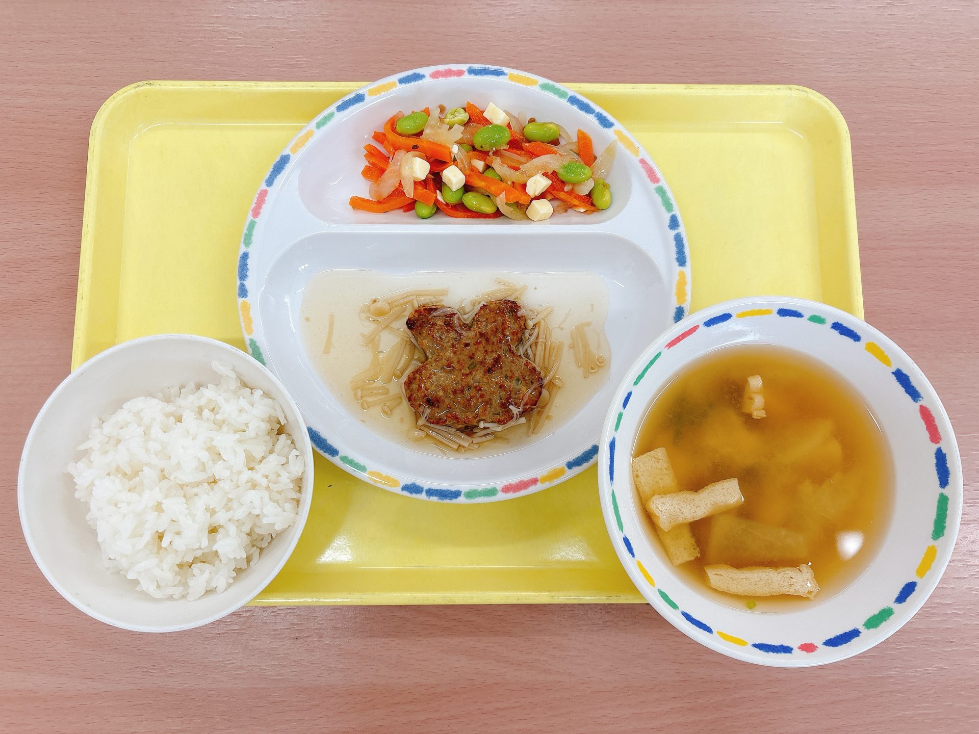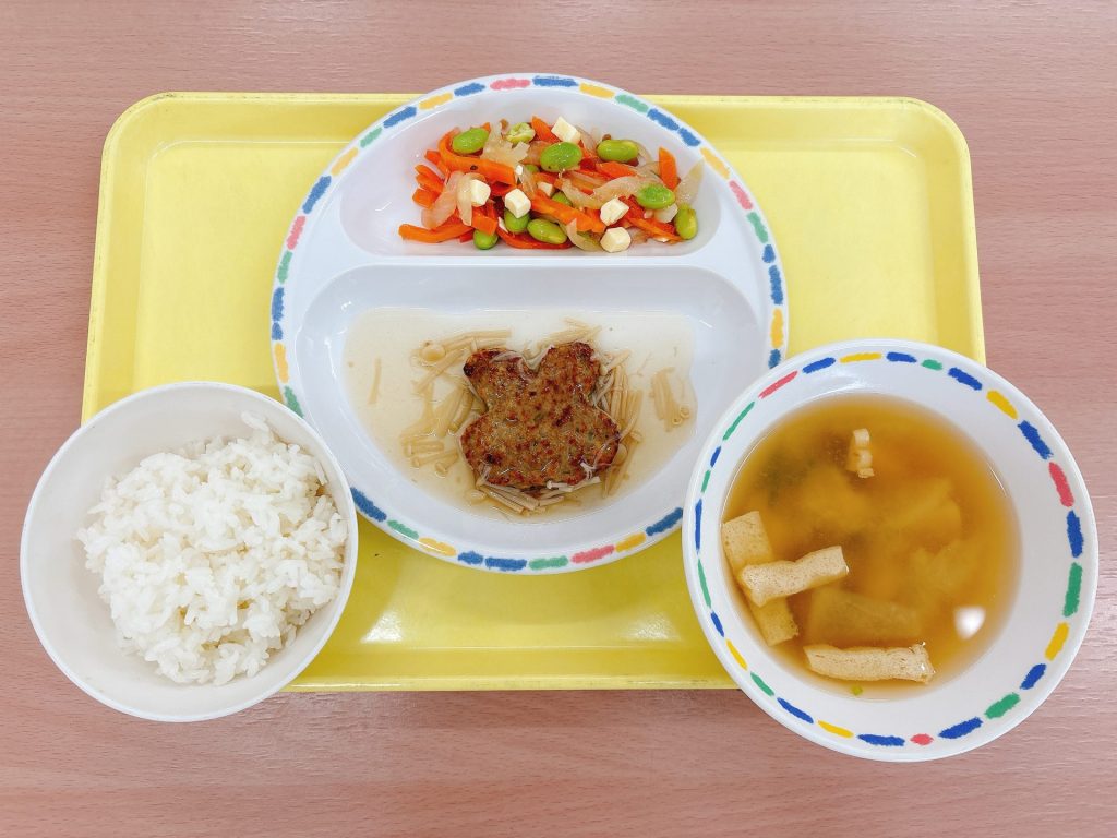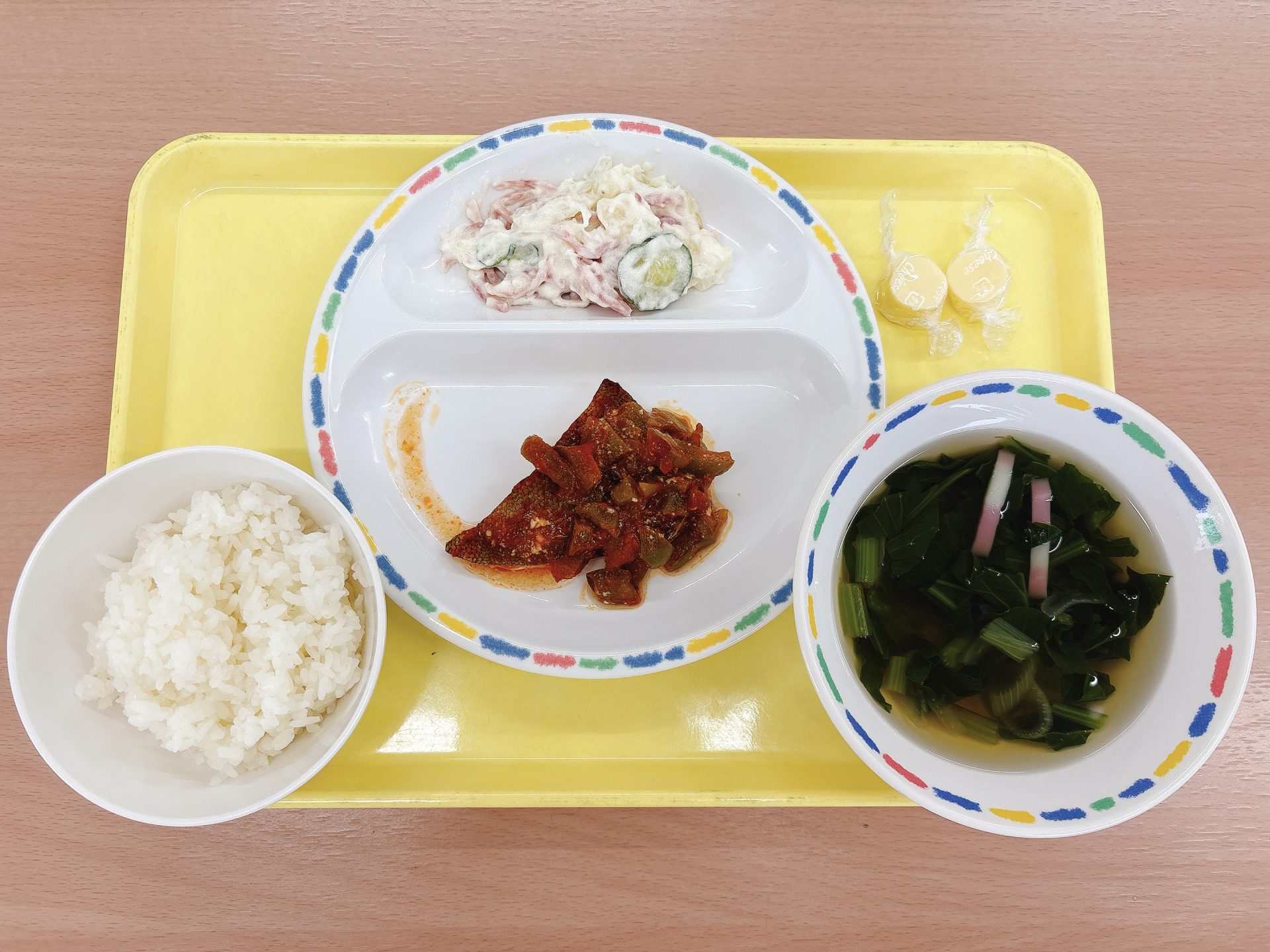 2025年10月10日 本日の給食 ・ご飯・かれいのトマト焼き・小松菜のすまし汁・ポテトサラダ・チーズ 今日の鳥取県産食材:小松菜、きゅうりトマトの日メニュー:今日はトマトの日なので、トマトソースで味付けをしたかれいです🐟🍅