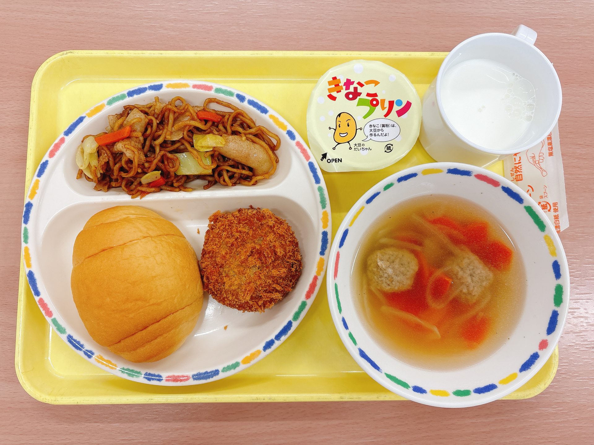 2026年02月25日 本日の給食 ・スフレブレッド・かぼちゃコロッケ・キャベツのみそ汁・肉団子のスープ・やきそば・牛乳・きなこプリン 今日の鳥取県産食材:エリンギ、豚肉、キャベツ5園リクエストメニュー:今日は5園さんリクエストのコロッケ、肉団子のスープ、やきそばです☆