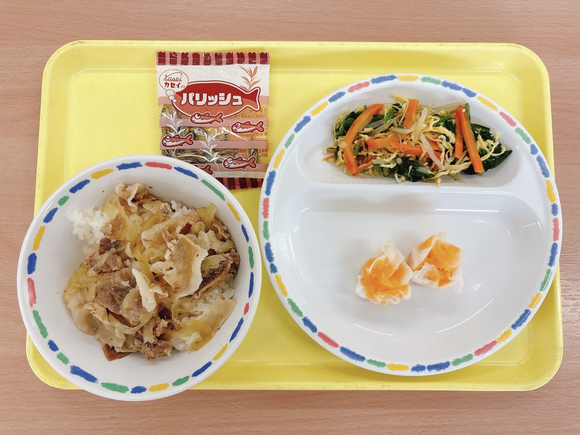 2025年10月02日 本日の給食 ・豚丼・にんじんしゅうまい・ほうれん草のもえぎ和え・パリッシュ 今日の鳥取県産食材:豚肉、ほうれん草豆腐の日メニュー:今日は豆腐の日なので、豆腐を使ったしゅうまいです⭐️