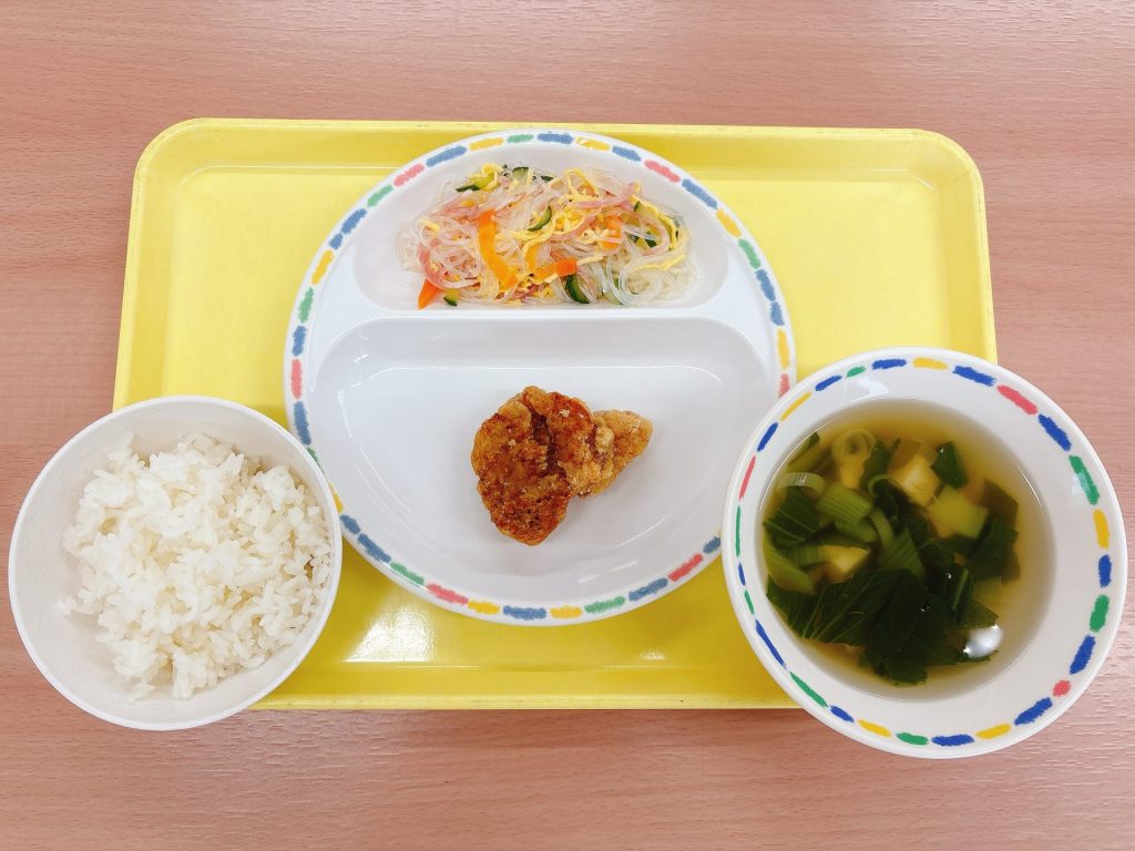 ・ご飯・からあげ・チンゲン菜のスープ・春雨サラダ