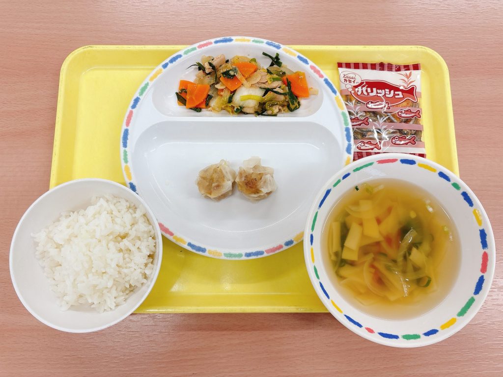 ・ご飯・しゅうまい・たけのこスープ・鶏肉のキムチ炒め・パリッシュ