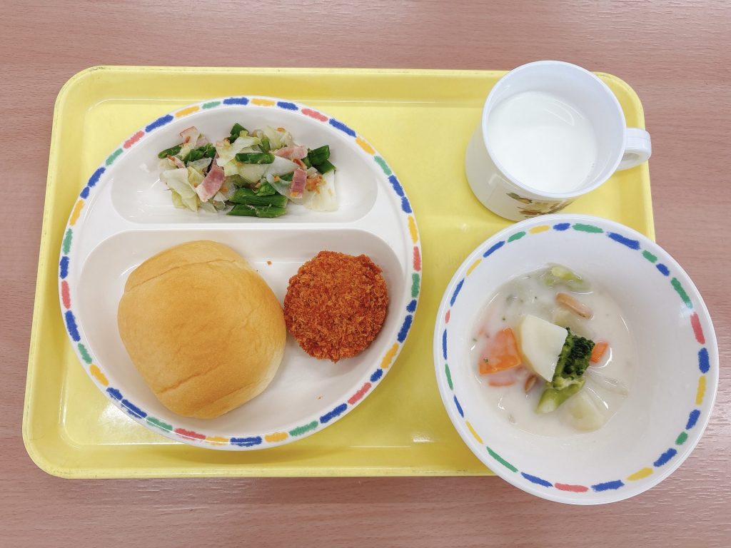 ・スフレブレッド・ツナマヨフライ・じゃがいものクリーム煮・アスパラのピーナツ炒め・牛乳