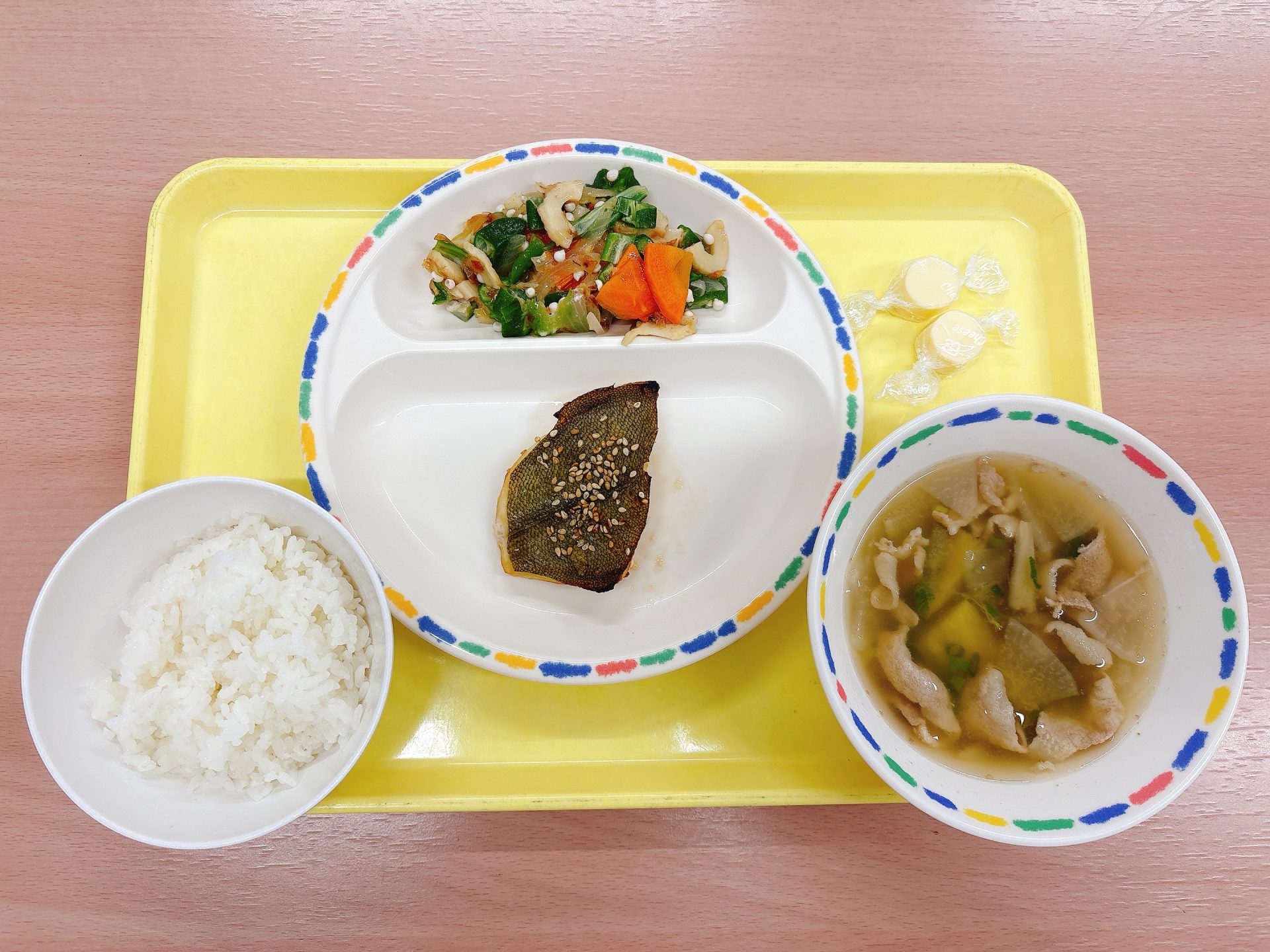 ・ご飯・かれいのごま照り焼き・豚汁・オクラのおかか和え・チーズ