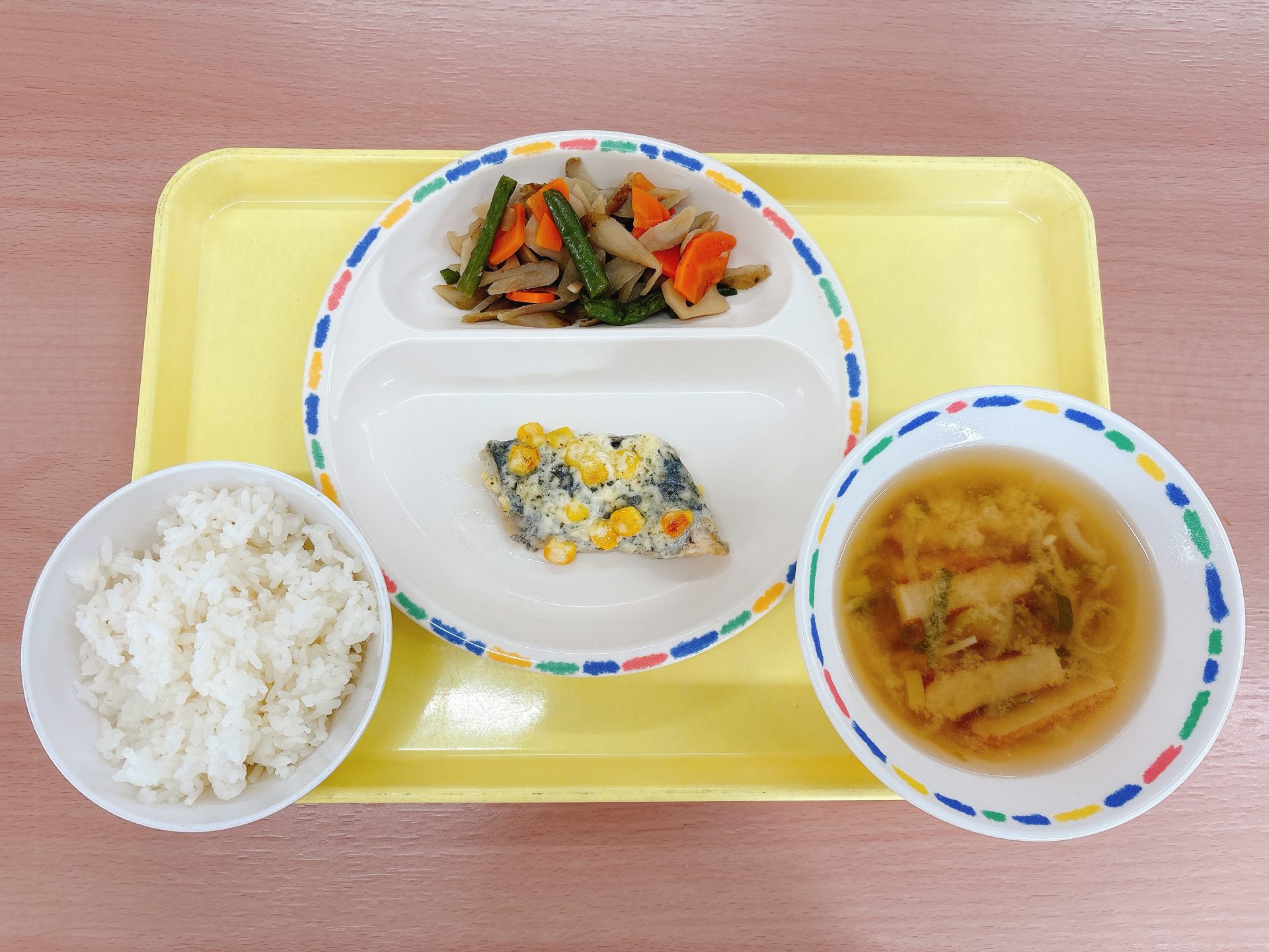 ・ご飯・さわらのマヨコーン焼き・さつま揚げのみそ汁・きんぴらごぼう