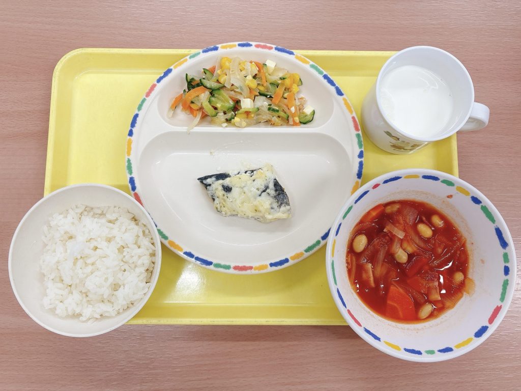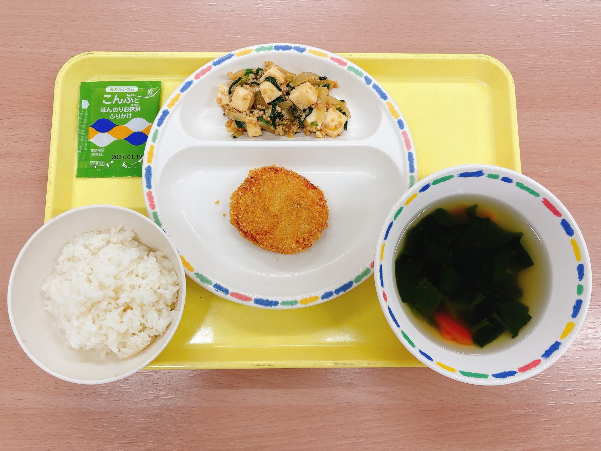 2026年02月06日 本日の給食 ・ご飯・白身フライ・小松菜のみそ汁・高野豆腐の含め煮・こんぶふりかけ 今日の鳥取県産食材:米、小松菜、にんじんのりの日、抹茶の日メニュー:今日はのりと抹茶を使った、こんぶふりかけがついています🍵