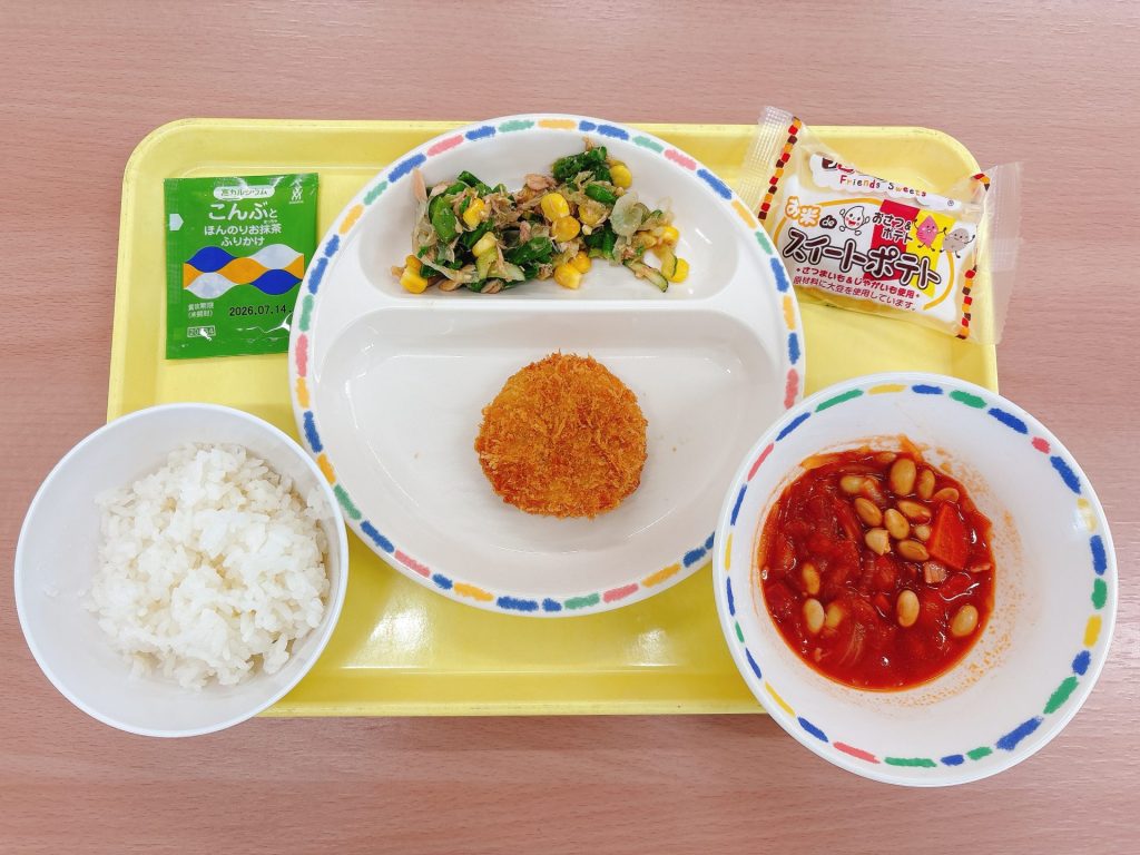 ・ご飯・チキンカツ・大豆のトマト煮・アスパラのごま和え・こんぶふりかけ・お米のスイートポテト(誕生会デザート)
