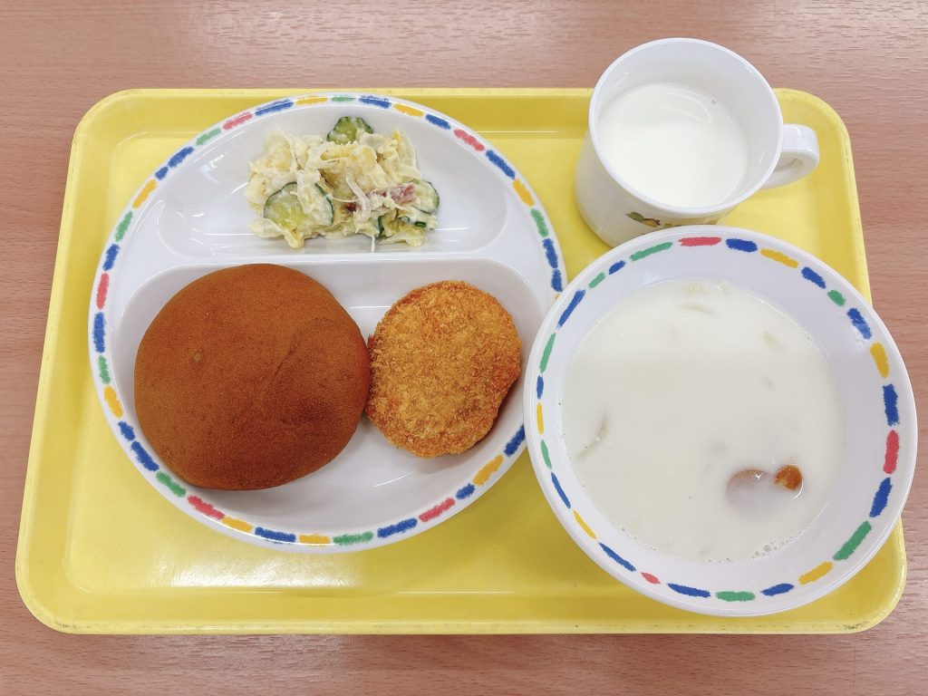 ・黒糖パン・鮭メンチカツ・ミルクスープ・スイートポテトサラダ・牛乳