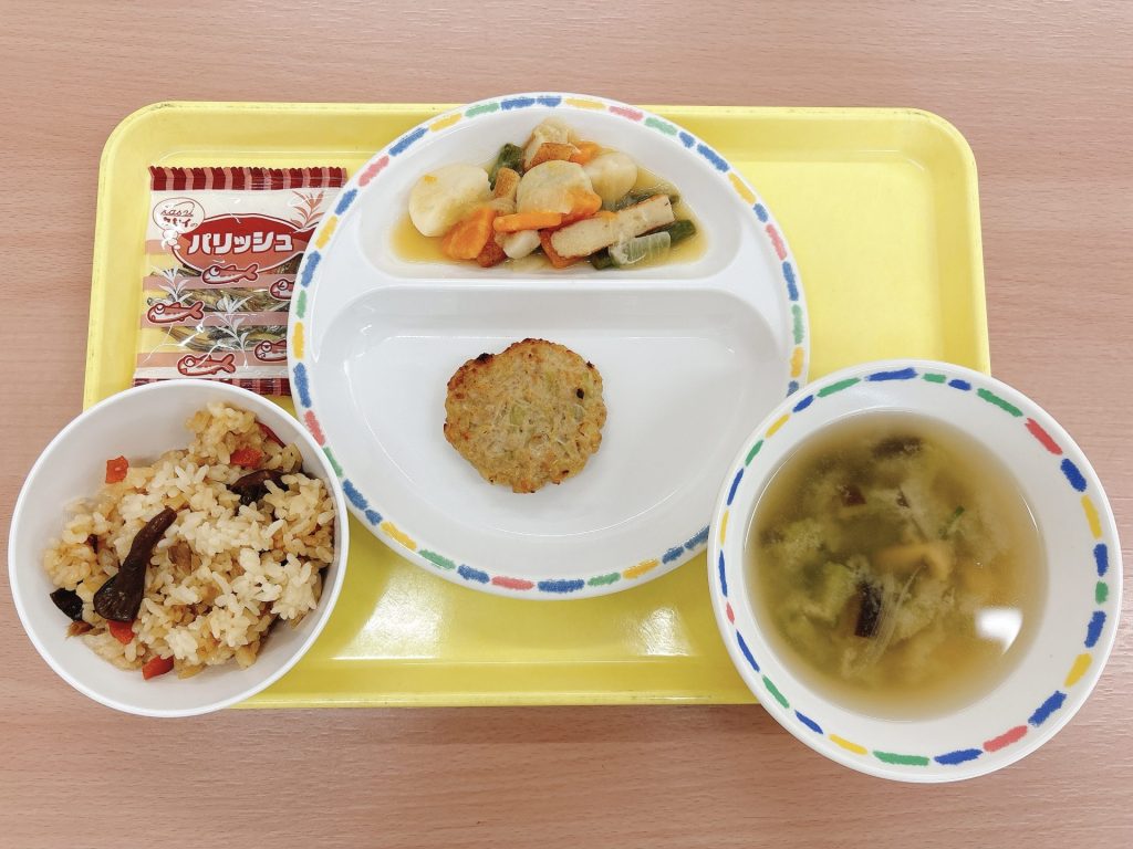 ・きのこご飯・鶏つくね・なすのみそ汁・さといもの煮物・パリッシュ