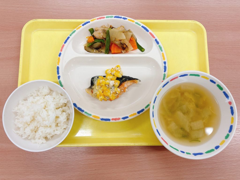 ・ご飯・ますのマヨコーン焼き・白菜のみそ汁・鶏肉と根菜の炒り煮