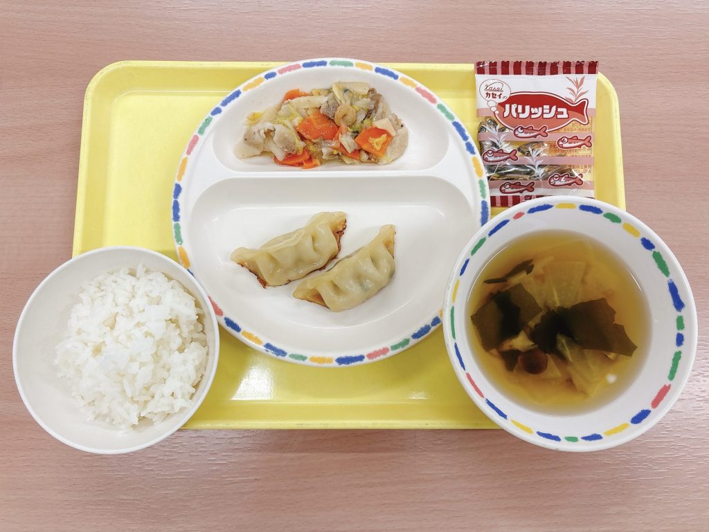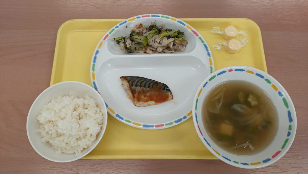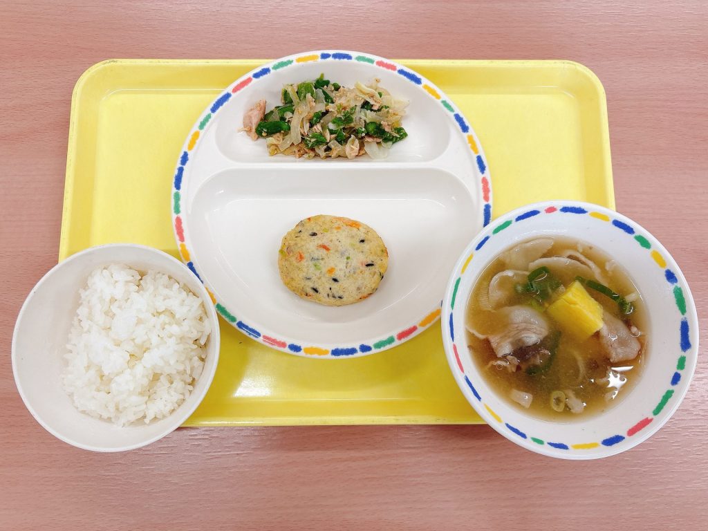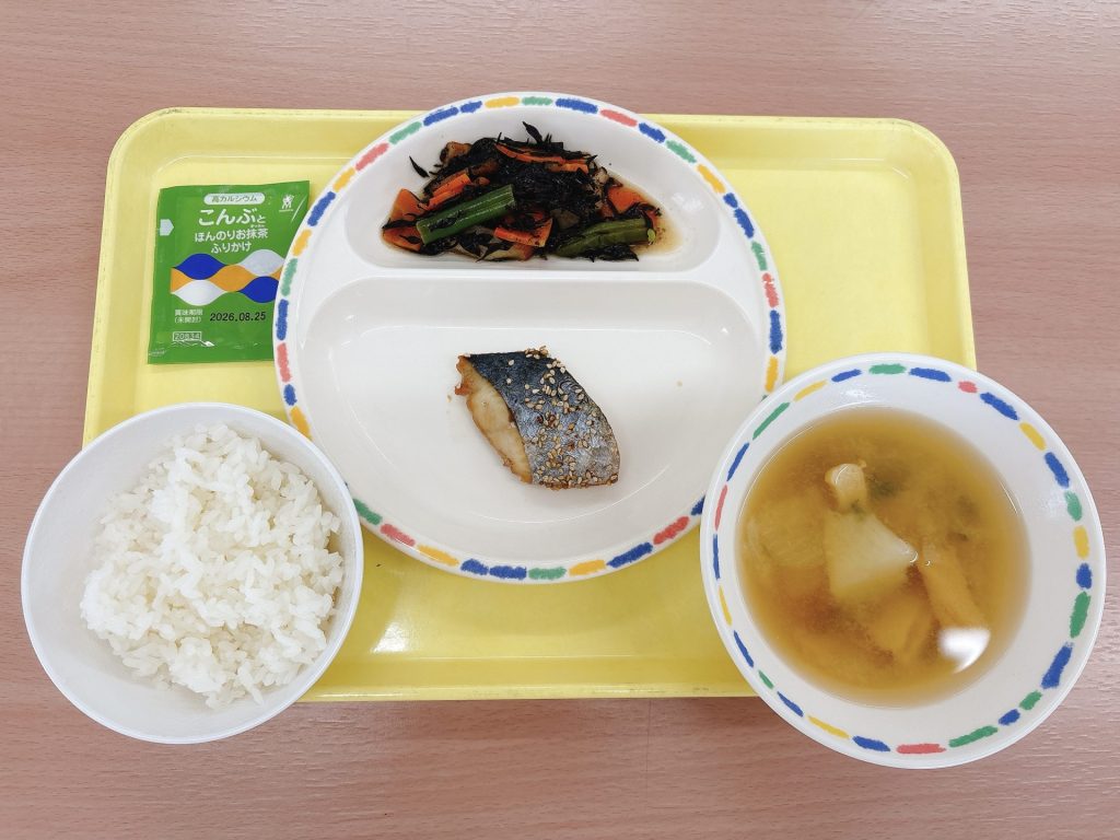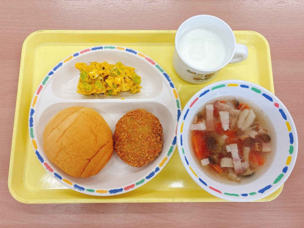 2025年10月15日 本日の給食 ・スフレブレッド・カレーレバーメンチカツ・しめじのスープ・かぼちゃサラダ・牛乳 今日の鳥取県産食材:しめじきのこの日メニュー:今日はきのこの日なのでしめじを使ったスープです🍄