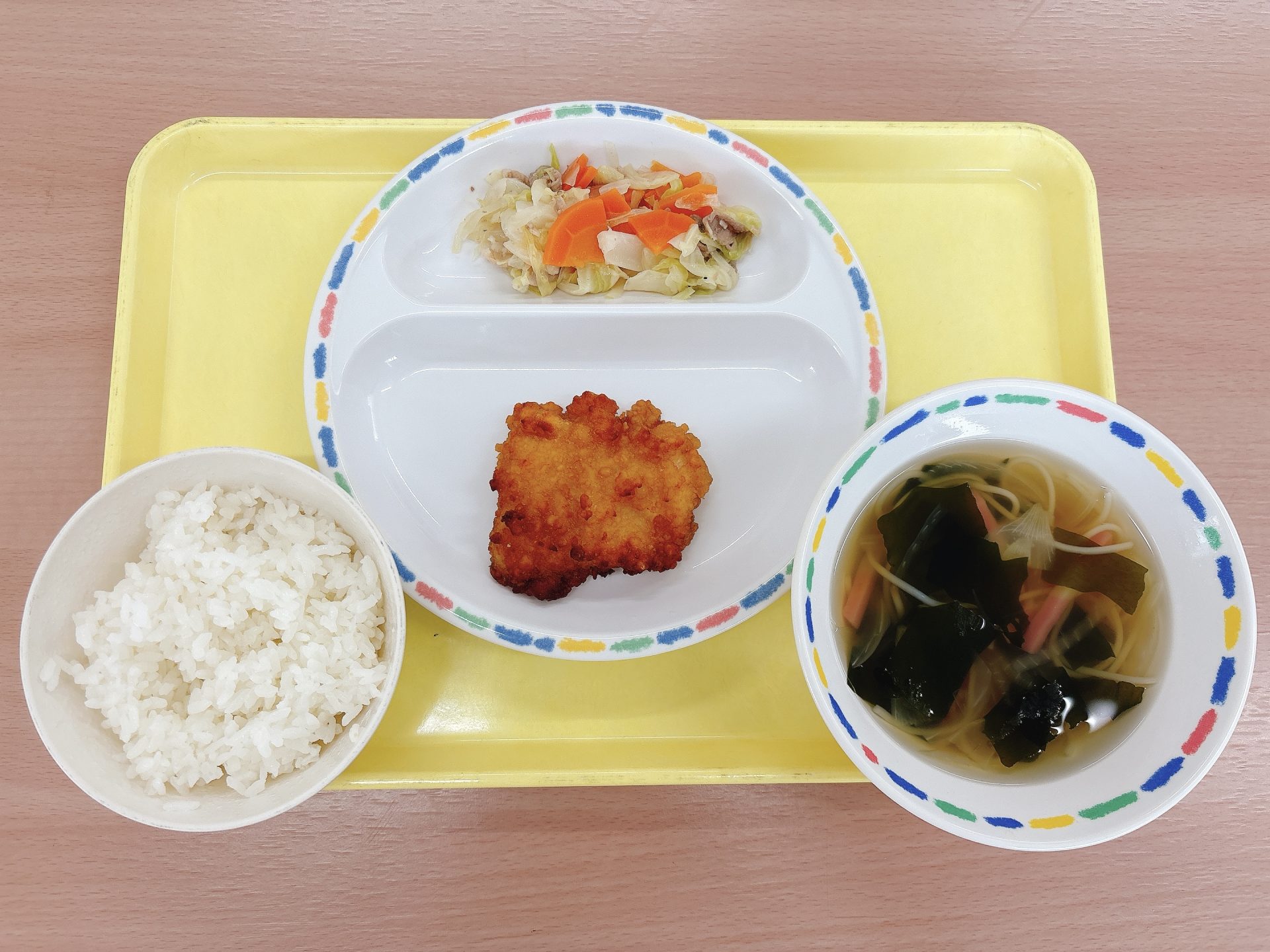 2025年10月10日 本日の給食 ・ご飯・かれいのトマト焼き・小松菜のすまし汁・ポテトサラダ・チーズ 今日の鳥取県産食材:小松菜、きゅうりトマトの日メニュー:今日はトマトの日なので、トマトソースで味付けをしたかれいです🐟🍅