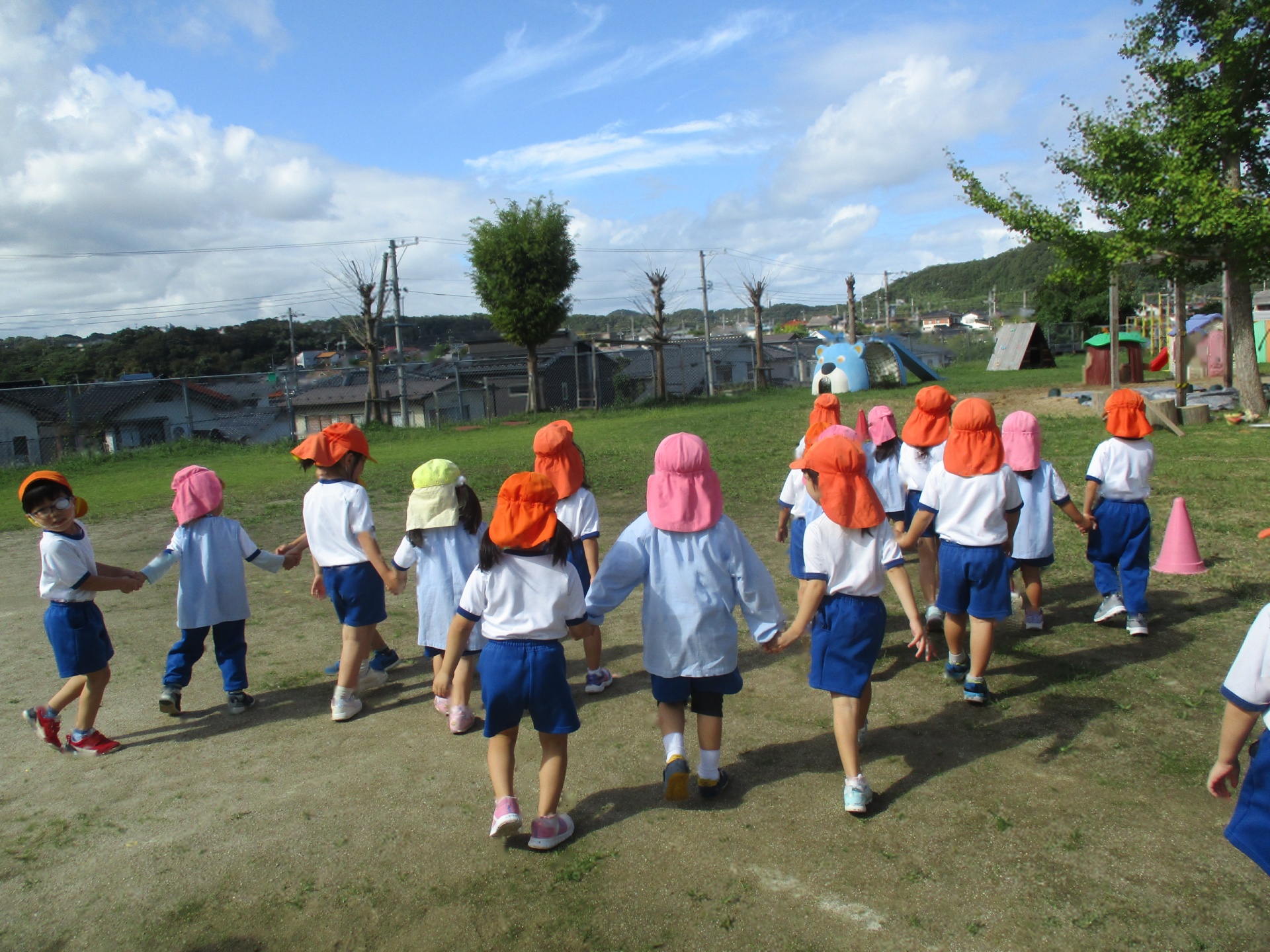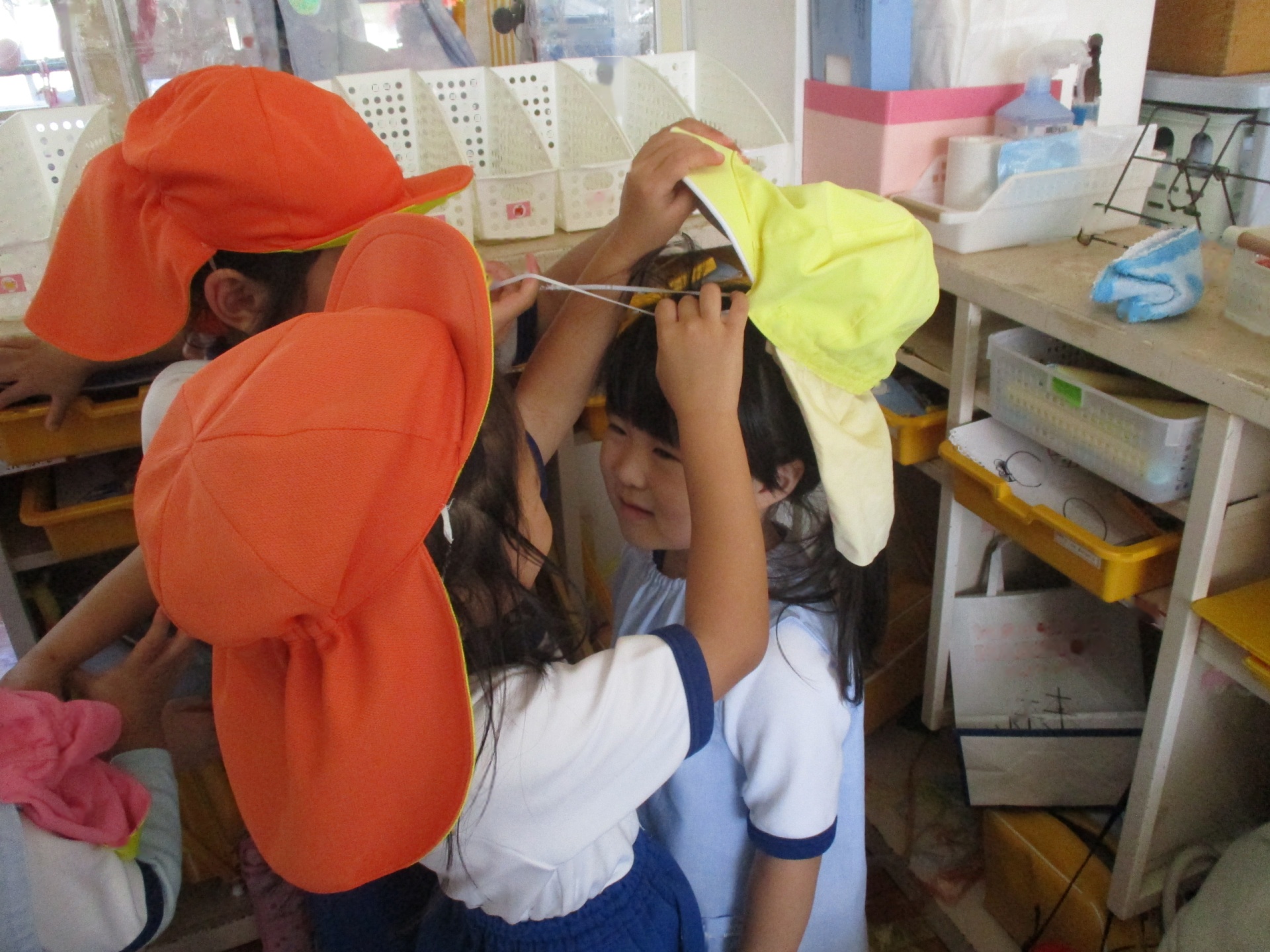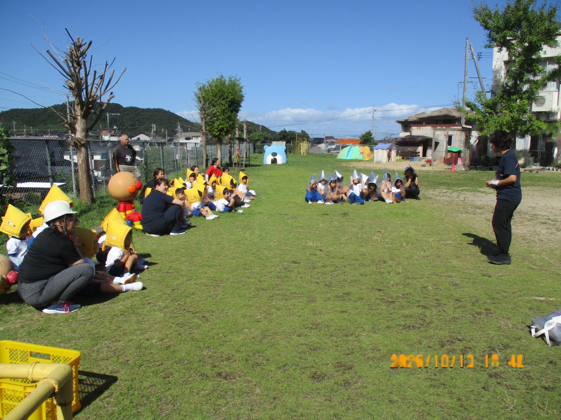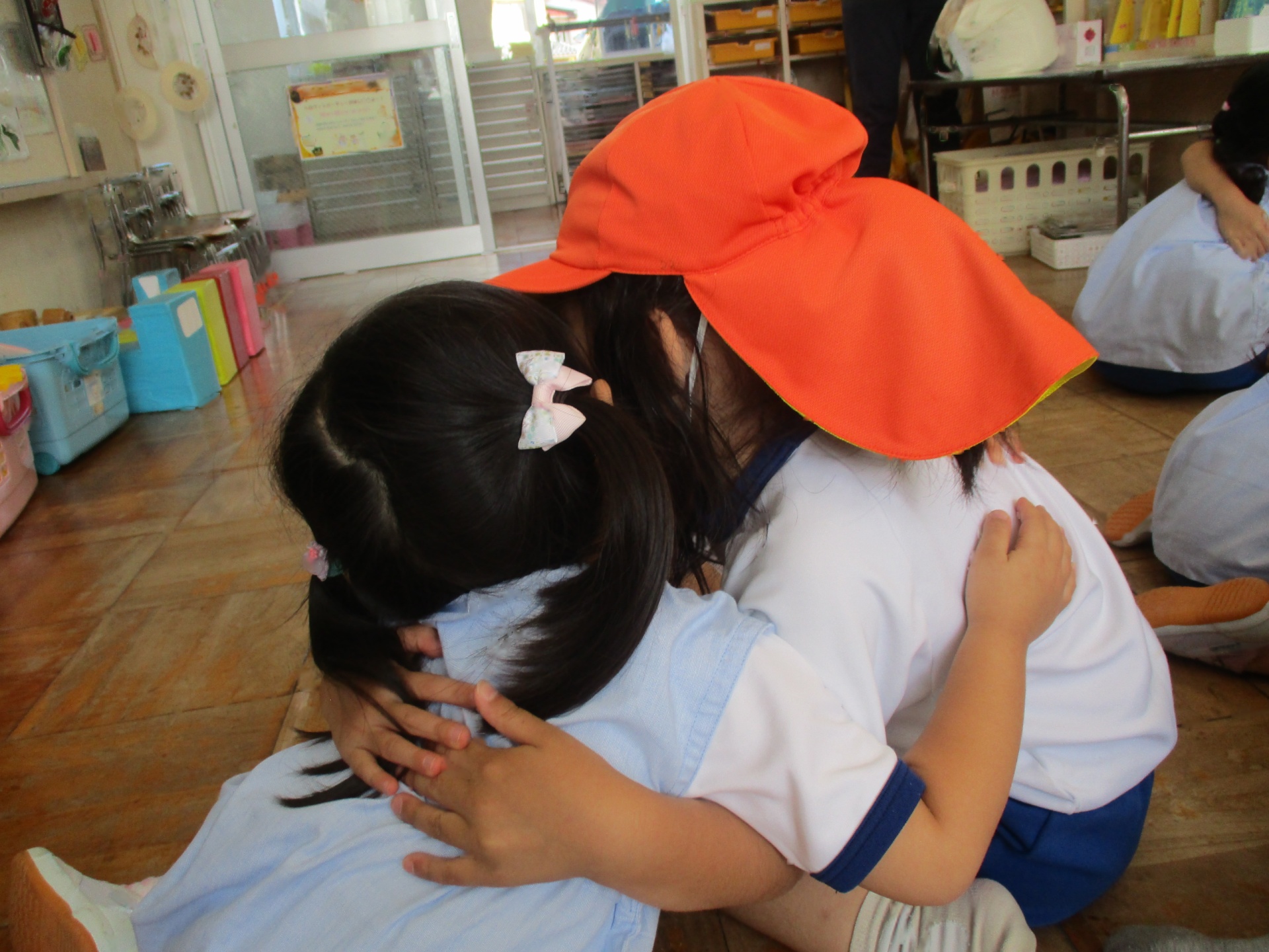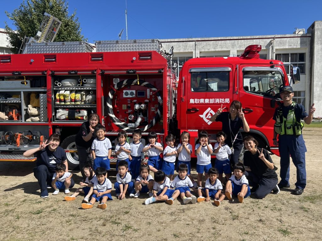 避難訓練では、『おはしも』のお約束と煙を吸わないように口をハンカチで覆うなど、避難時のルールをしっかりと守って避難することができました。非常ベルの音に驚きながらも落ち着いて訓練に参加できて素晴らしかったです!消防署の方からも、「上手に避難ができていました!」と褒めてくださいました!