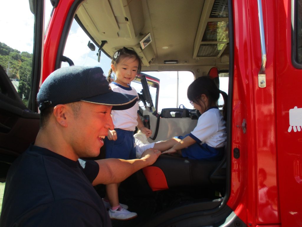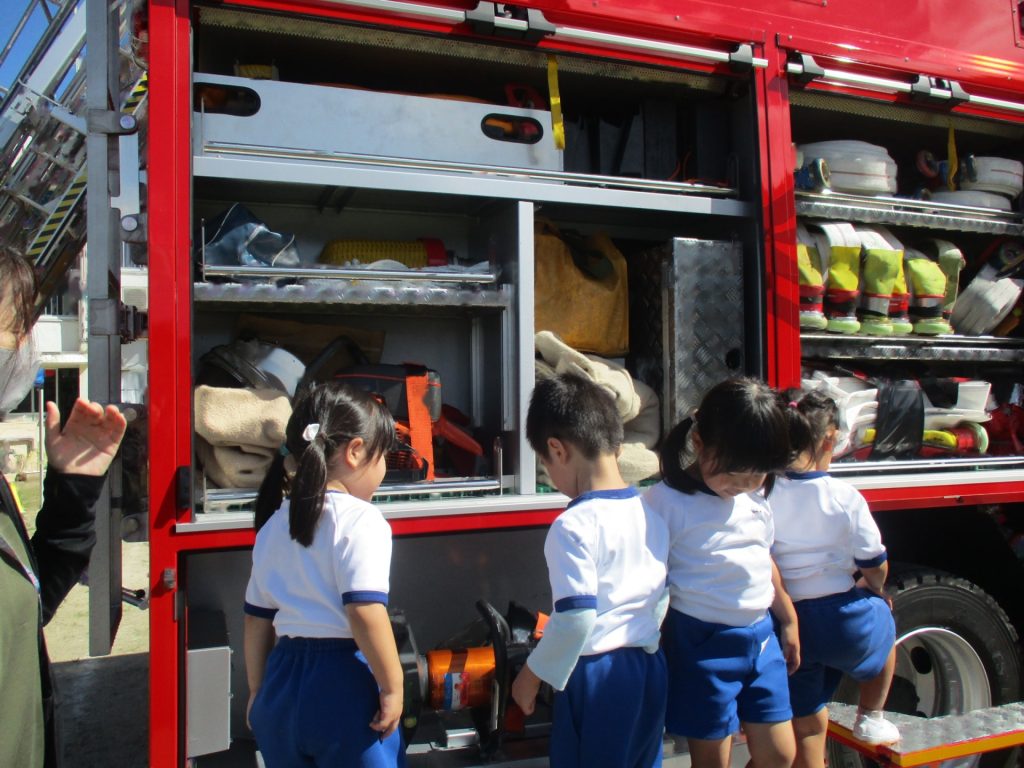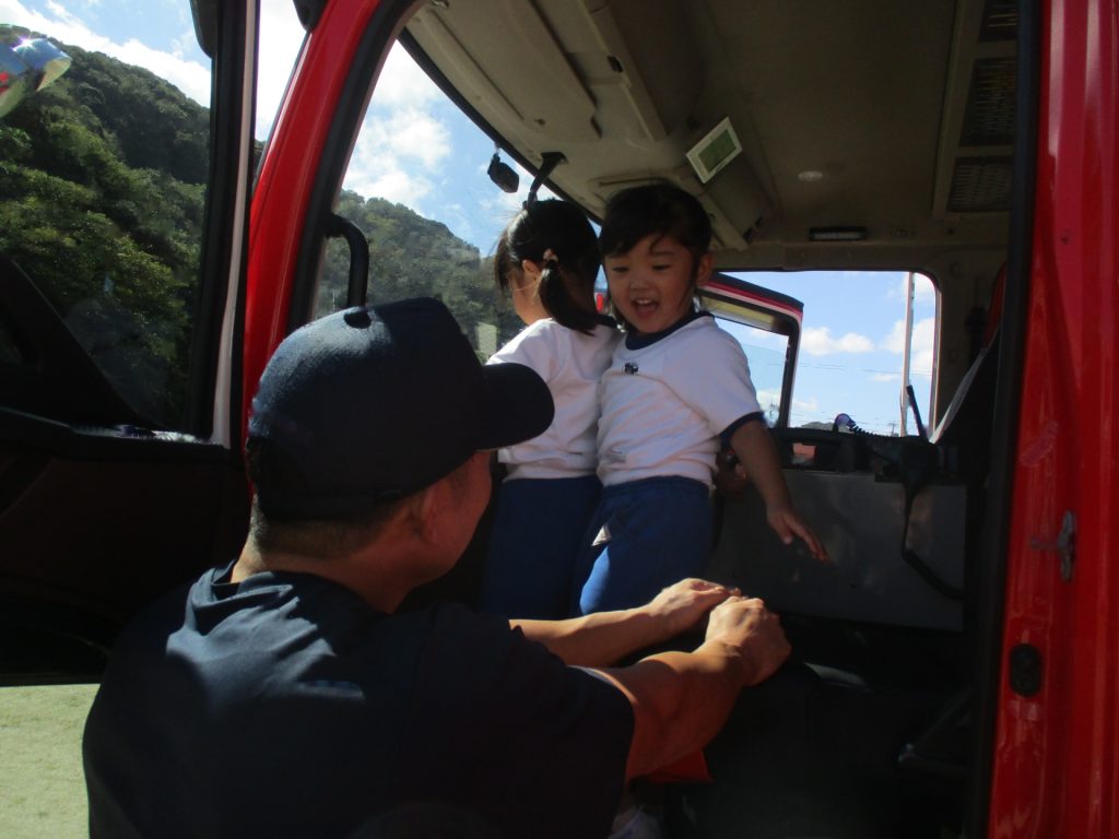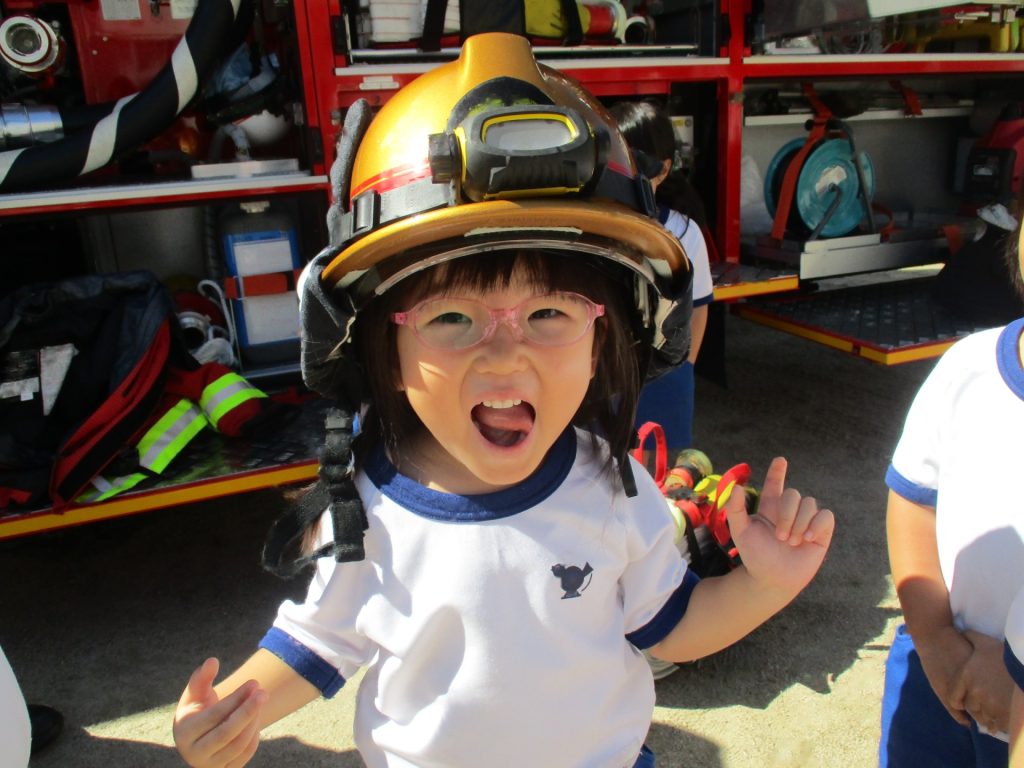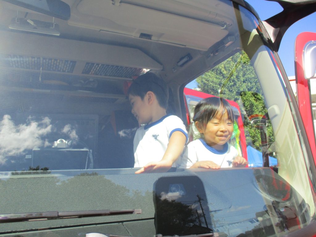 そして、避難訓練の後には消防士さんより放水の様子を見せていただいたり消防車見学など、貴重な体験をさせてもらいました。間近で見る実際の消防車にちょっぴり圧倒されながらも、終始嬉しそうな子ども達でした。