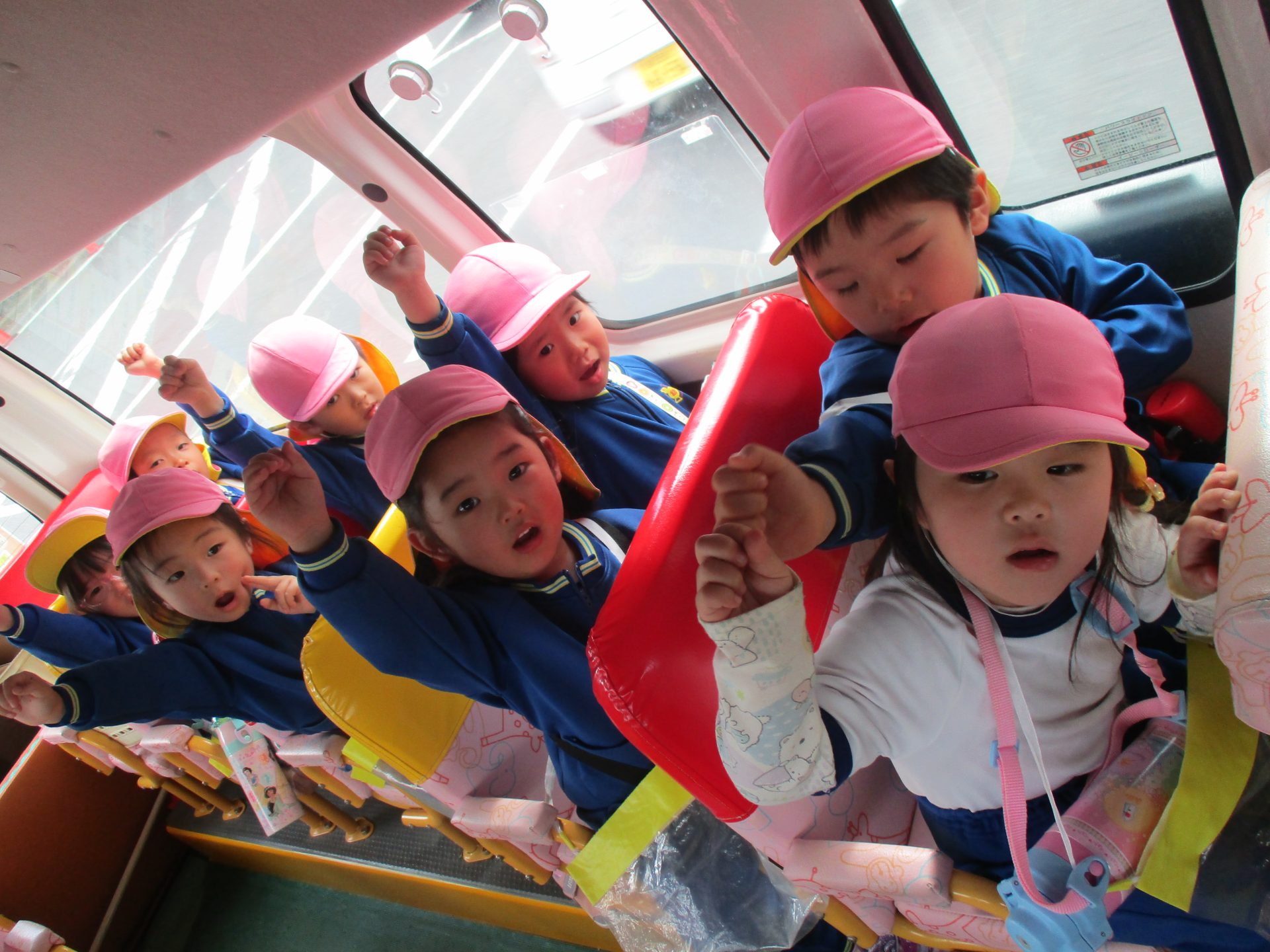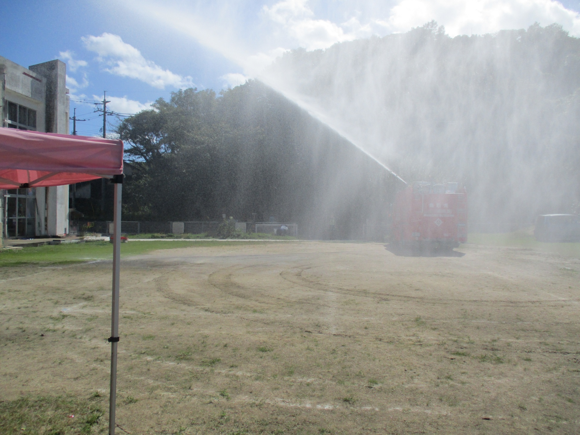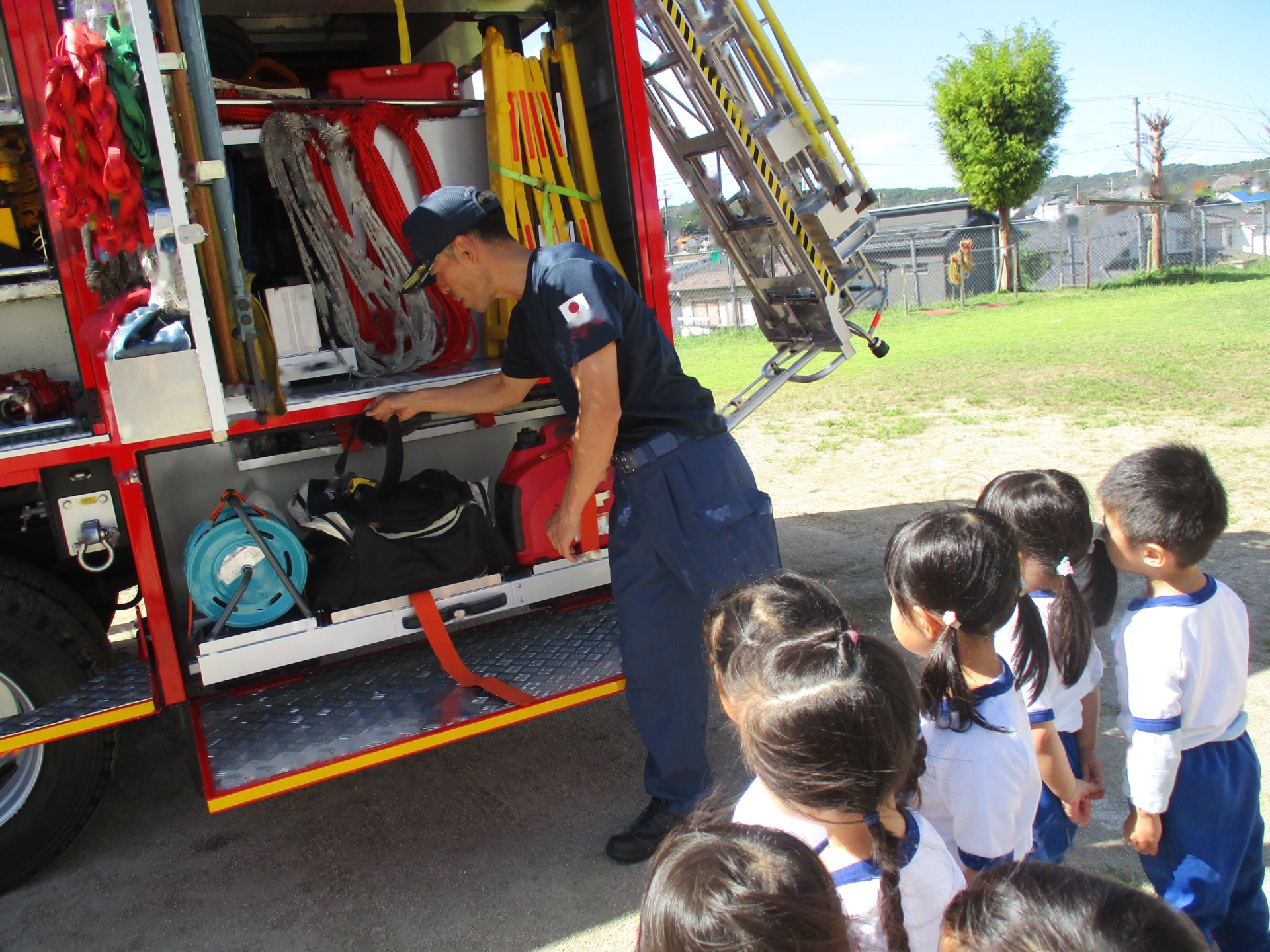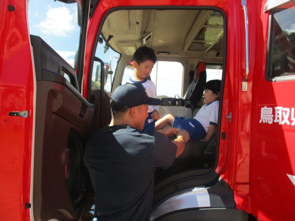 そして、避難訓練の後には消防士さんより放水の様子を見せていただいたり消防車見学など、貴重な体験をさせてもらいました。間近で見る実際の消防車にちょっぴり圧倒されながらも、終始嬉しそうな子ども達でした。