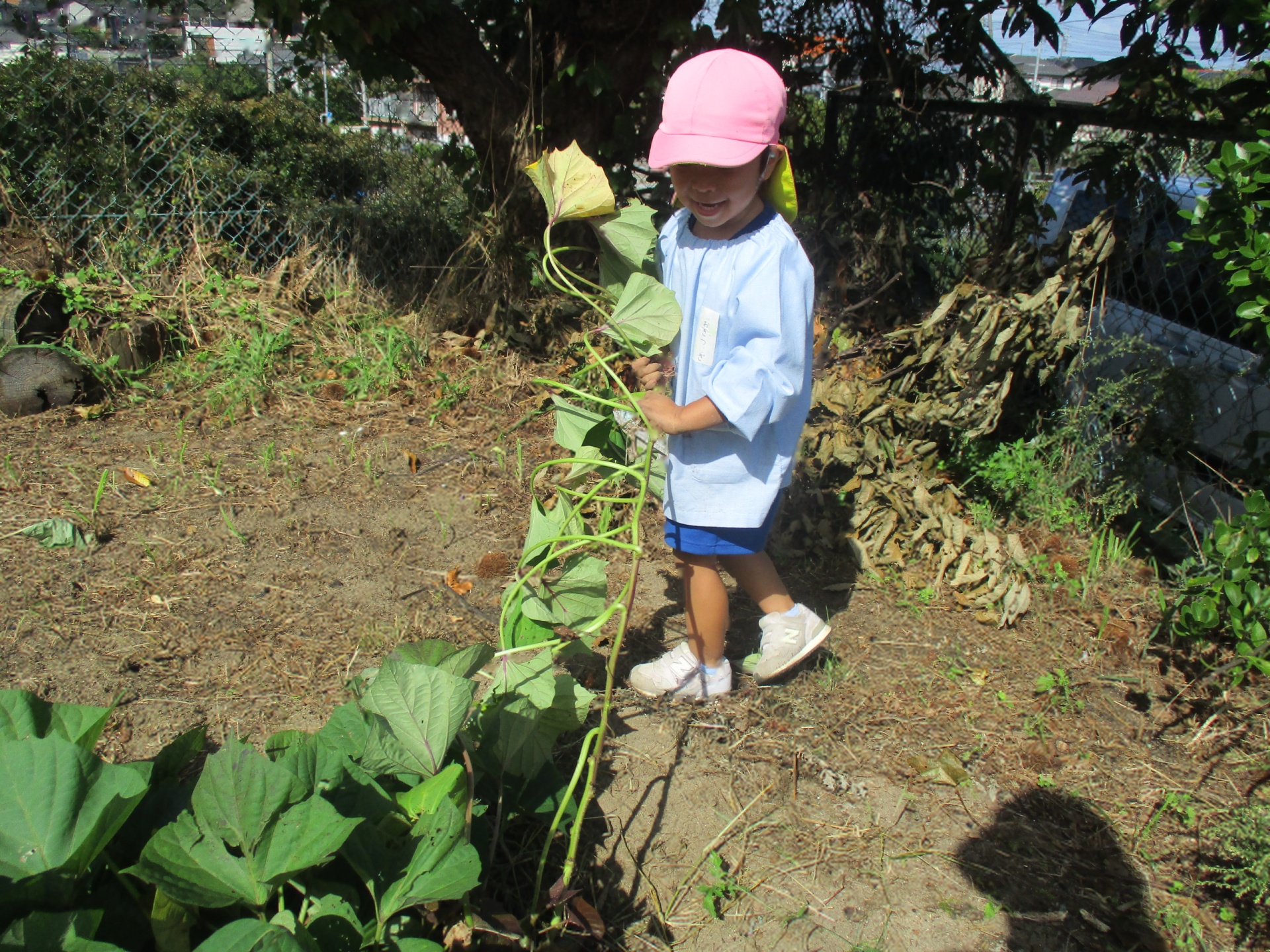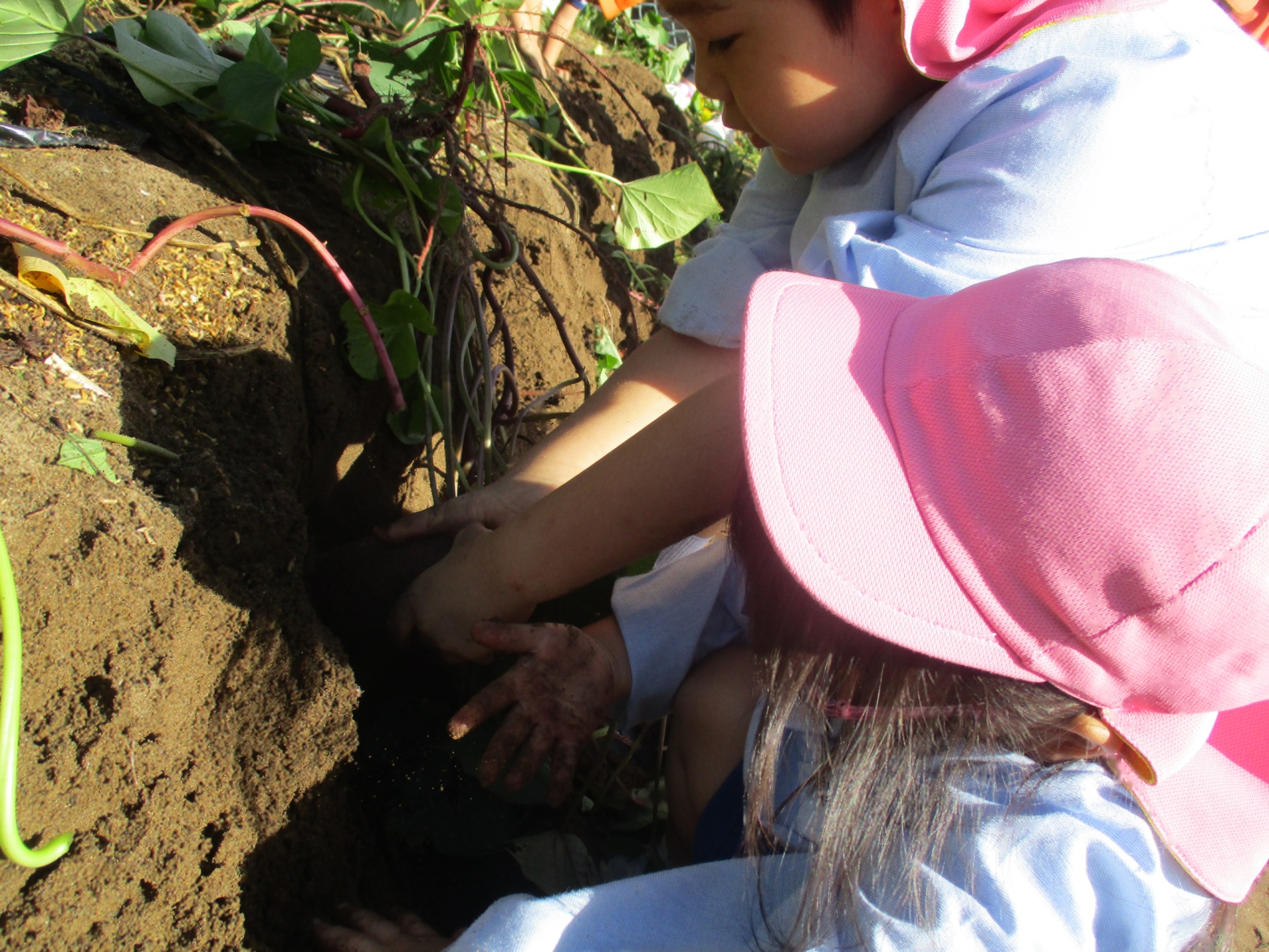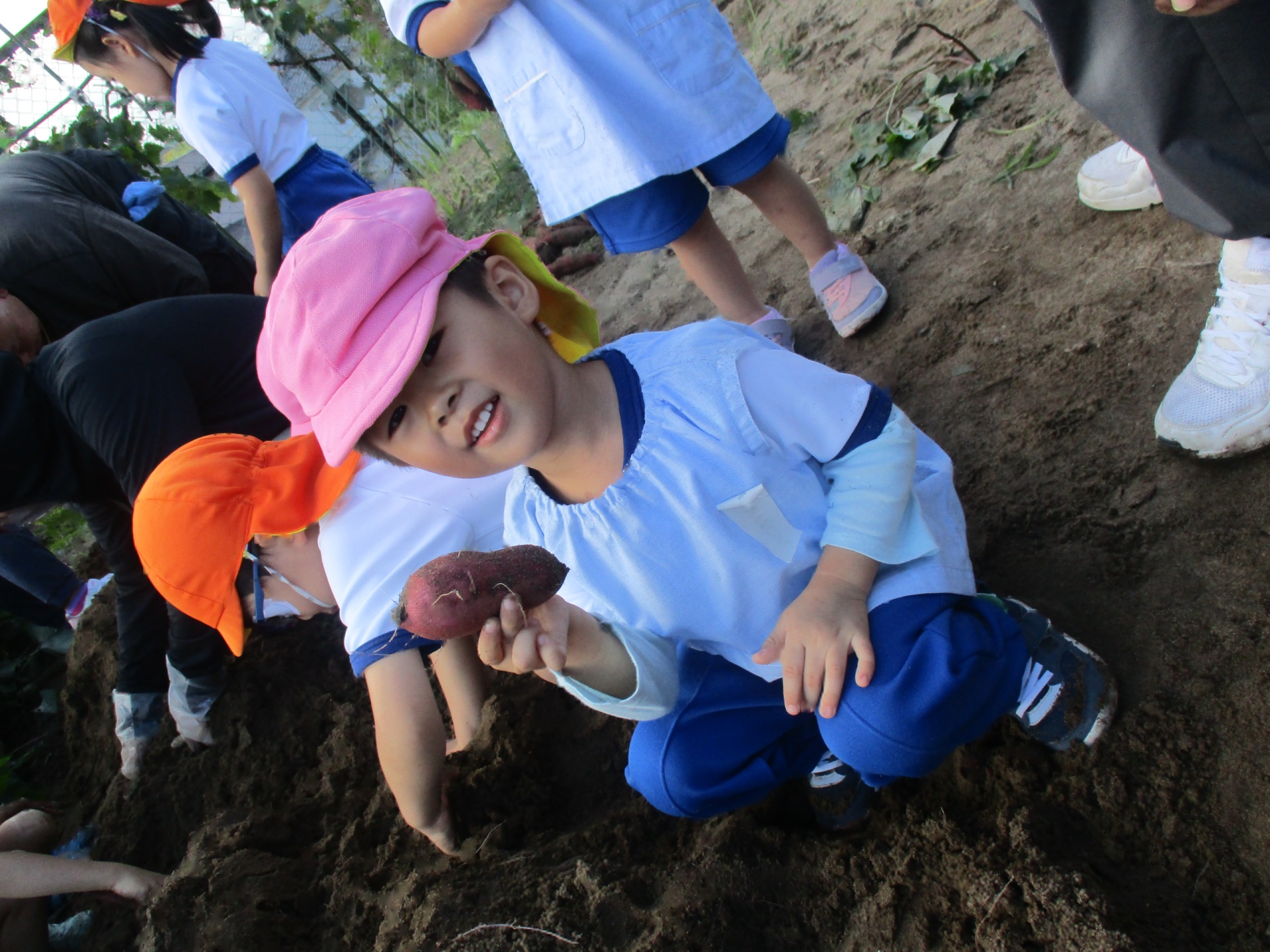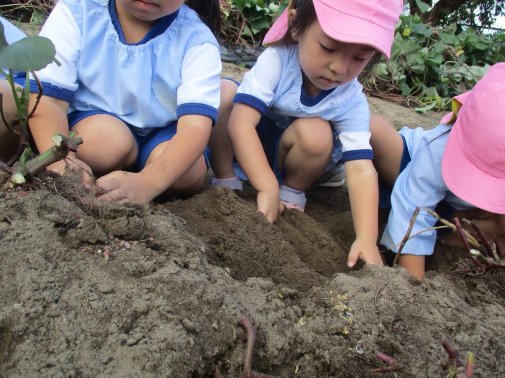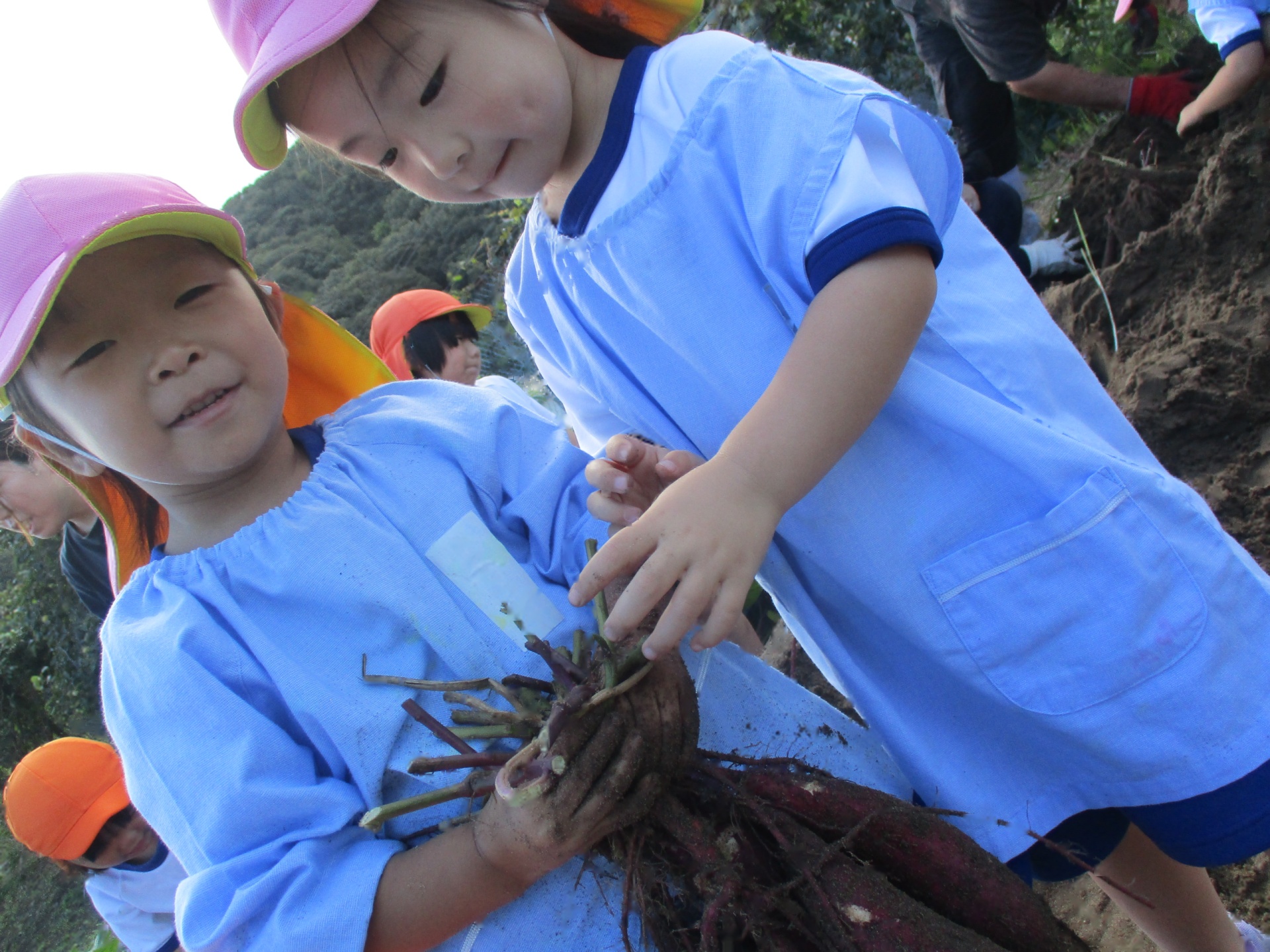 今年も園の畑は、実りの秋!大きな大きなさつまいもが、ぐんぐん育ち、土の中から顔を出していました。そこで、年中組のお兄さんお姉さんと一緒に畑に行き、いもほりの収穫体験!