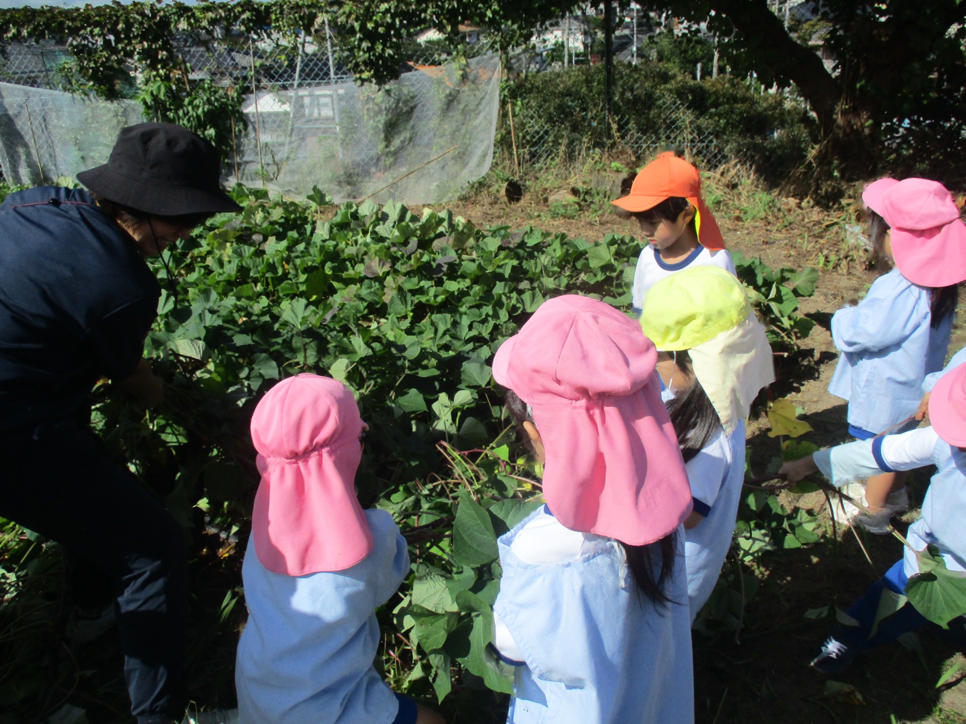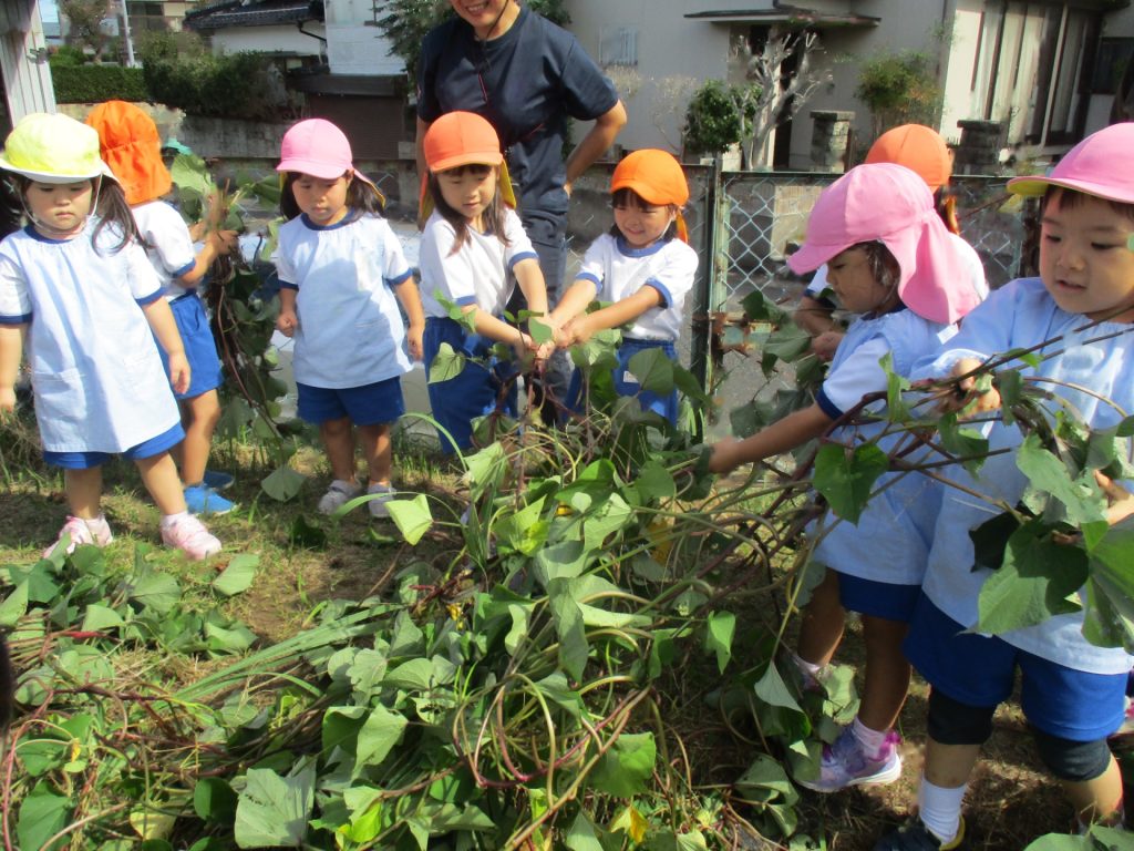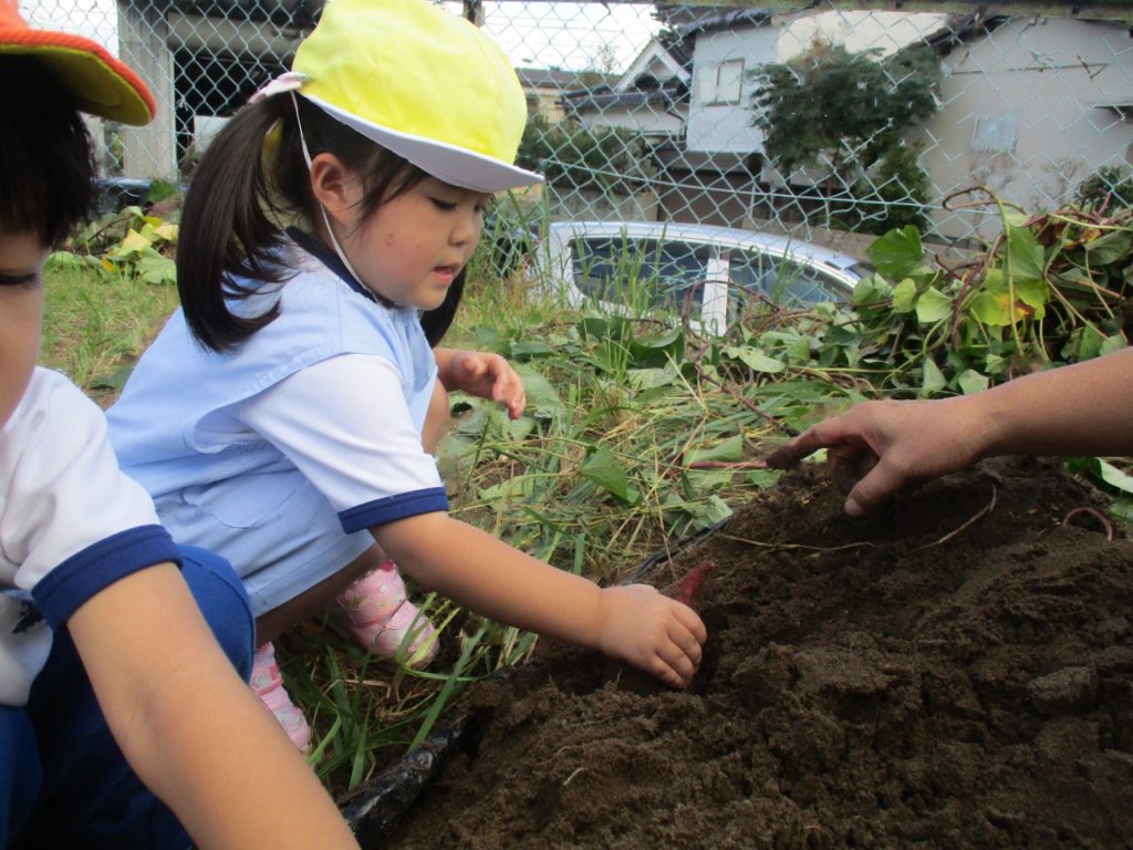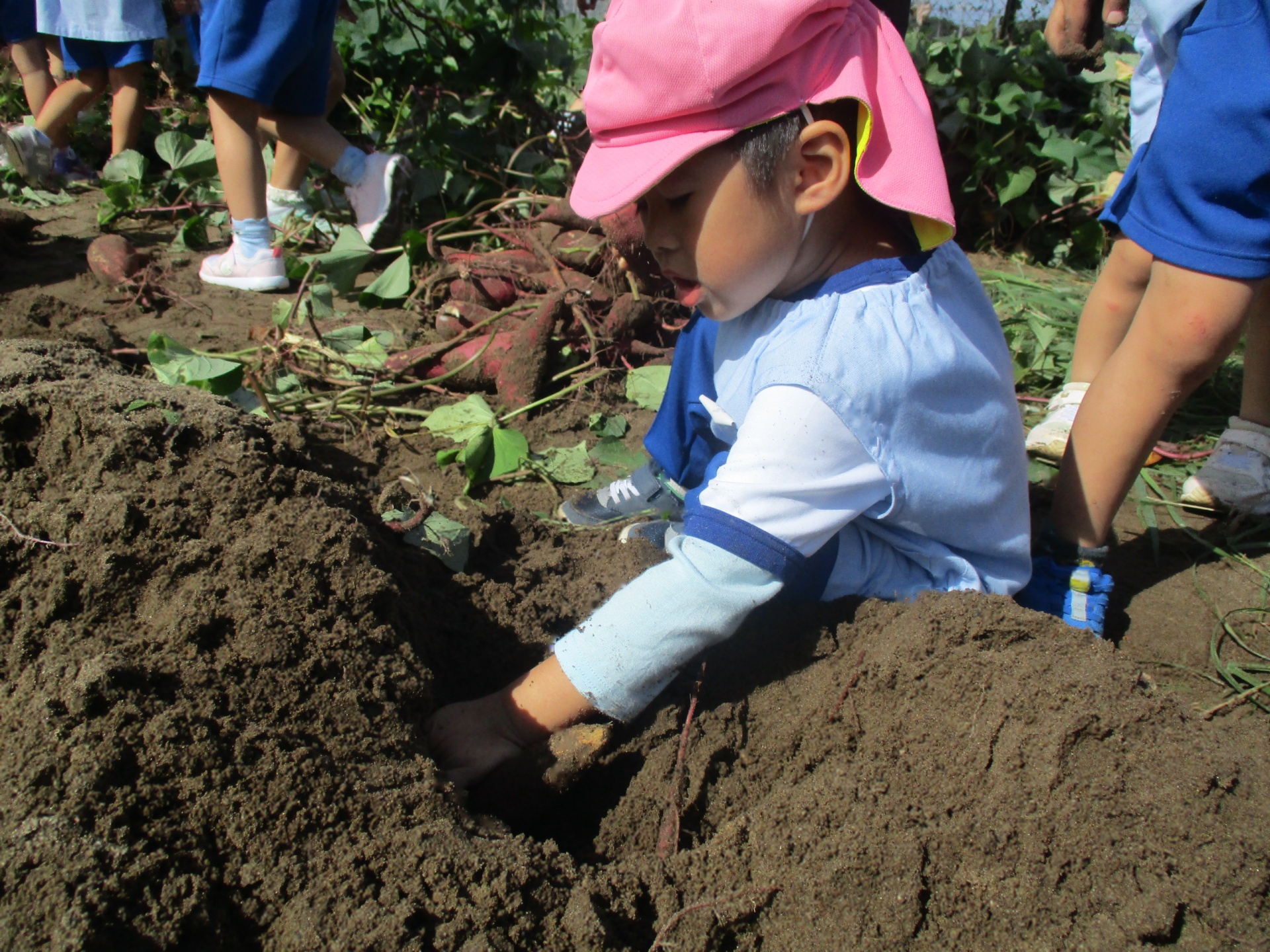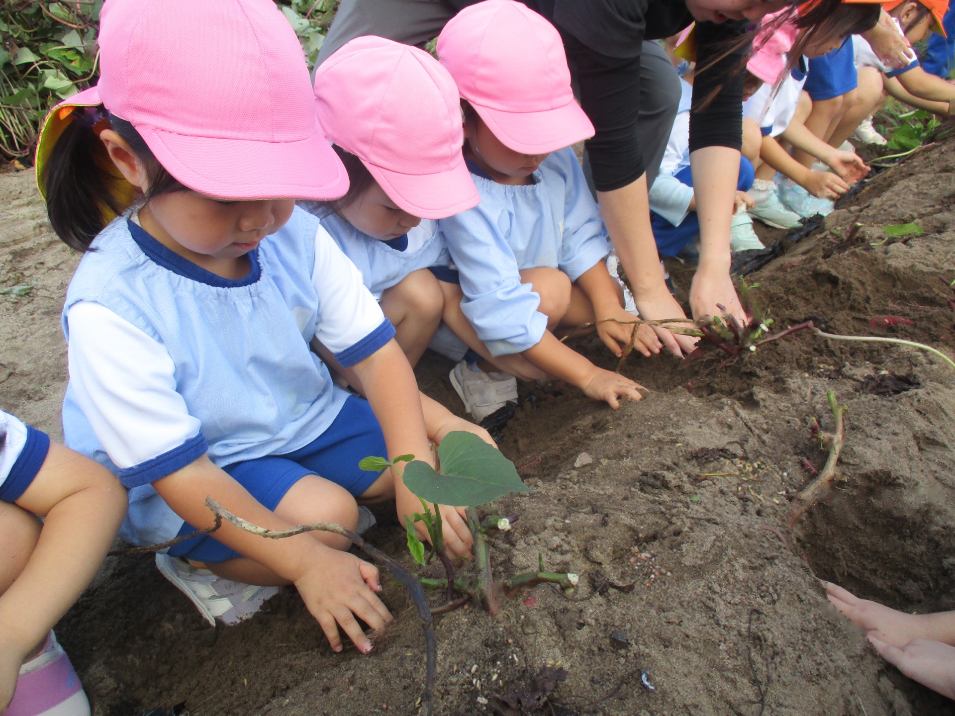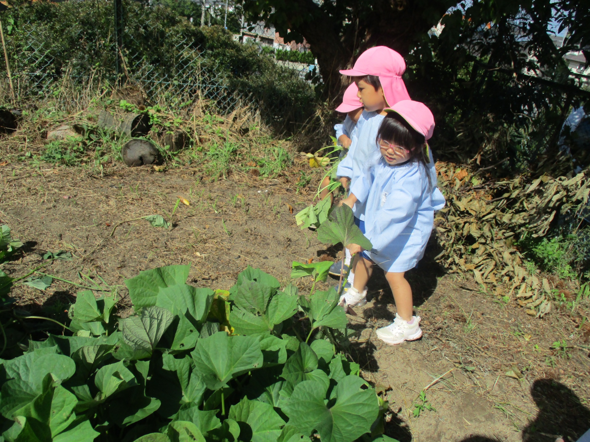 今年も園の畑は、実りの秋!大きな大きなさつまいもが、ぐんぐん育ち、土の中から顔を出していました。そこで、年中組のお兄さんお姉さんと一緒に畑に行き、いもほりの収穫体験!