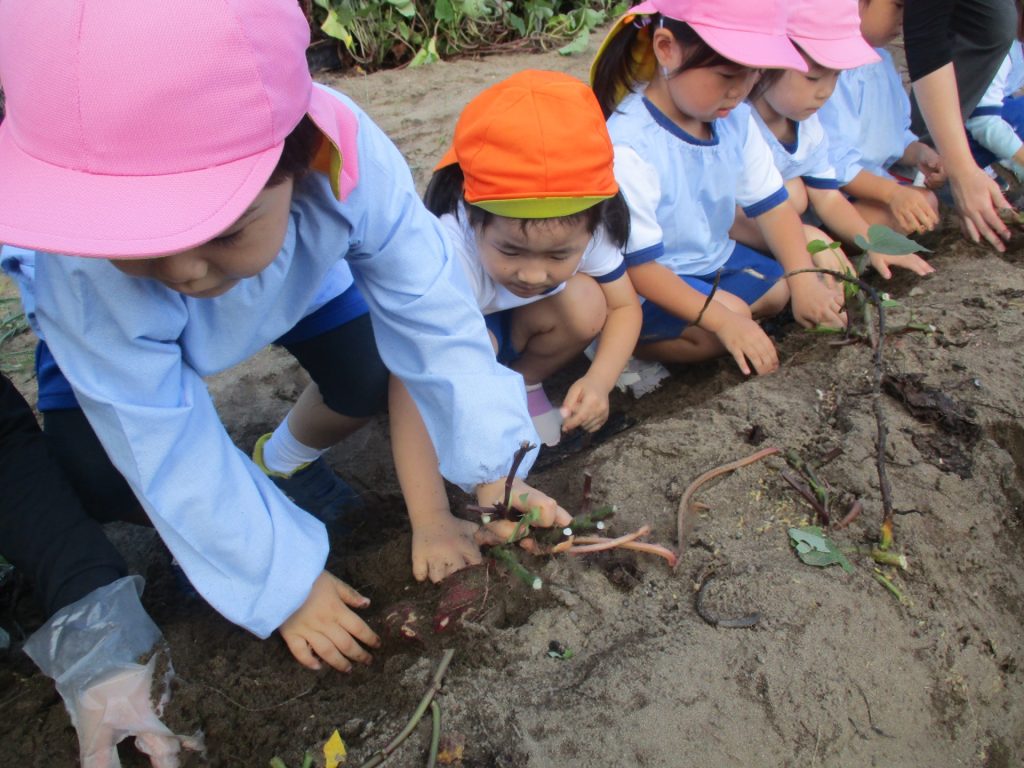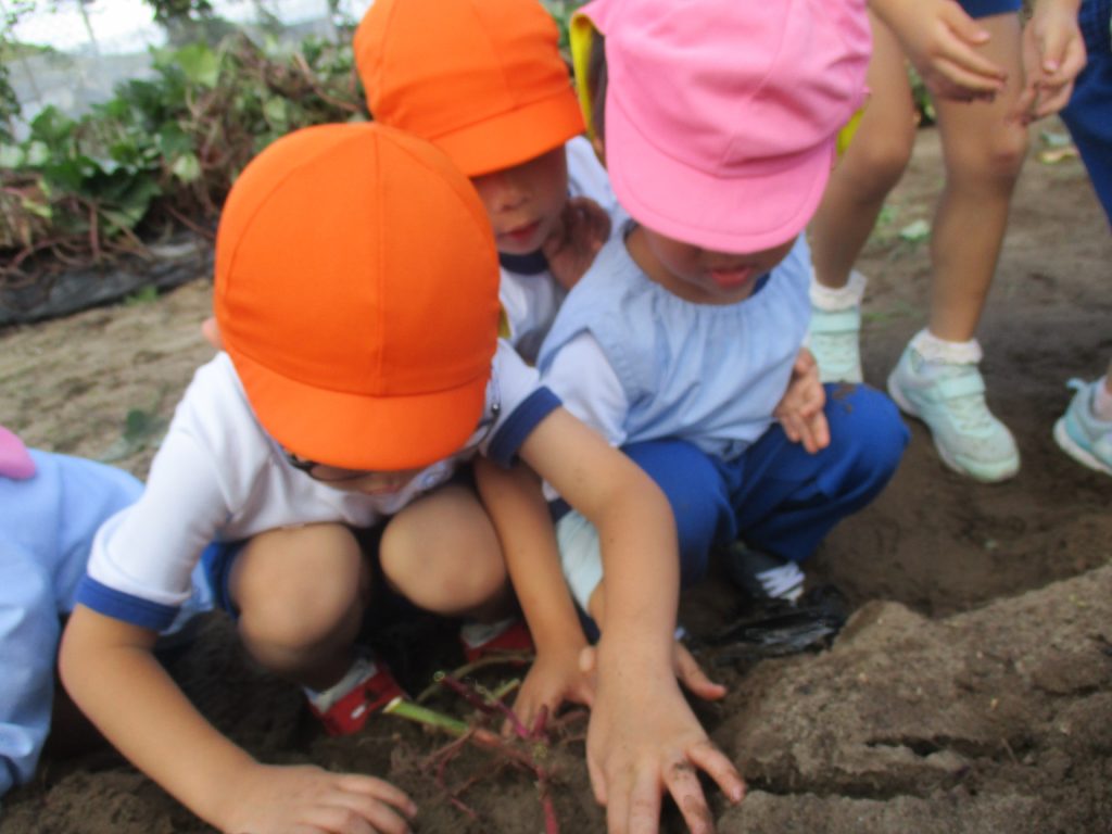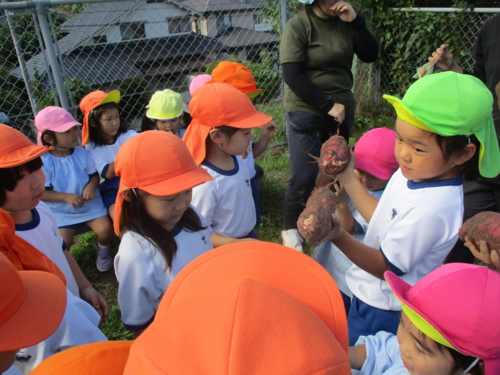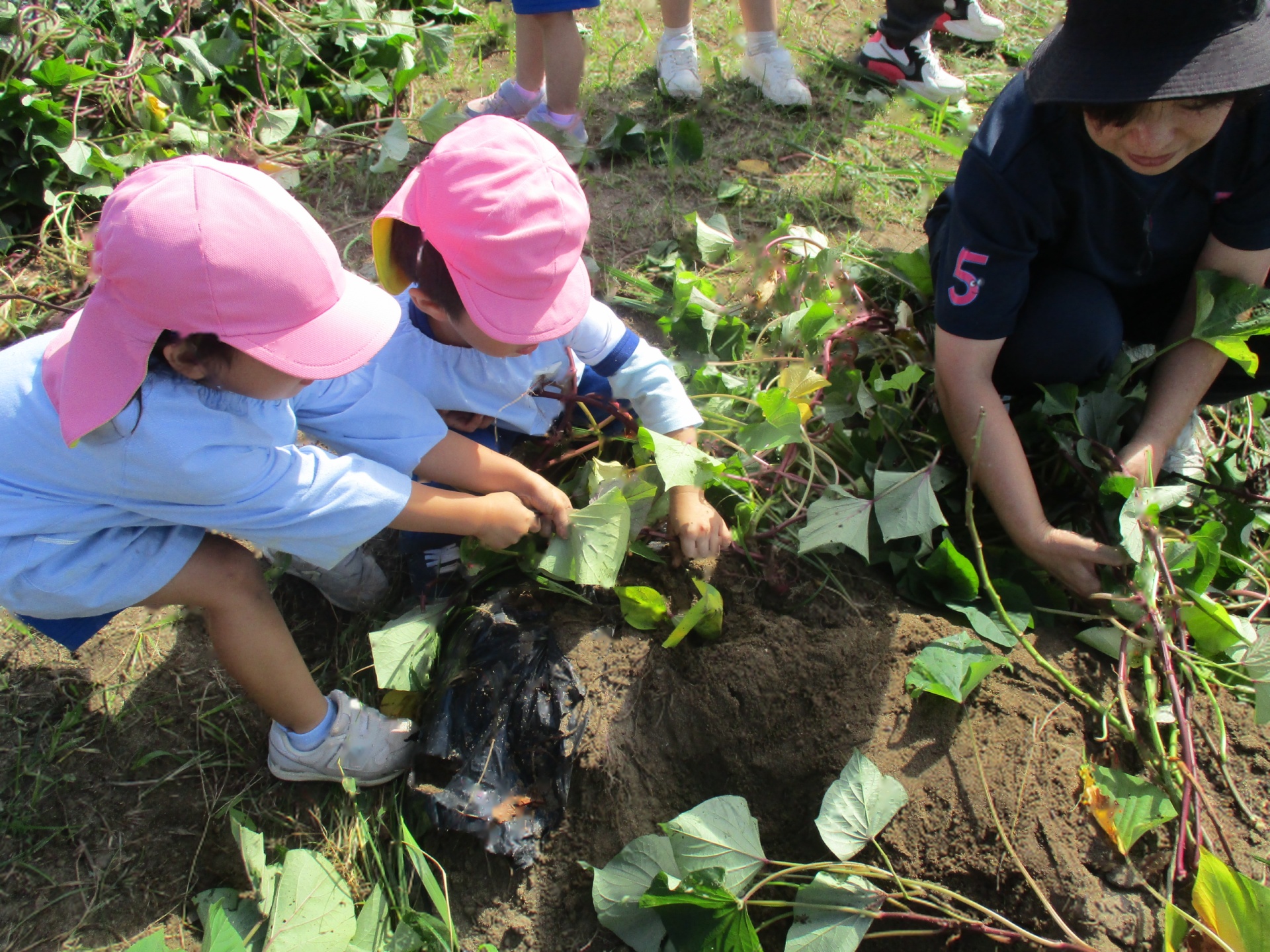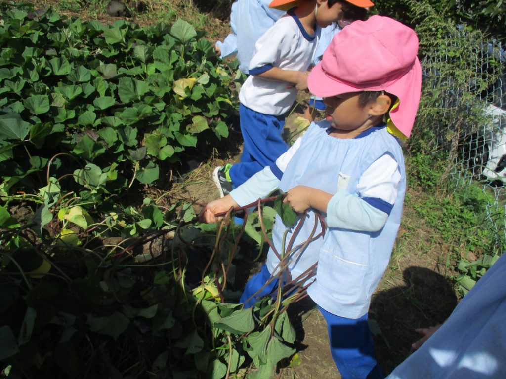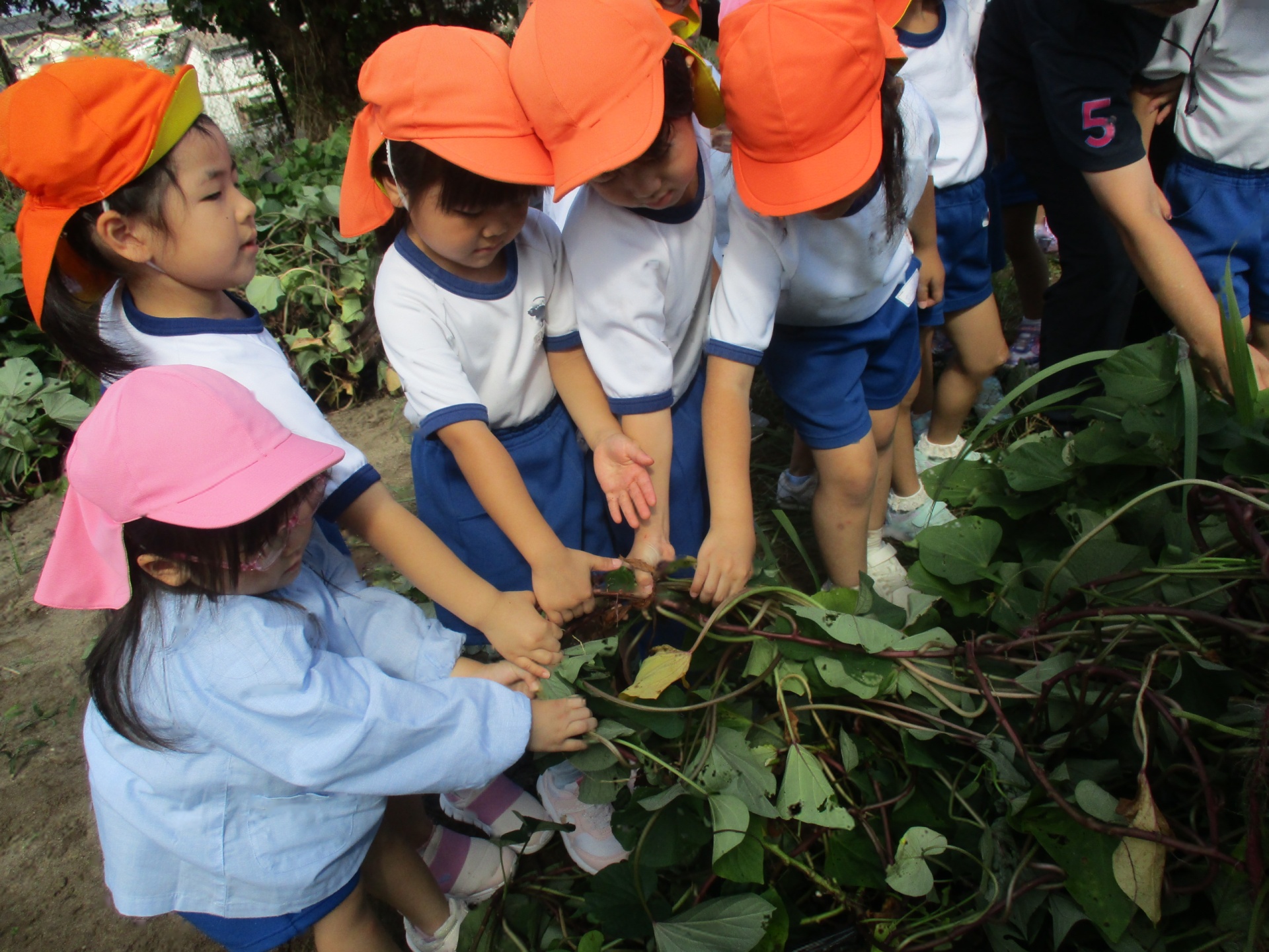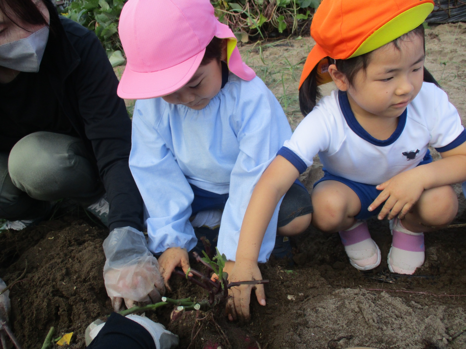 今年も園の畑は、実りの秋!大きな大きなさつまいもが、ぐんぐん育ち、土の中から顔を出していました。そこで、年中組のお兄さんお姉さんと一緒に畑に行き、いもほりの収穫体験!