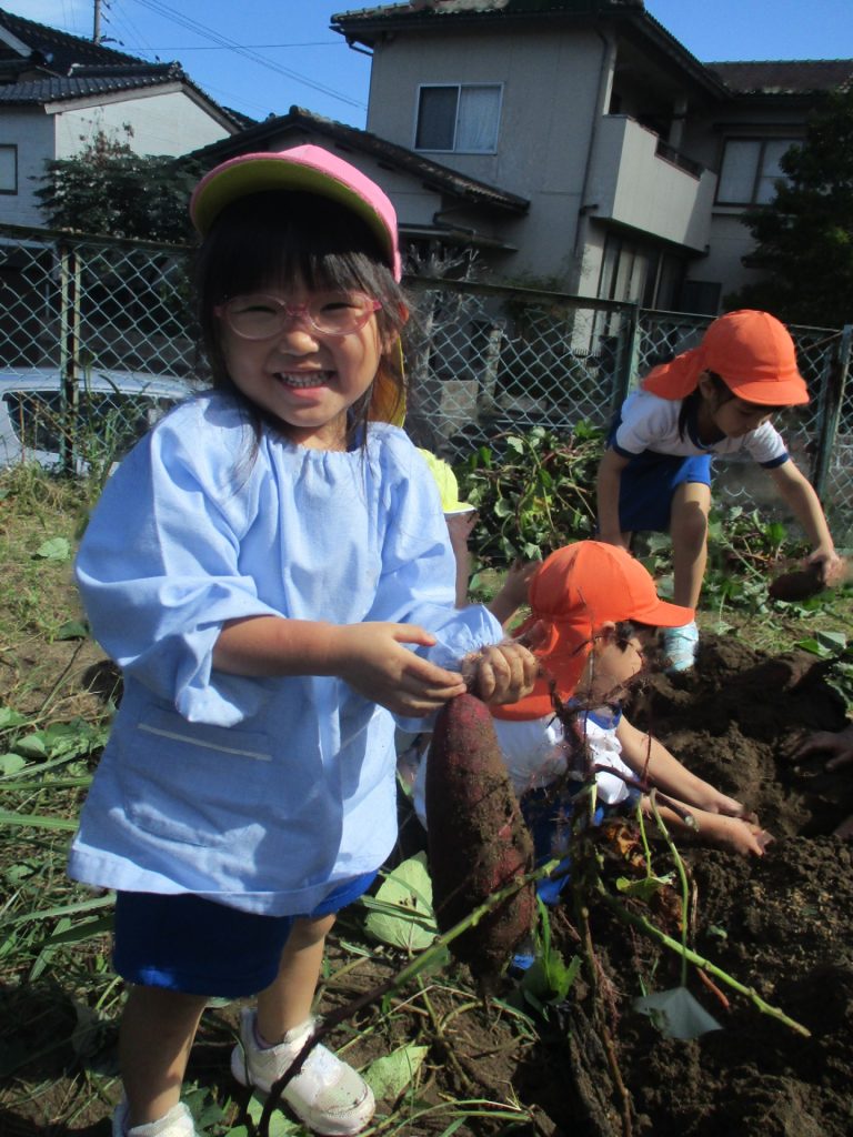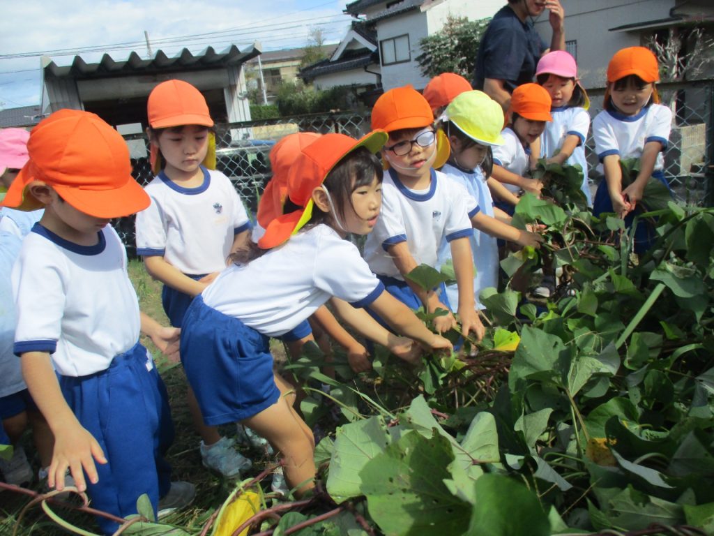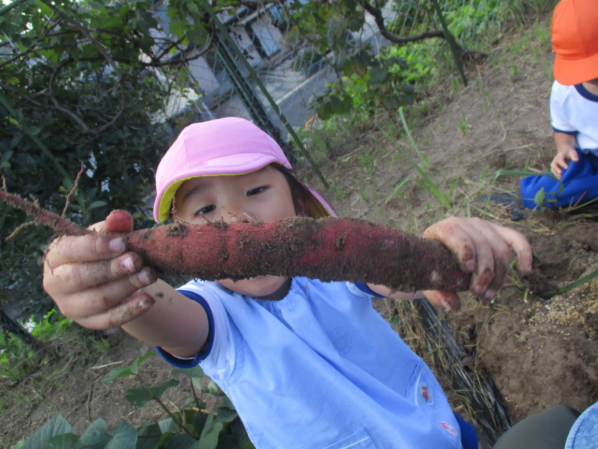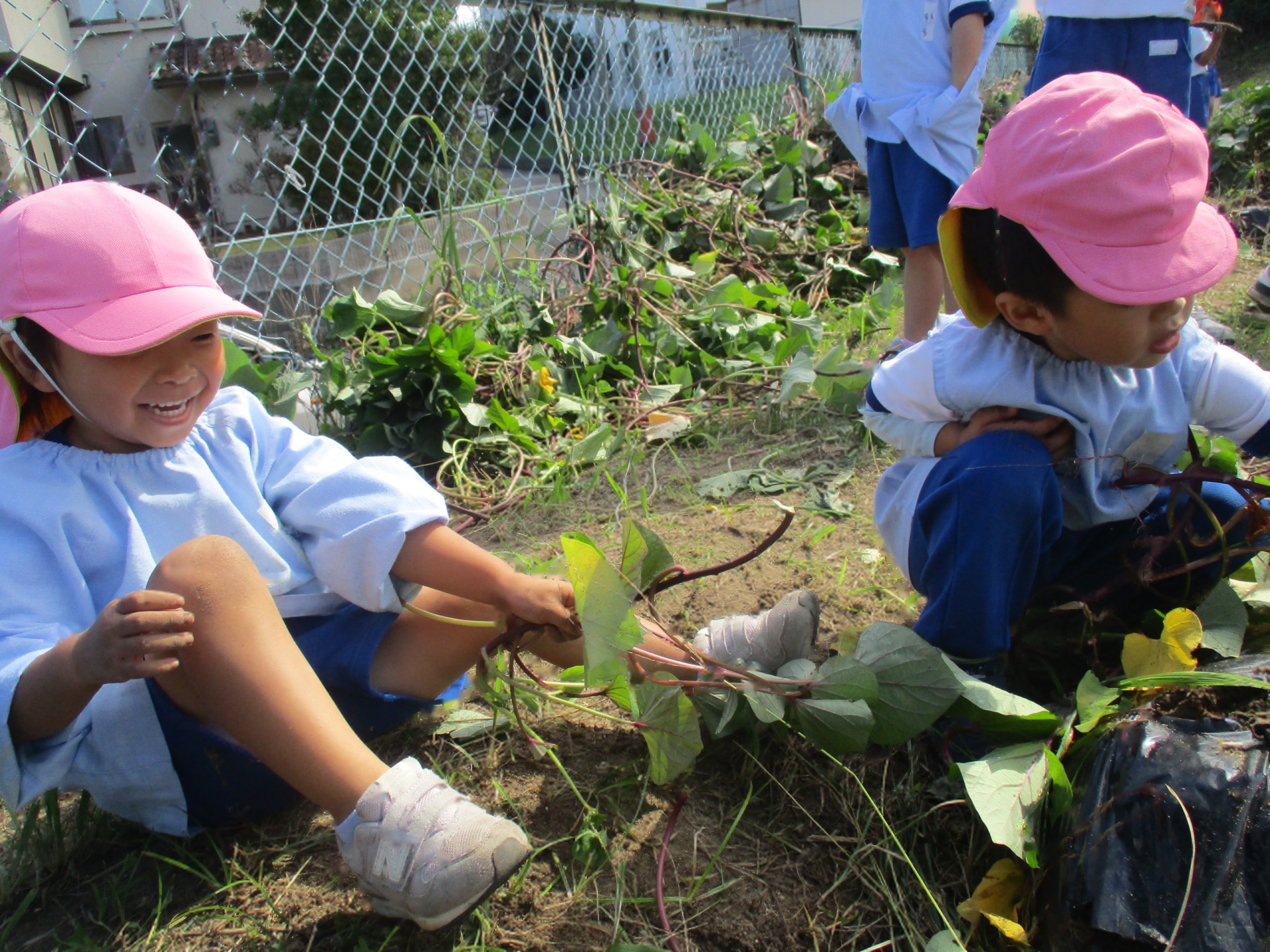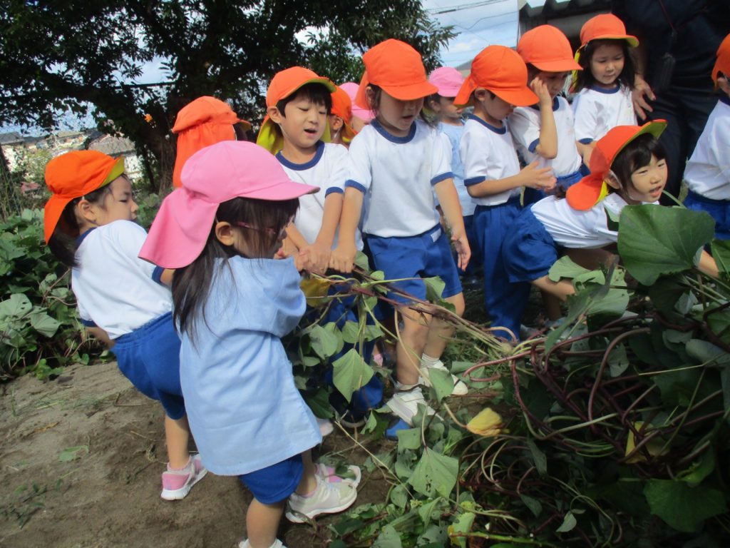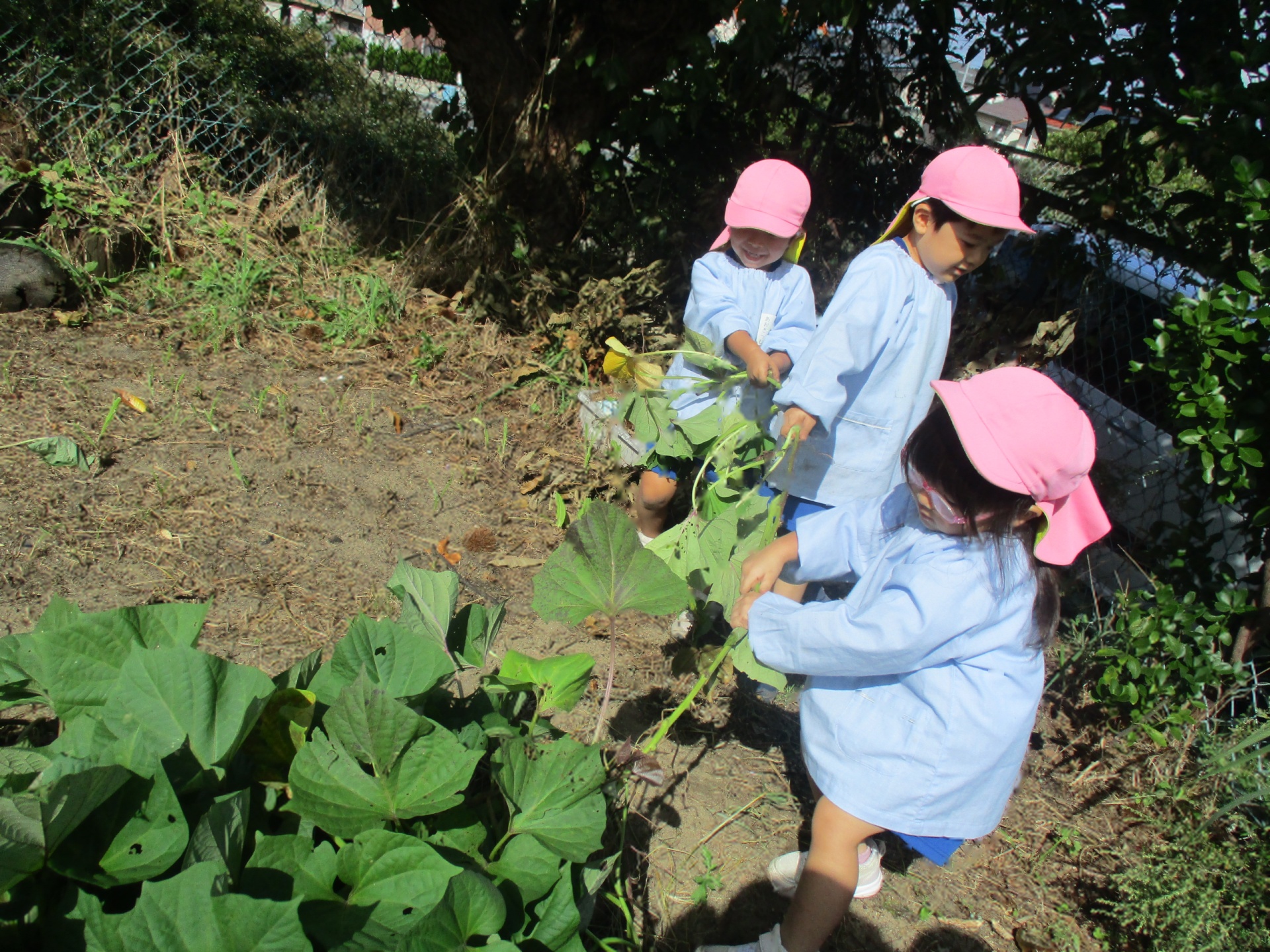 今年も園の畑は、実りの秋!大きな大きなさつまいもが、ぐんぐん育ち、土の中から顔を出していました。そこで、年中組のお兄さんお姉さんと一緒に畑に行き、いもほりの収穫体験!