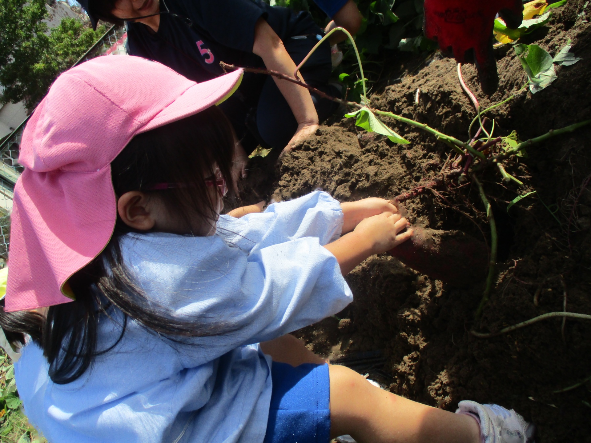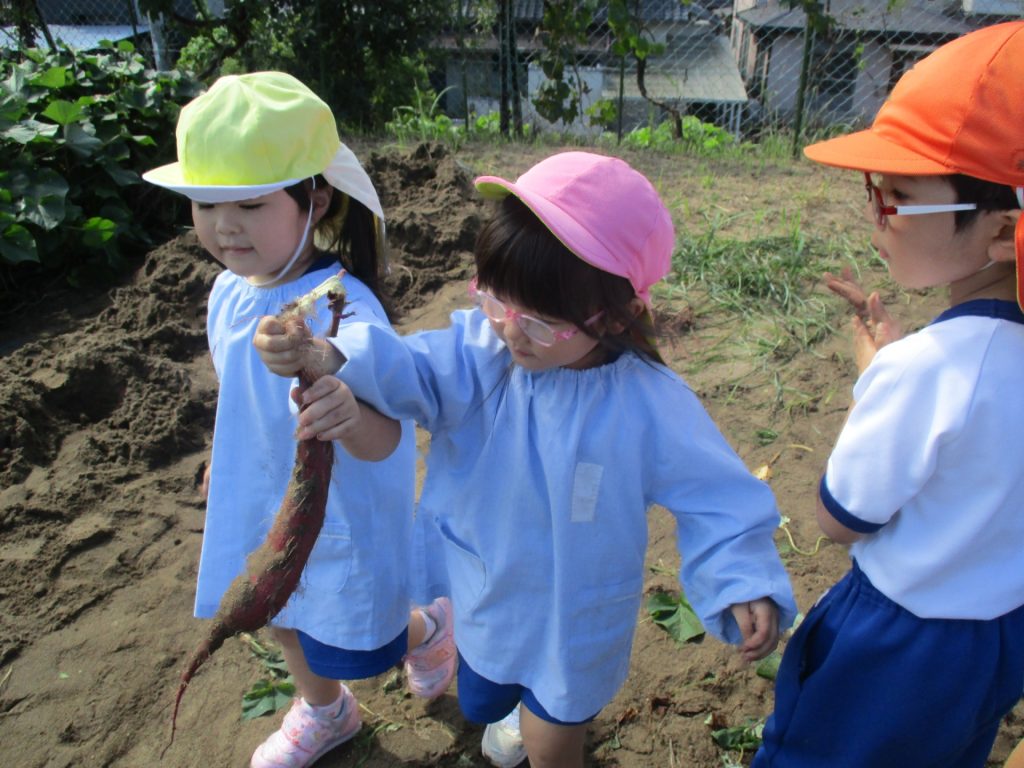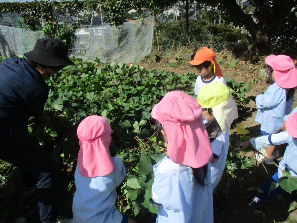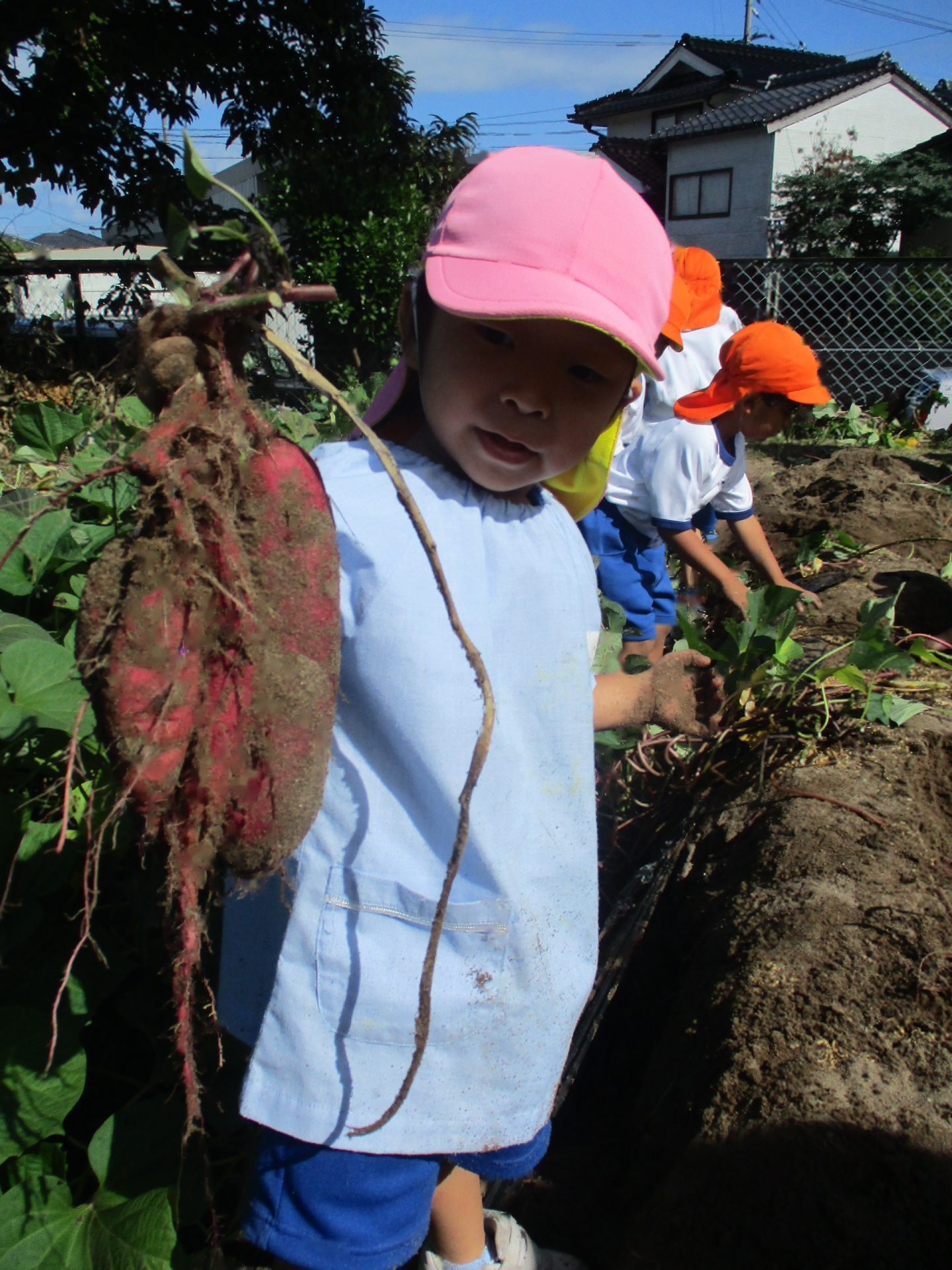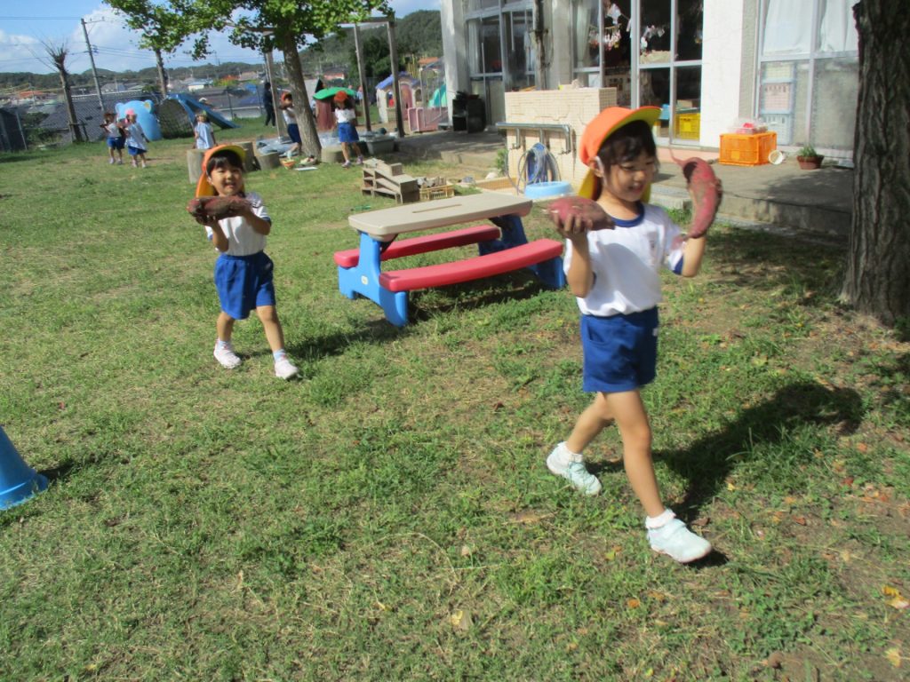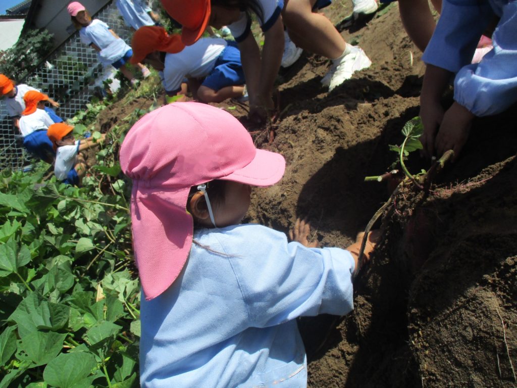 今年も園の畑は、実りの秋!大きな大きなさつまいもが、ぐんぐん育ち、土の中から顔を出していました。そこで、年中組のお兄さんお姉さんと一緒に畑に行き、いもほりの収穫体験!
