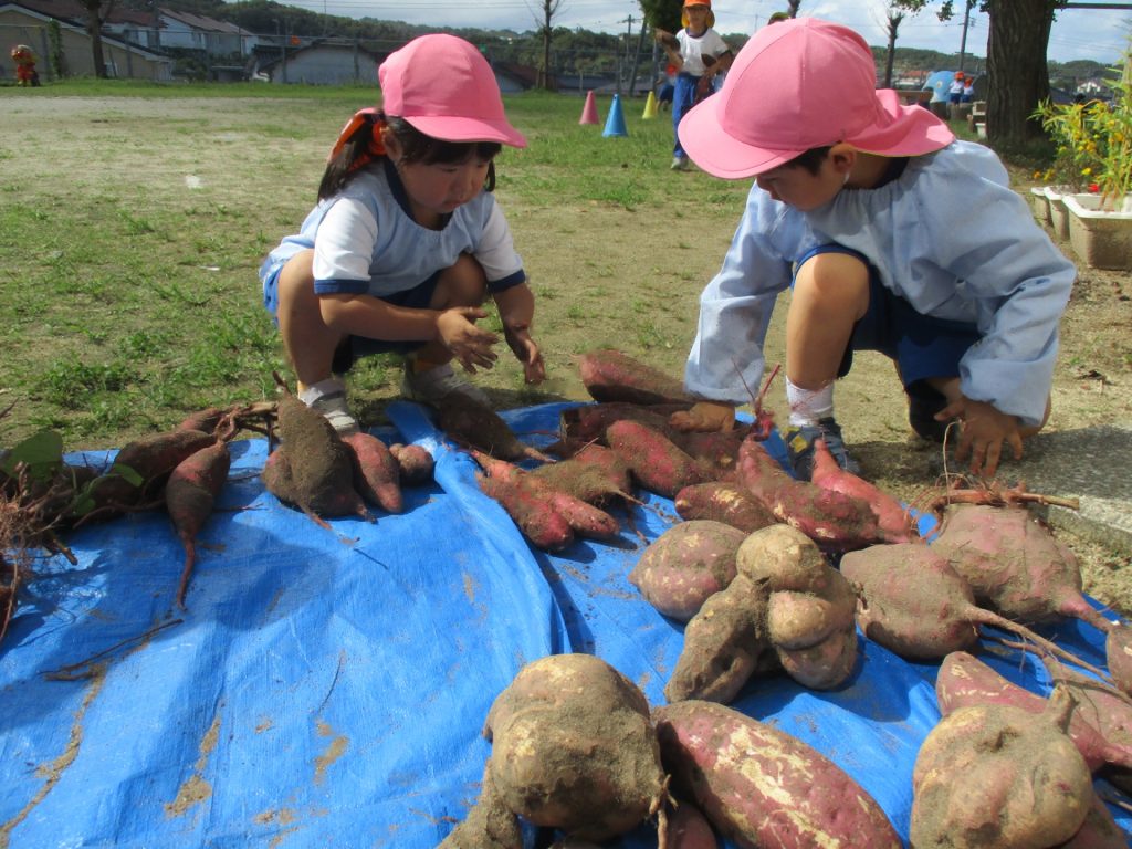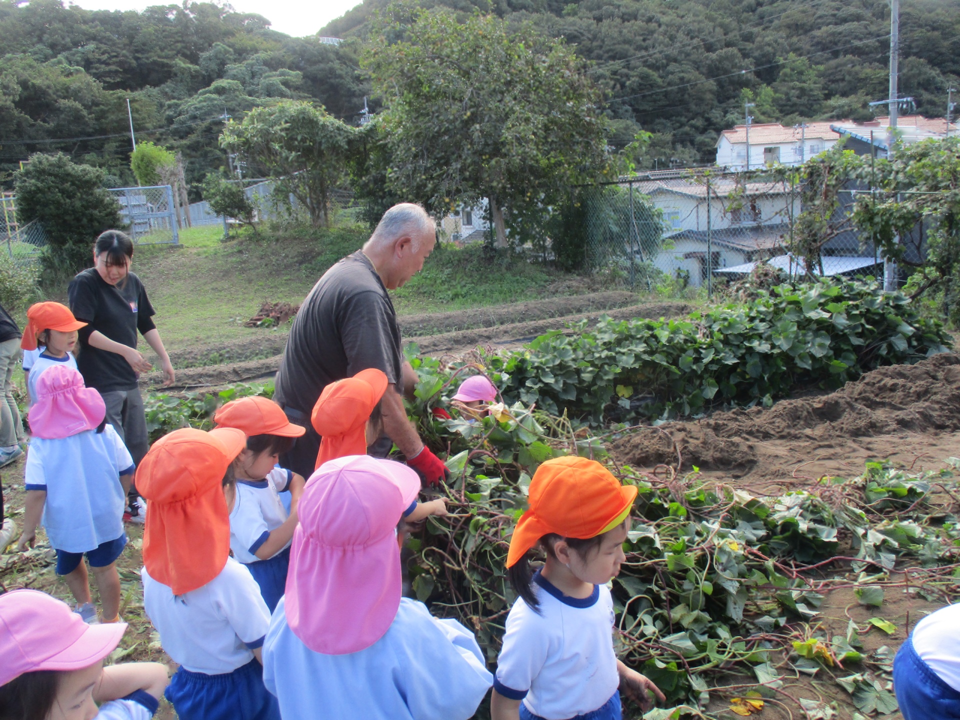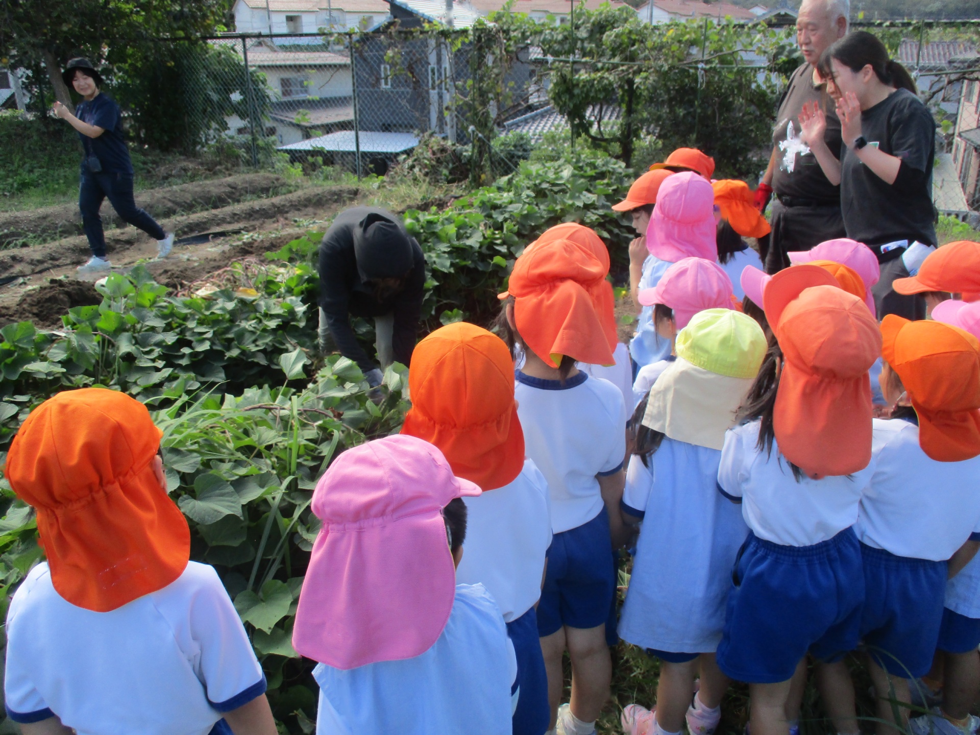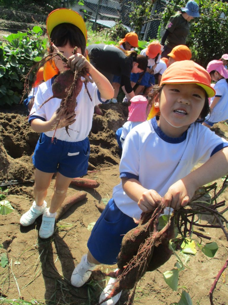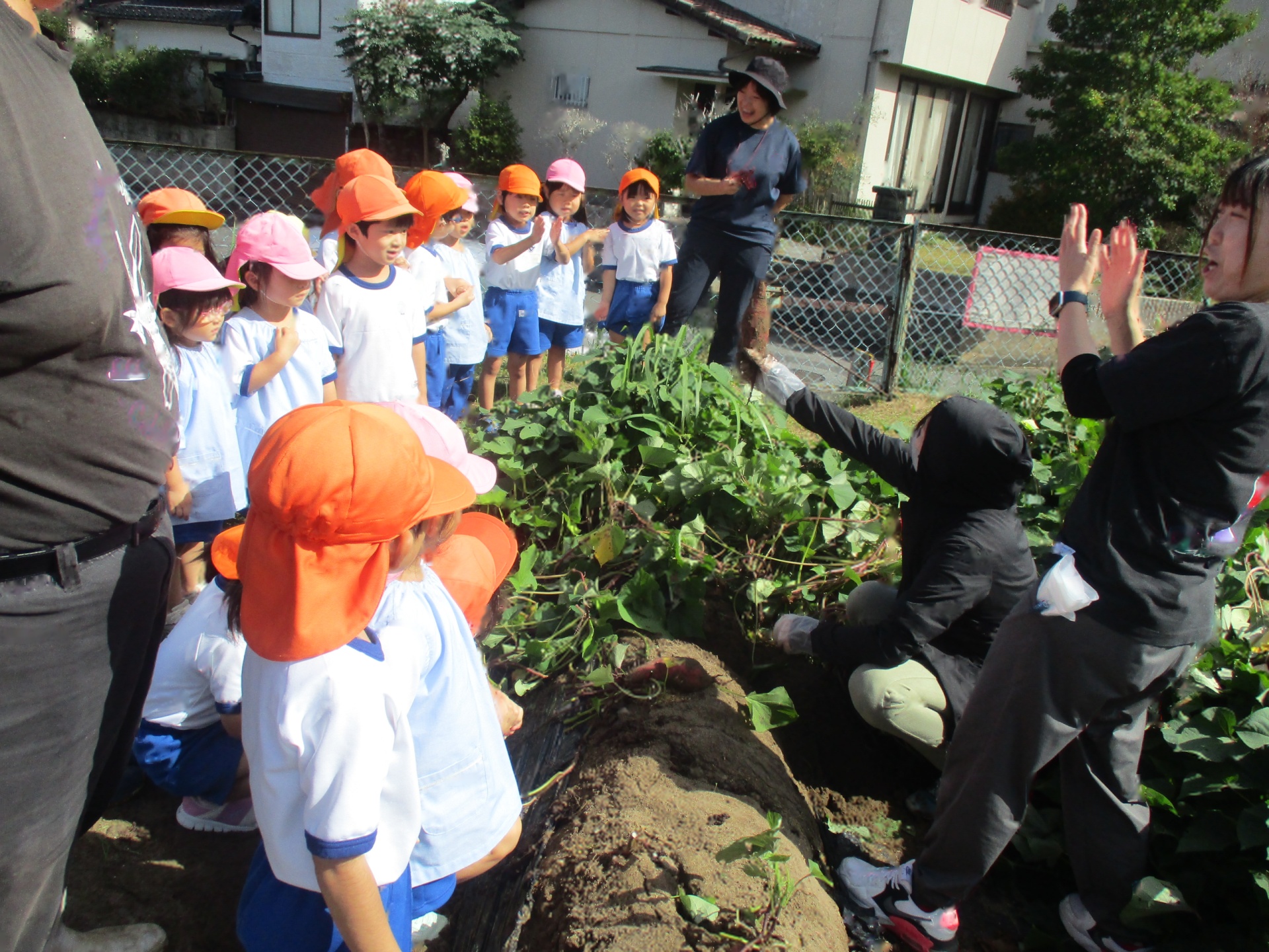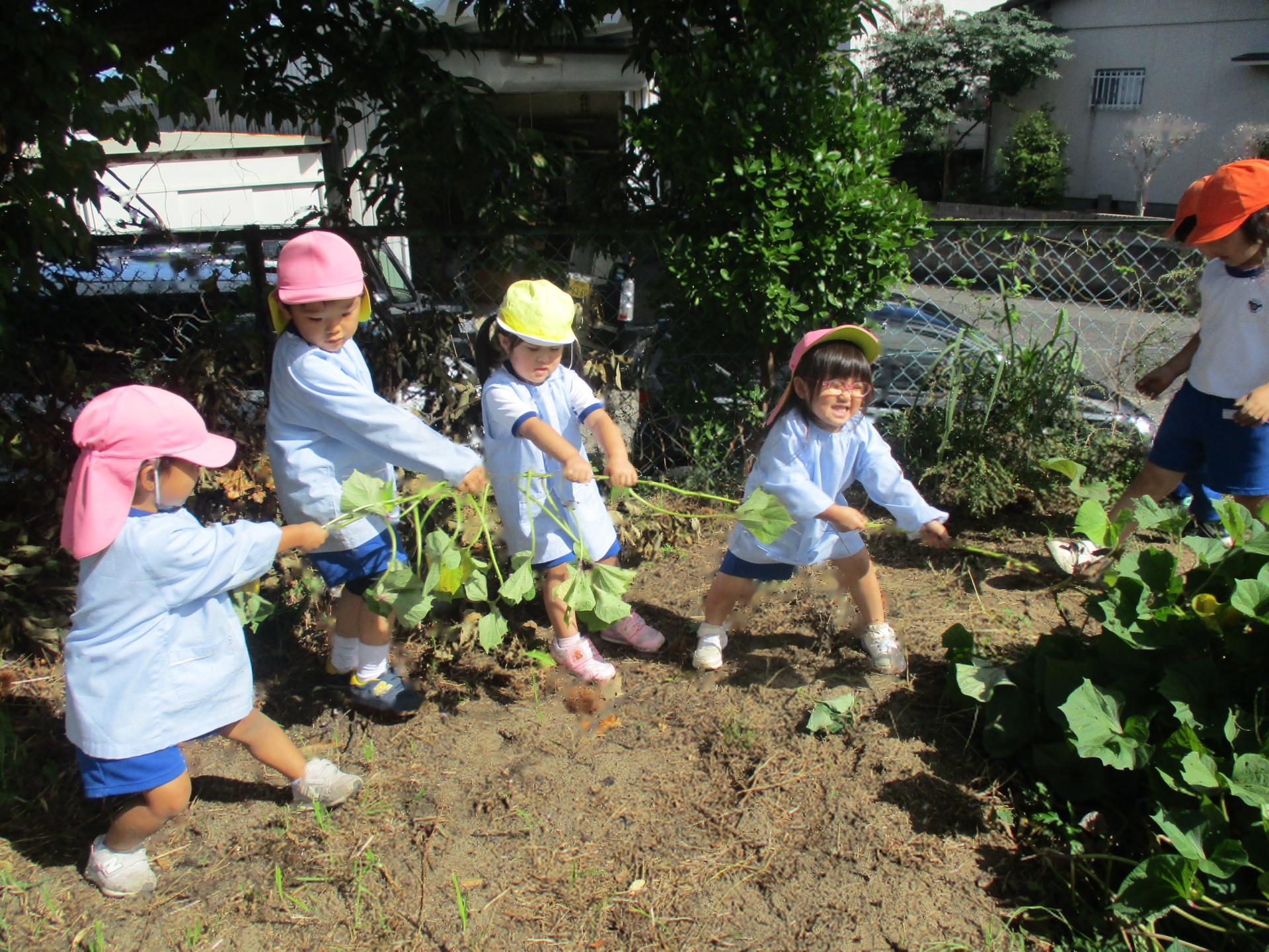 今年も園の畑は、実りの秋!大きな大きなさつまいもが、ぐんぐん育ち、土の中から顔を出していました。そこで、年中組のお兄さんお姉さんと一緒に畑に行き、いもほりの収穫体験!