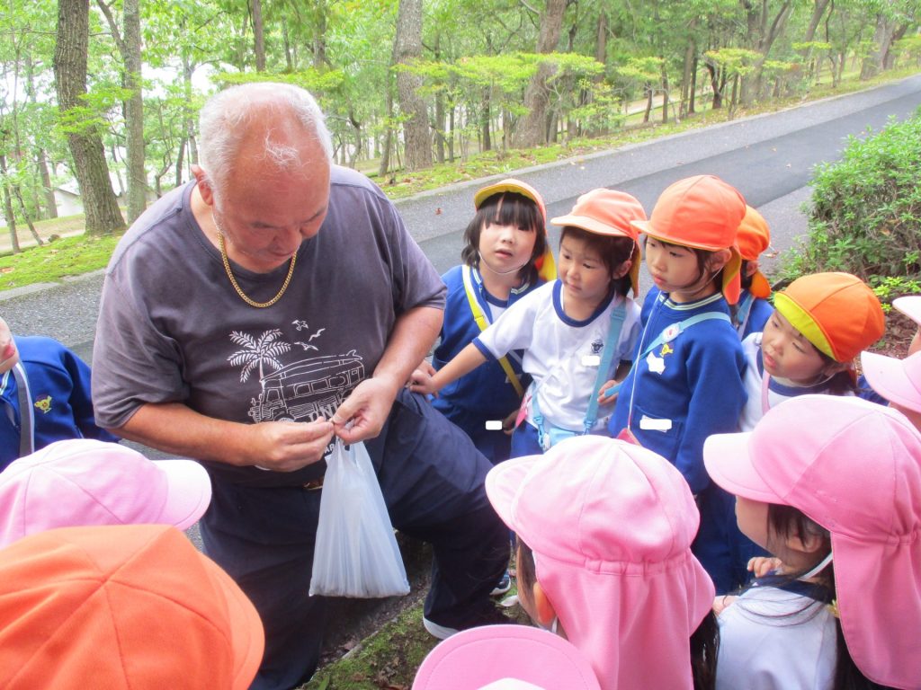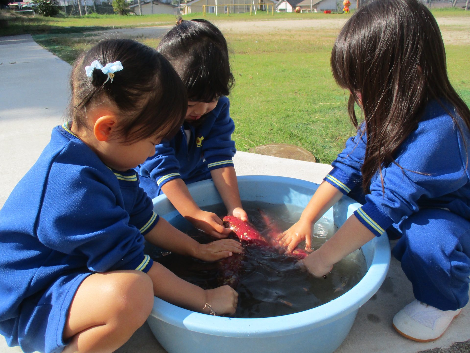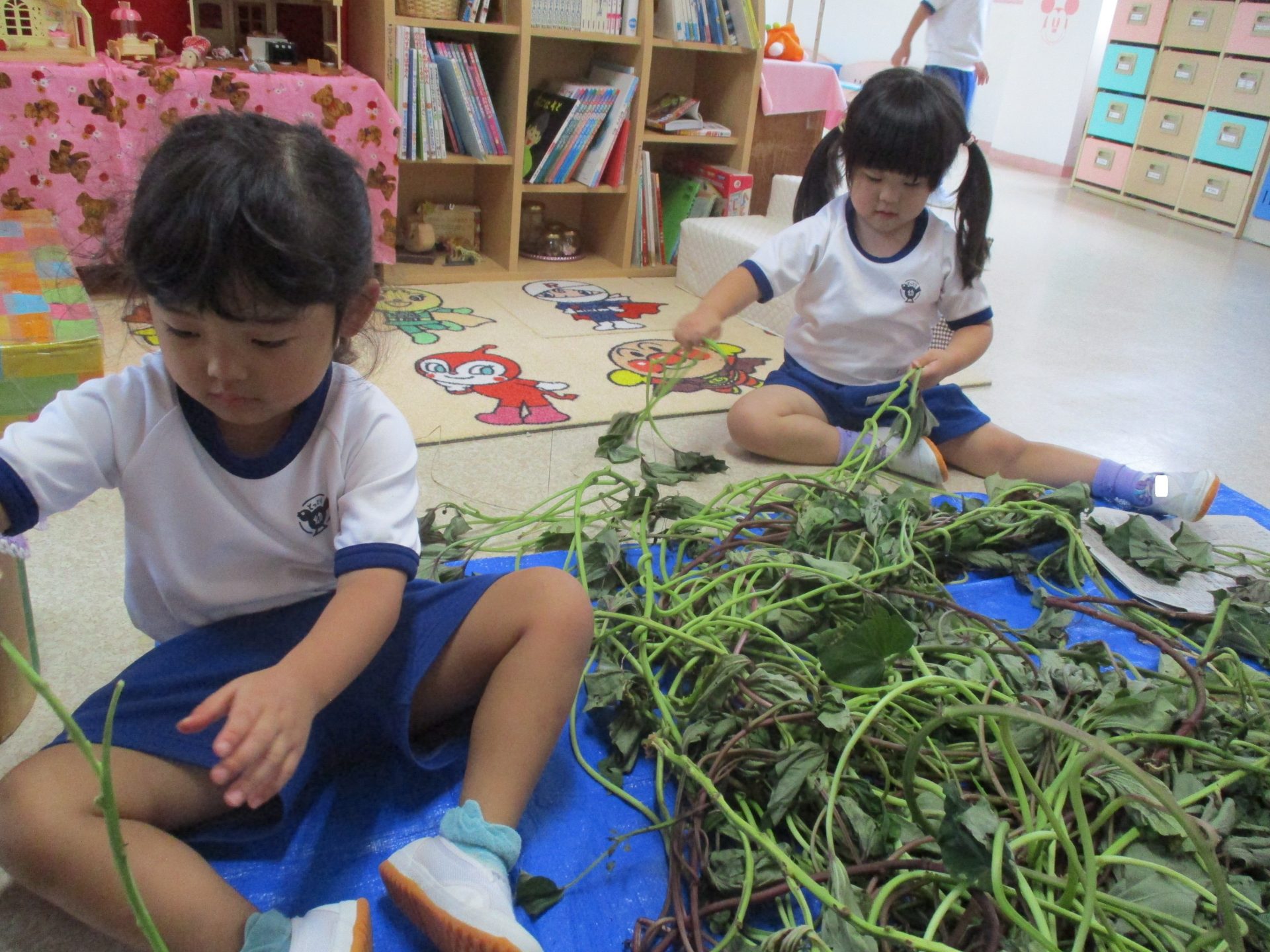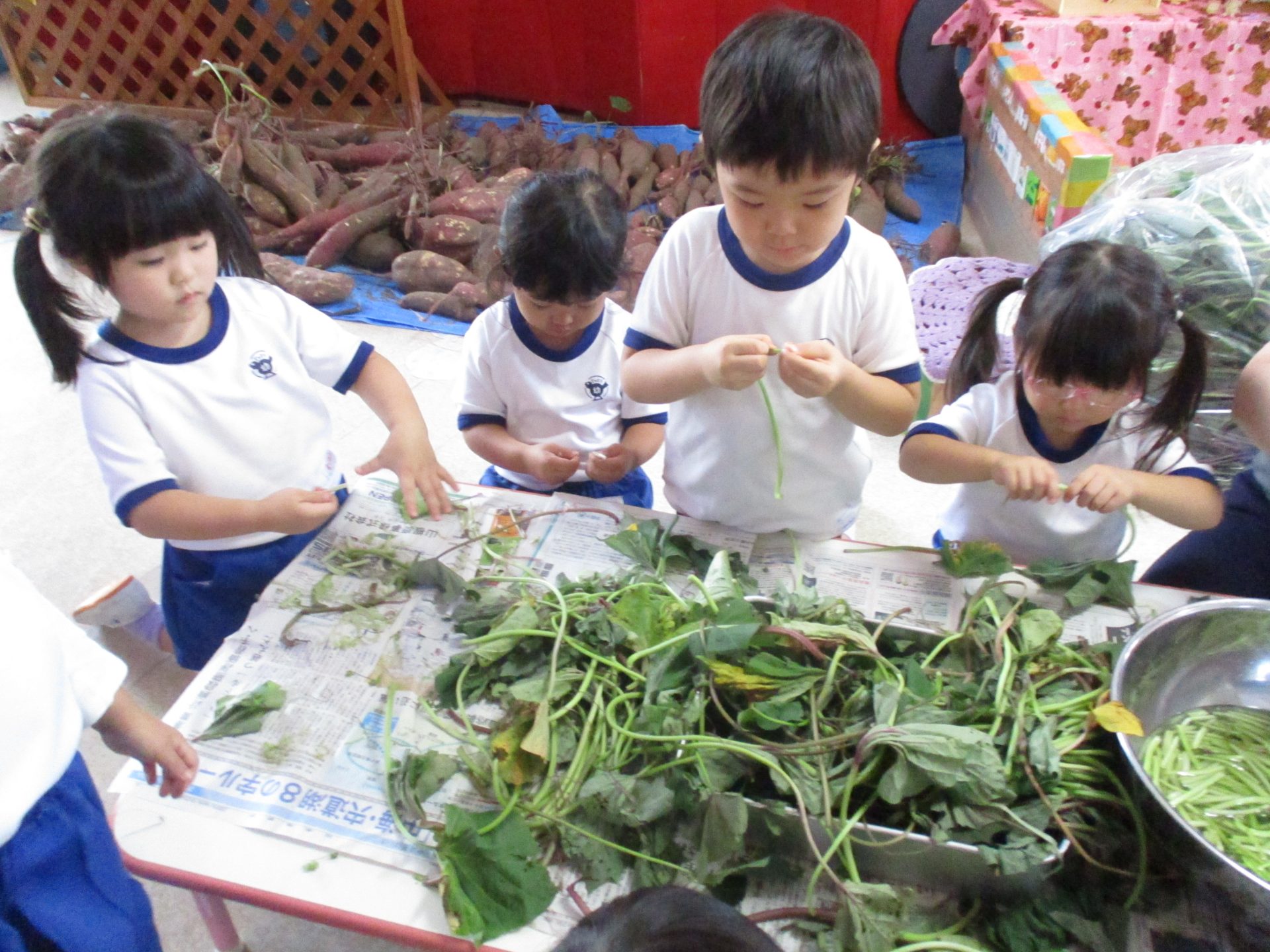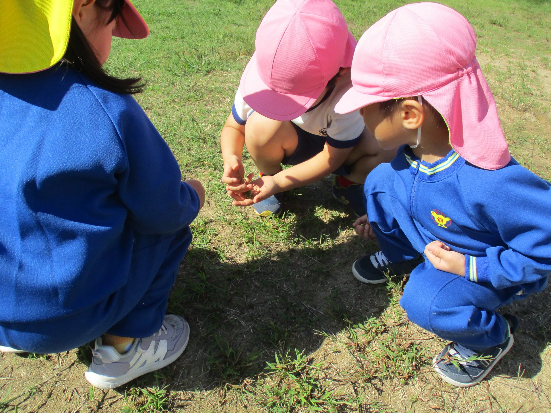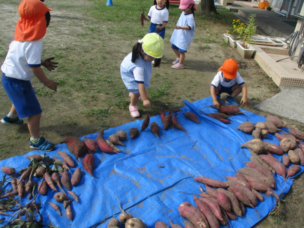 今年も園の畑は、実りの秋!大きな大きなさつまいもが、ぐんぐん育ち、土の中から顔を出していました。そこで、年中組のお兄さんお姉さんと一緒に畑に行き、いもほりの収穫体験!