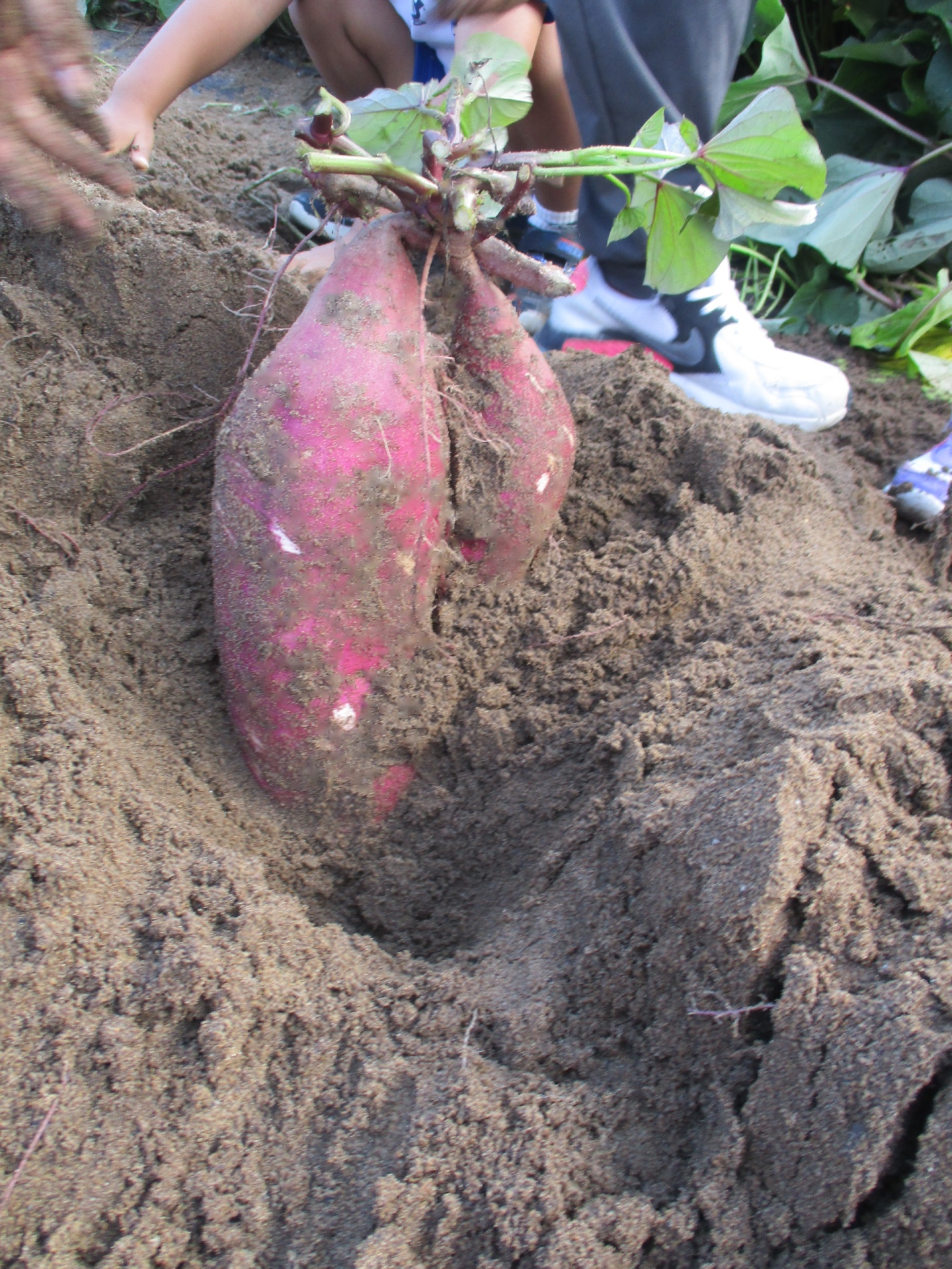 「こんなサツマイモが掘れたよ!」と大きなさつまいもを見て期待も膨らみます!