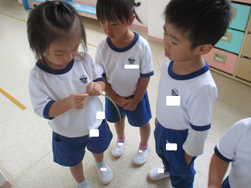 「わらいんぼコスモスだ~♡」と、お部屋で歌っている歌を思い出しながら喜ぶ子ども達♪じっくり見ていく中で、花びらの色の違いや色味などに気づきお友達と教え合っていました。さらに顔を近づけて見ていると…「いちごの匂いがする!」とほんわか香る匂いがあることを発見!「私も嗅ぎたい!」「本当だあ」とみんなでしばらく見入っていました。(顔を近づけてやっと嗅ぎ取れるほどほんのりとした香りですが、優しい甘さのある香りがしましたよ)