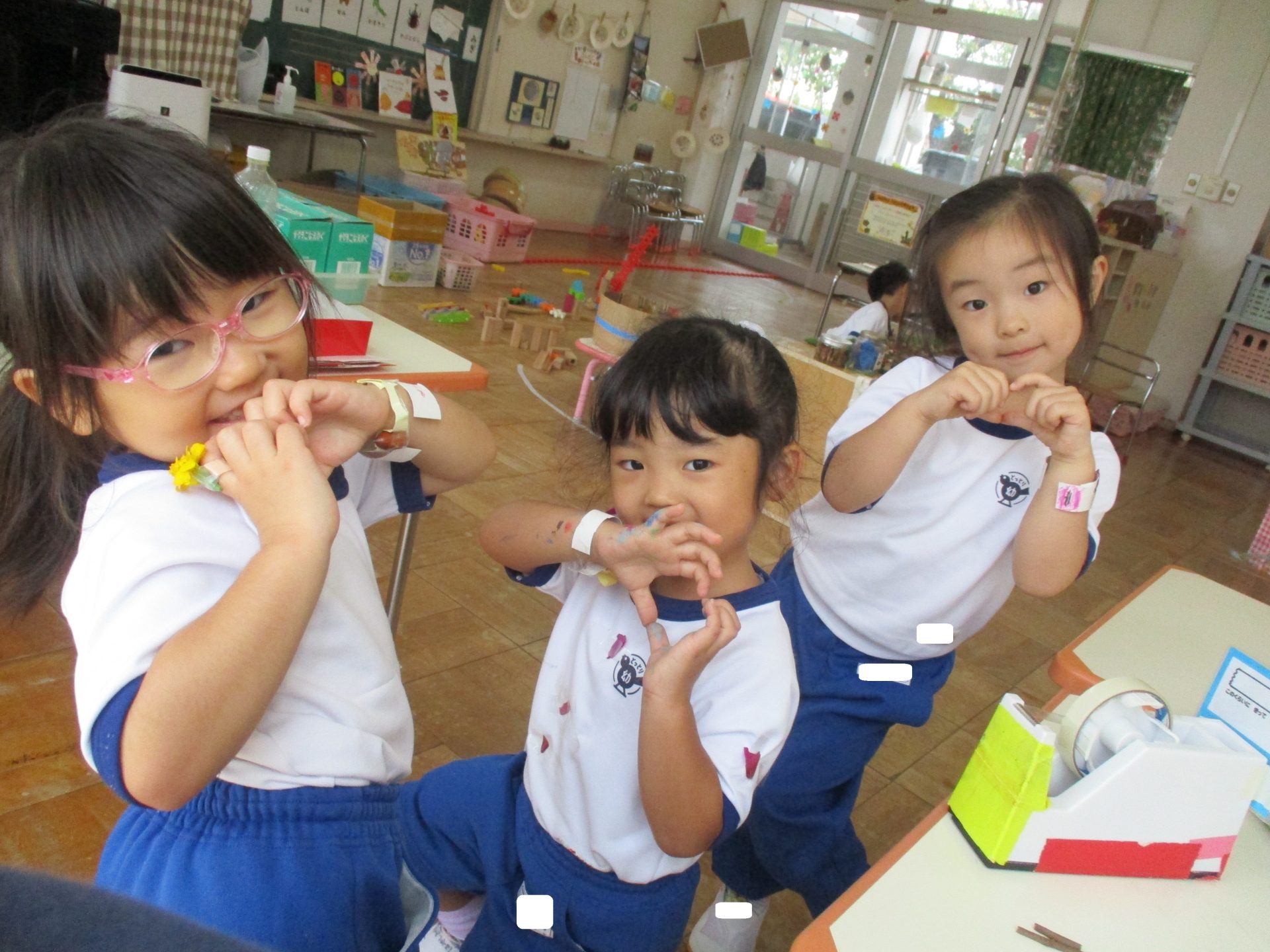 テラスでは、コスモスを使ってみんな大好きな色水遊びを楽しみました。