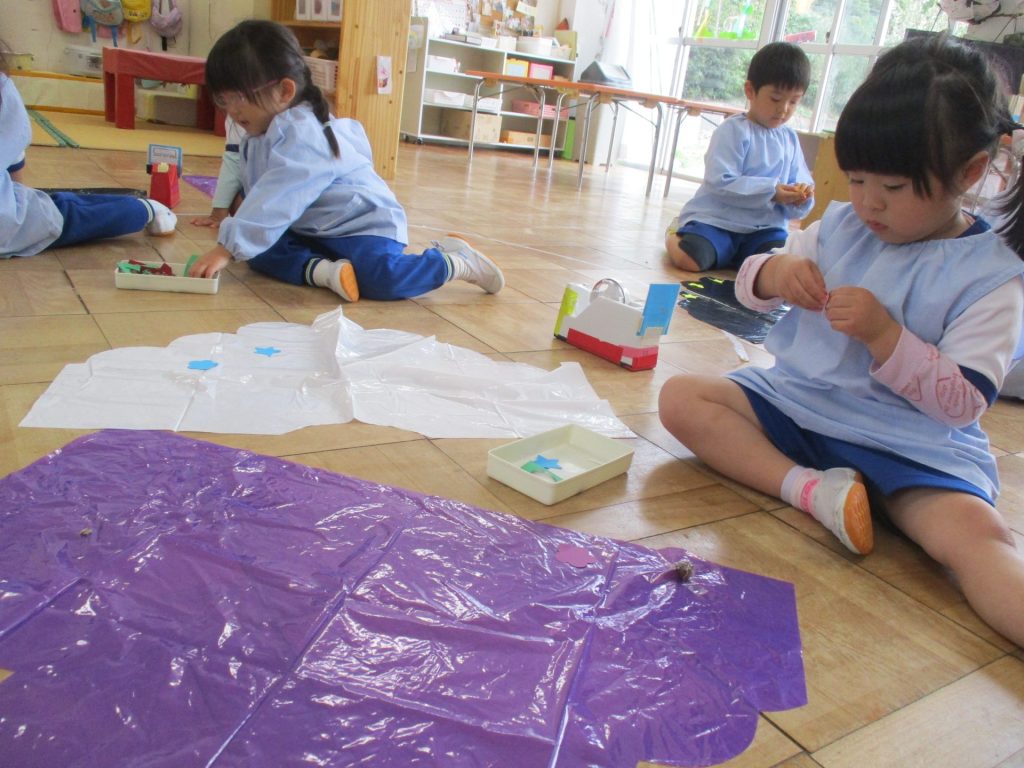 そこで、みんなでコスモスの制作を楽しみました。障子紙を絵具につけたり、スポイトで垂らしたりと、色々な方法で絵具が滲む様子を楽しみました。