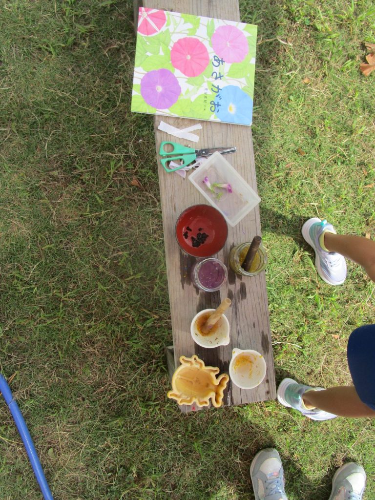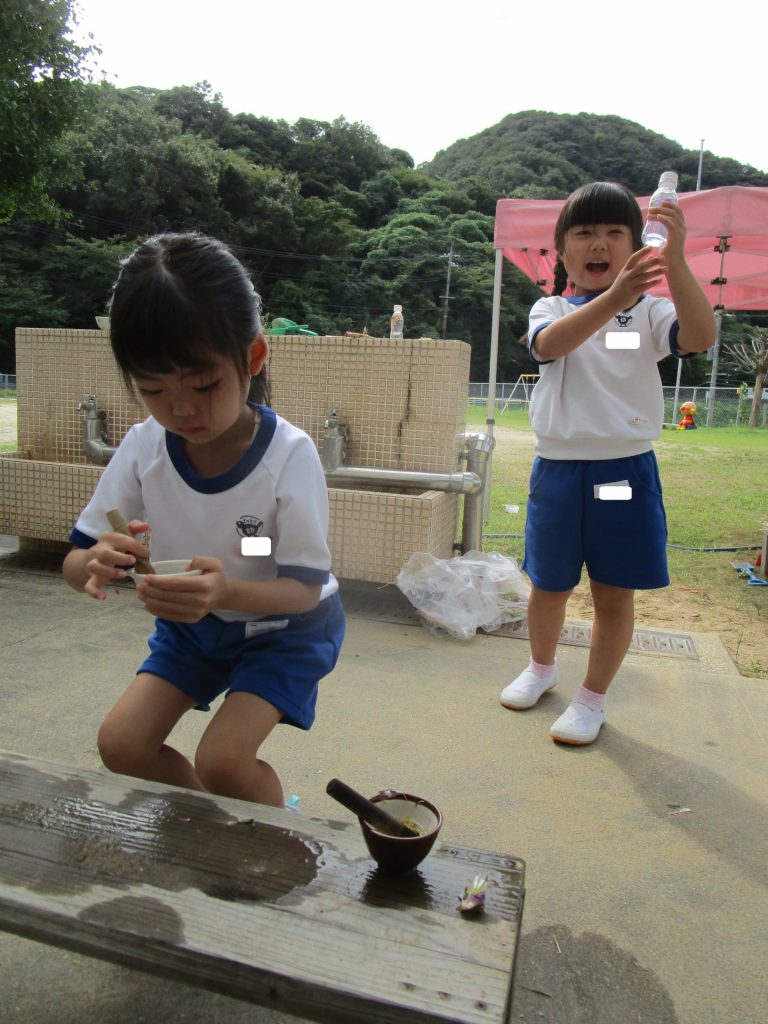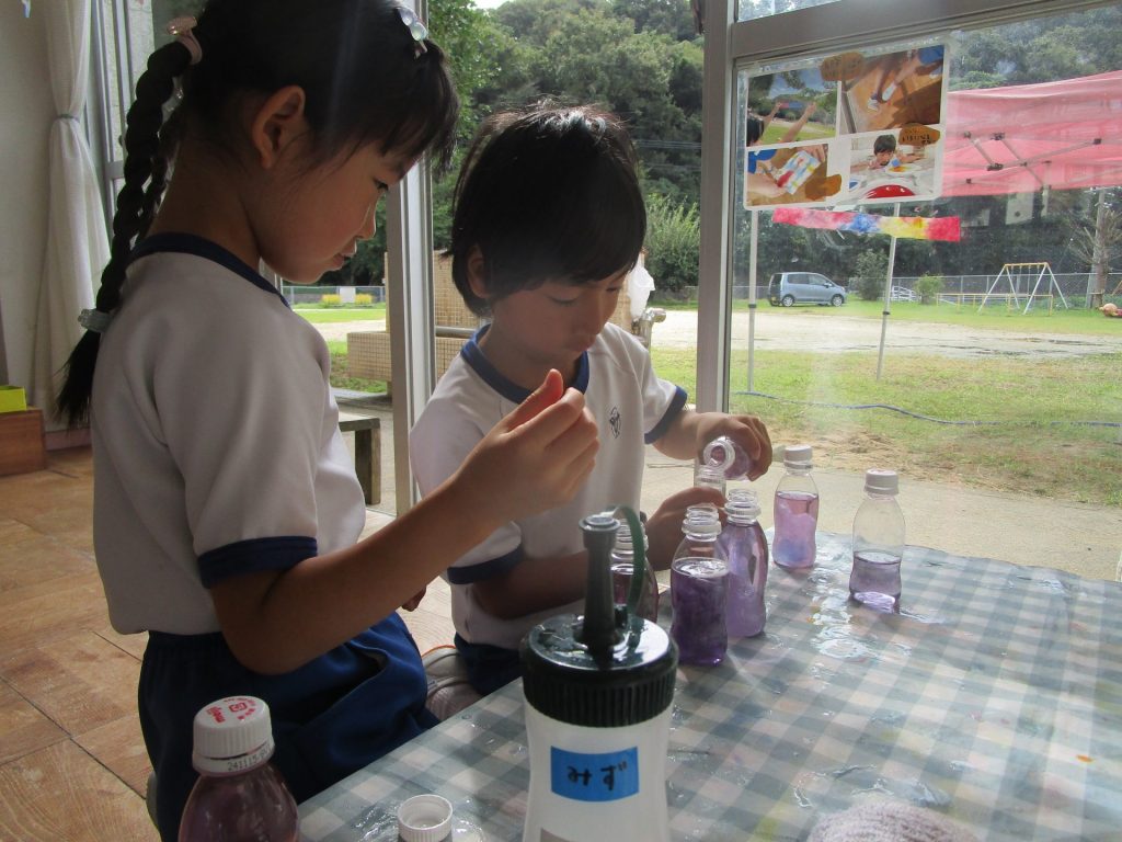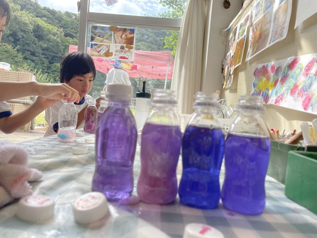 運動会の親子競技で色水あそびを楽しんだあと・・またまた色水を楽しむ子ども達。1学期から長い期間楽しんでいる『いろ』・・・混ぜたりしながら色味の違いを楽しんでいました。