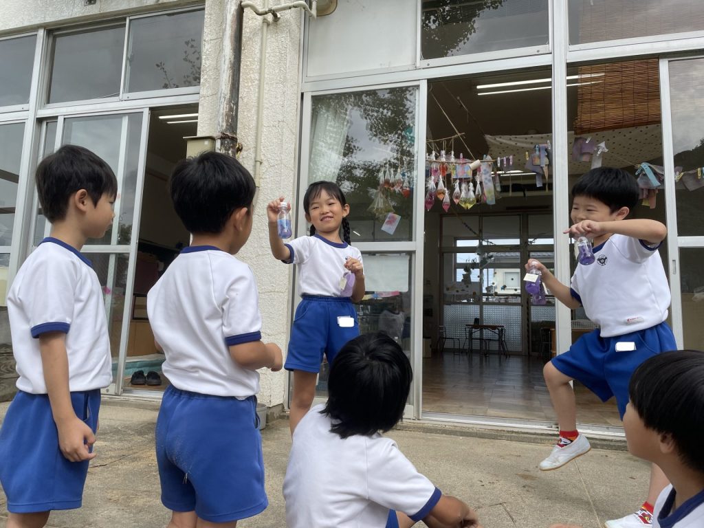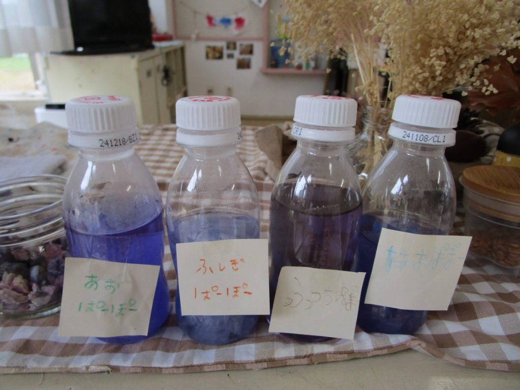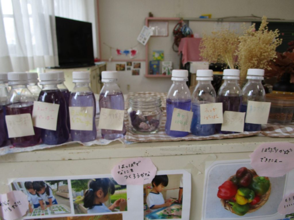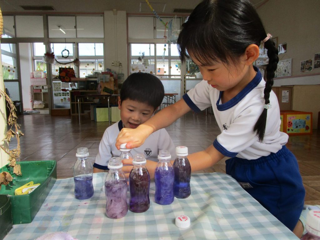 この日の朝の「おはよう」の時間に、できた色水を紹介してくれました。のりのりです。