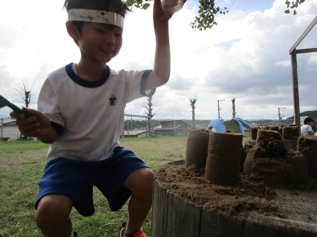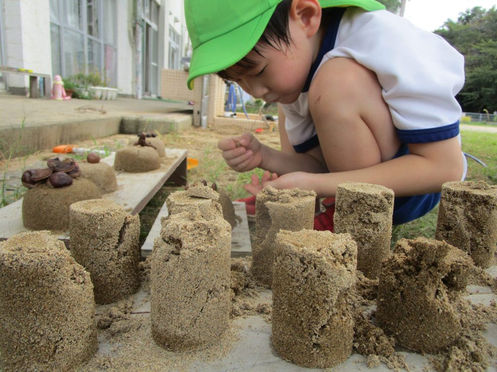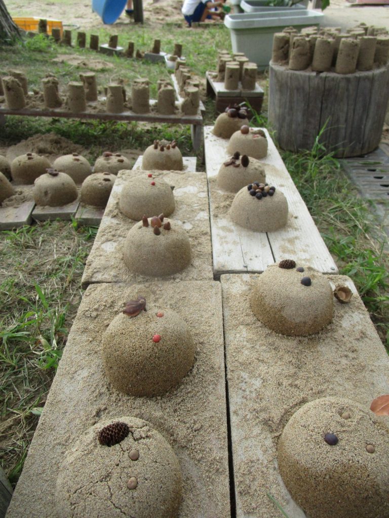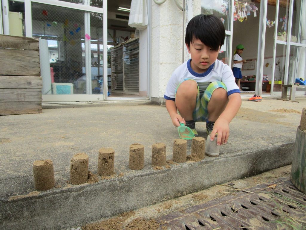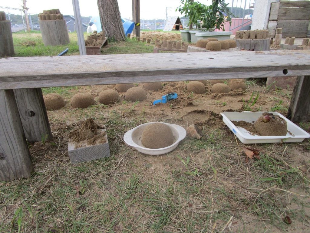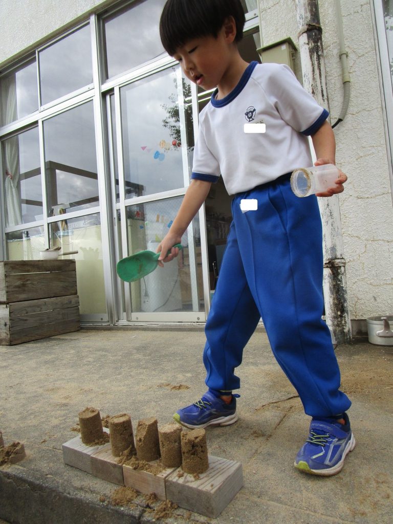 スコップの上に逆さにしたコップを置き・・滑らせて面に置き型を抜く・・・遊びの中で崩れず形を作る方法を見つけたようです。すごい・・・☆!!
