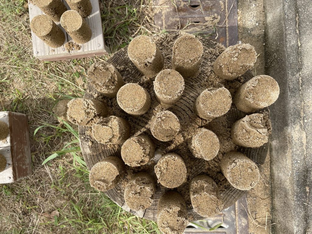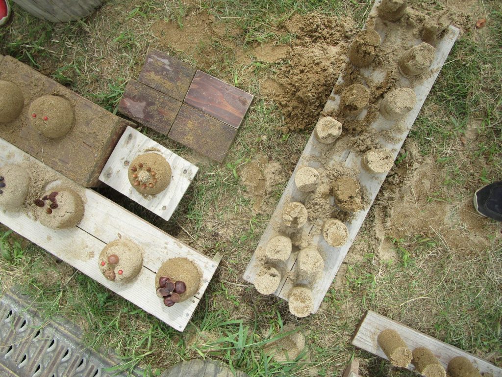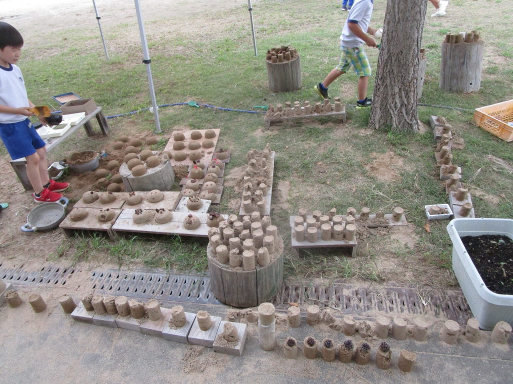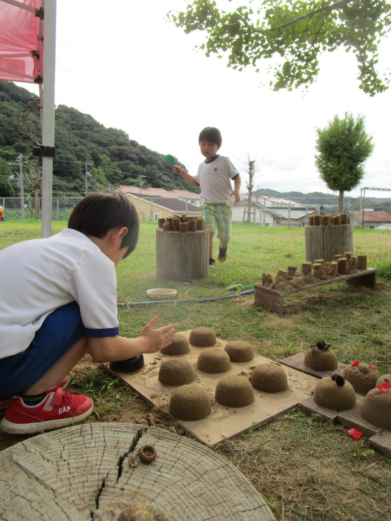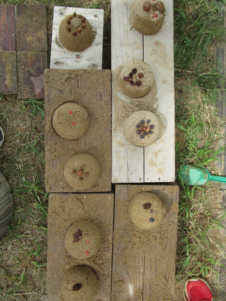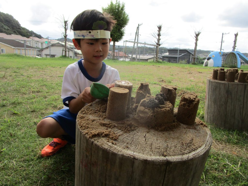 スコップの上に逆さにしたコップを置き・・滑らせて面に置き型を抜く・・・遊びの中で崩れず形を作る方法を見つけたようです。すごい・・・☆!!