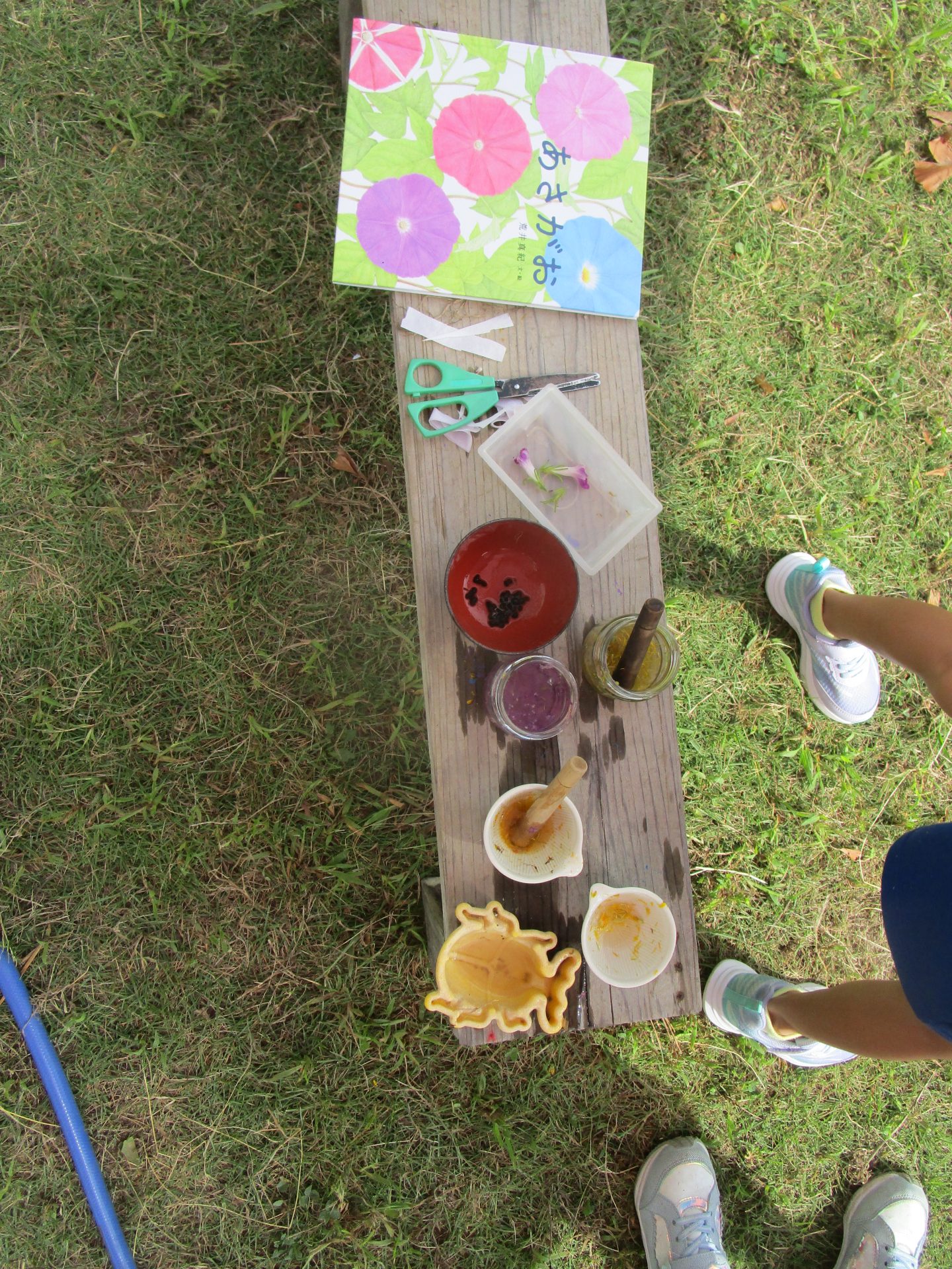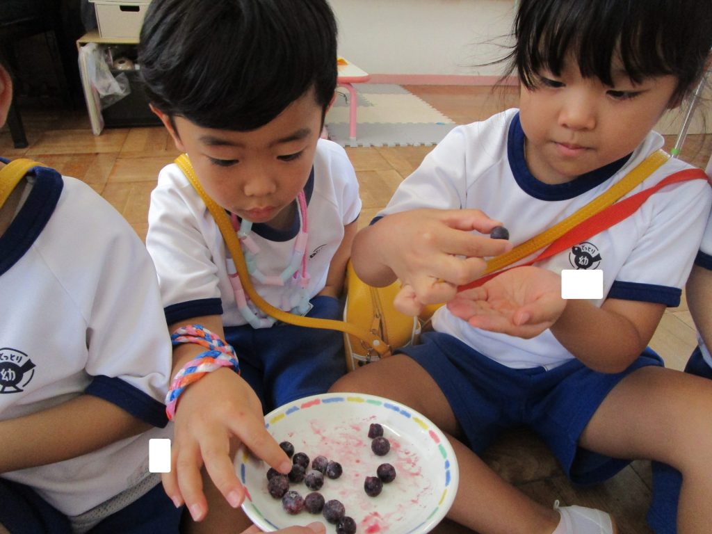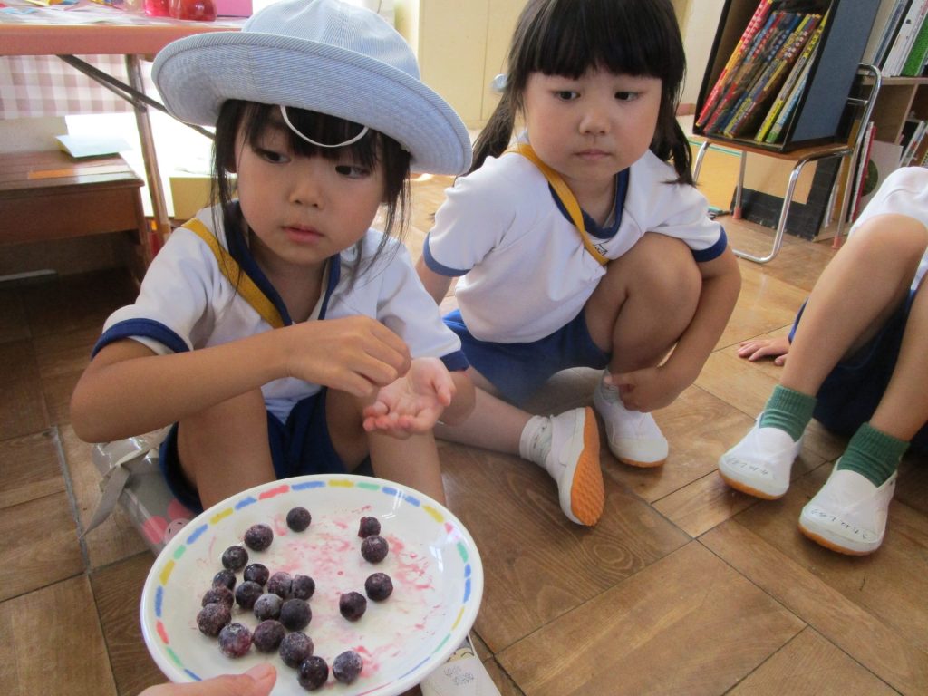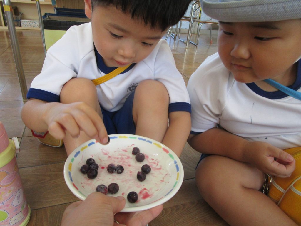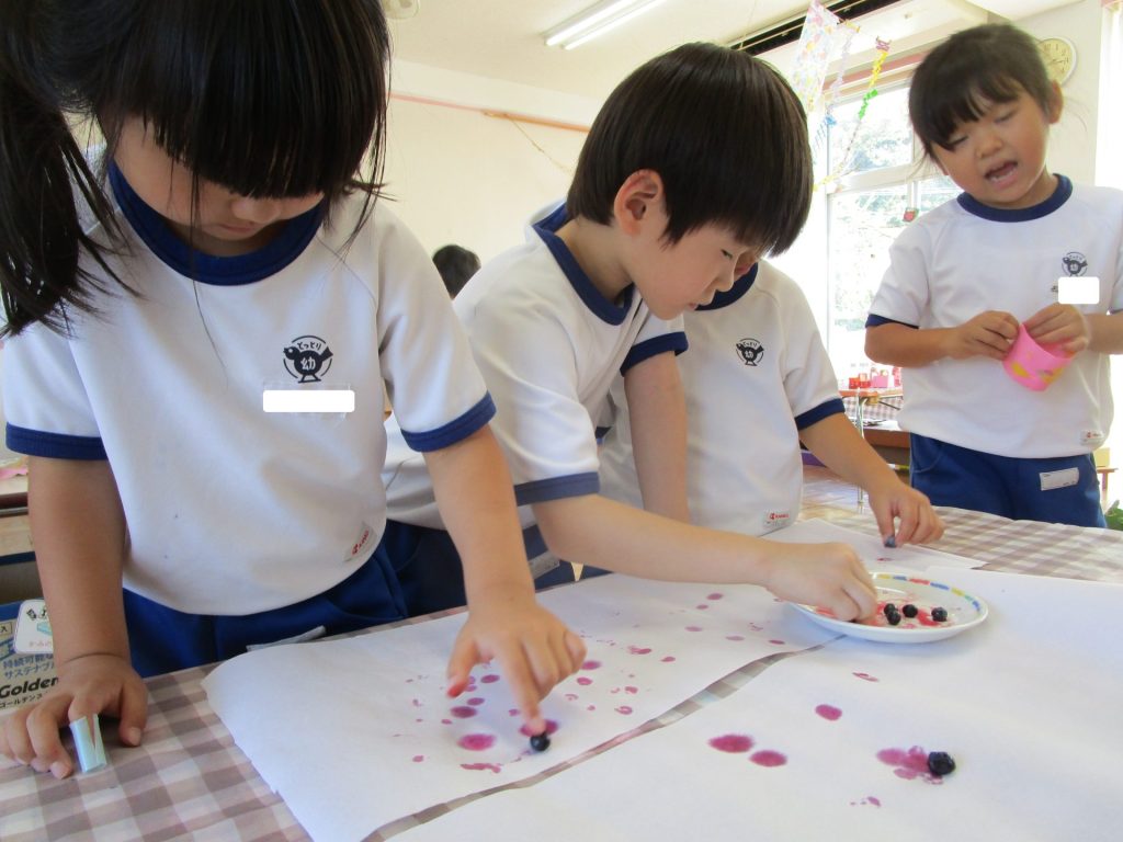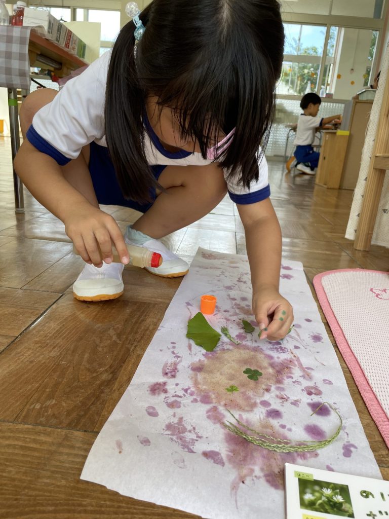 運動会の親子競技で色水あそびを楽しんだあと・・またまた色水を楽しむ子ども達。1学期から長い期間楽しんでいる『いろ』・・・混ぜたりしながら色味の違いを楽しんでいました。