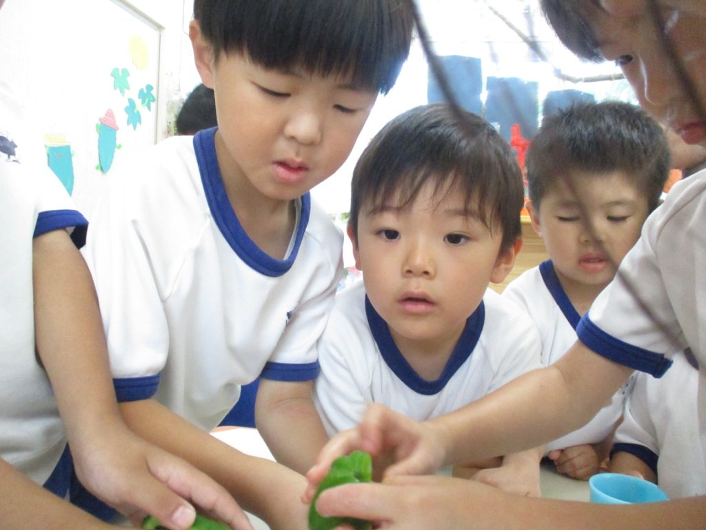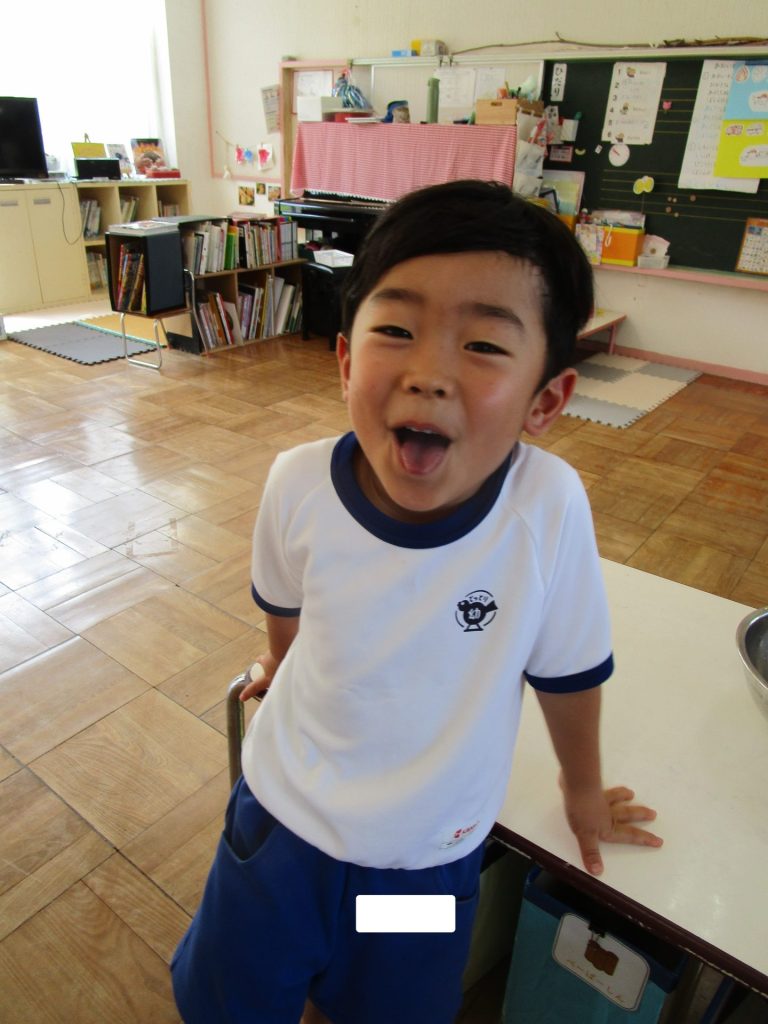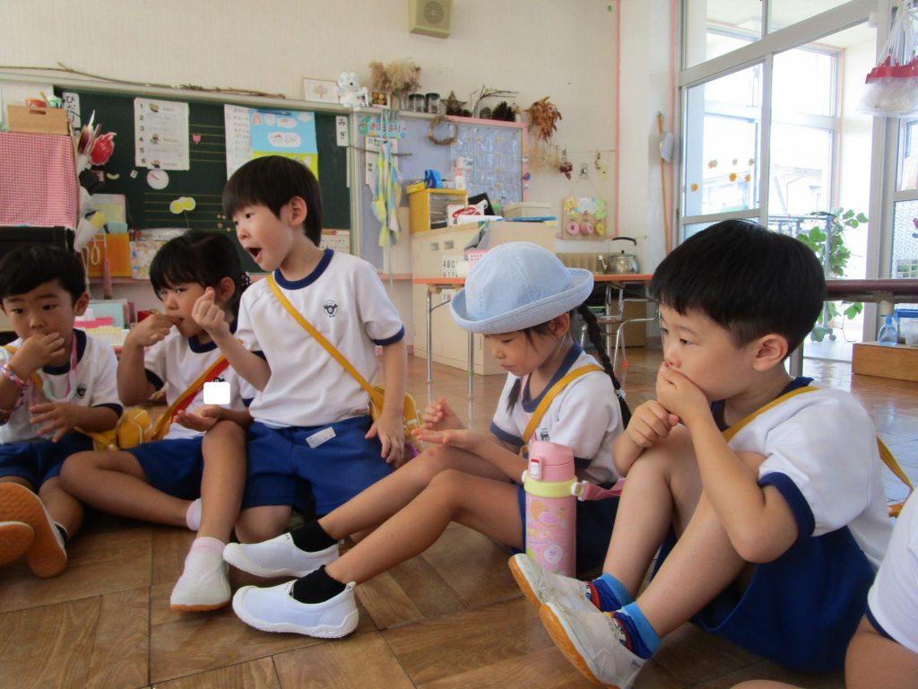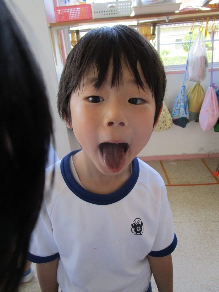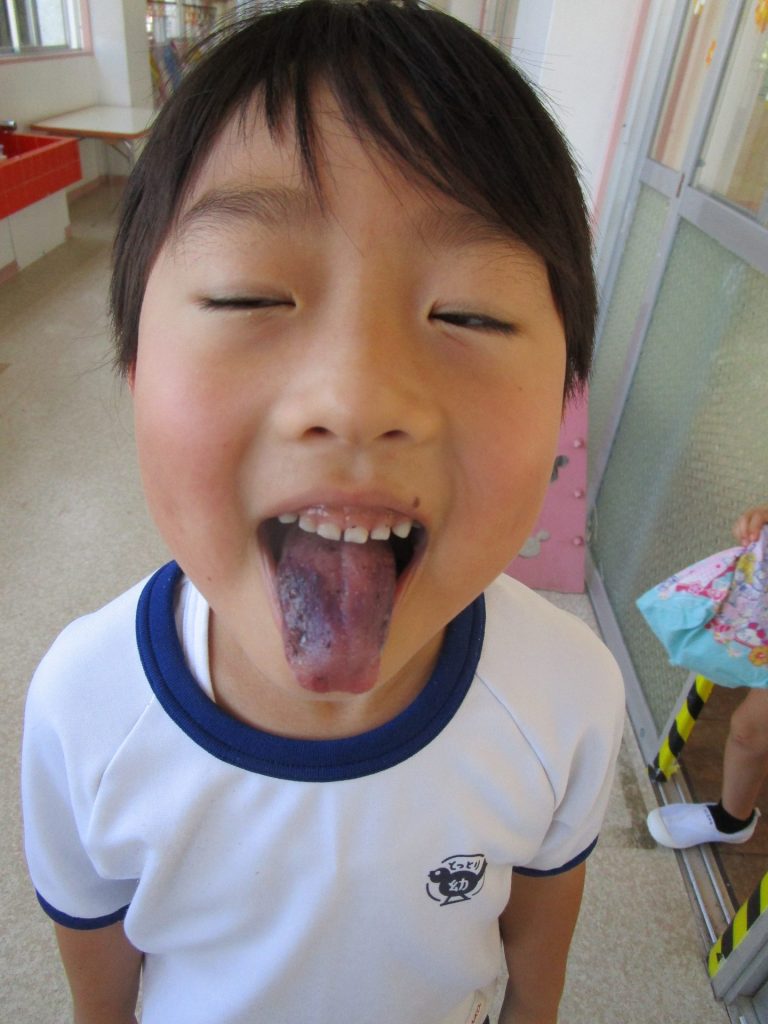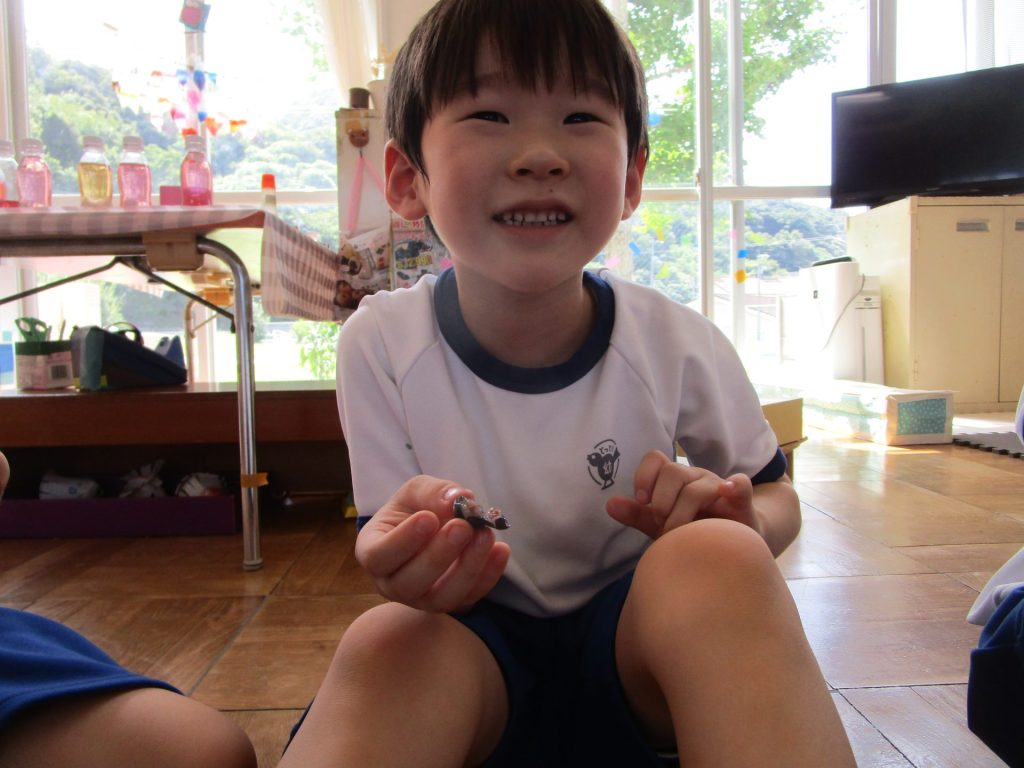 この日の朝の「おはよう」の時間に、できた色水を紹介してくれました。のりのりです。