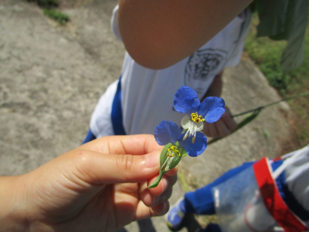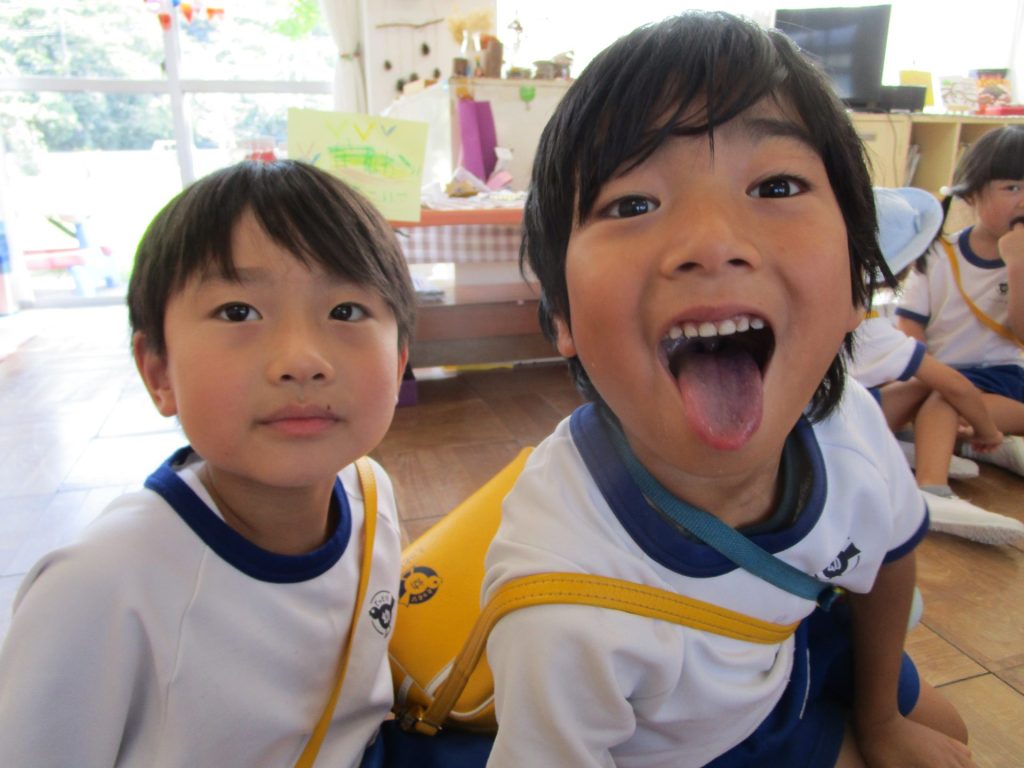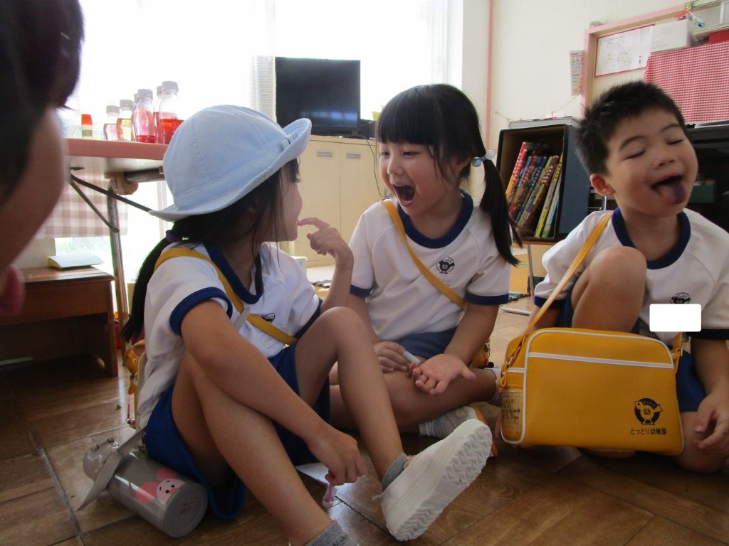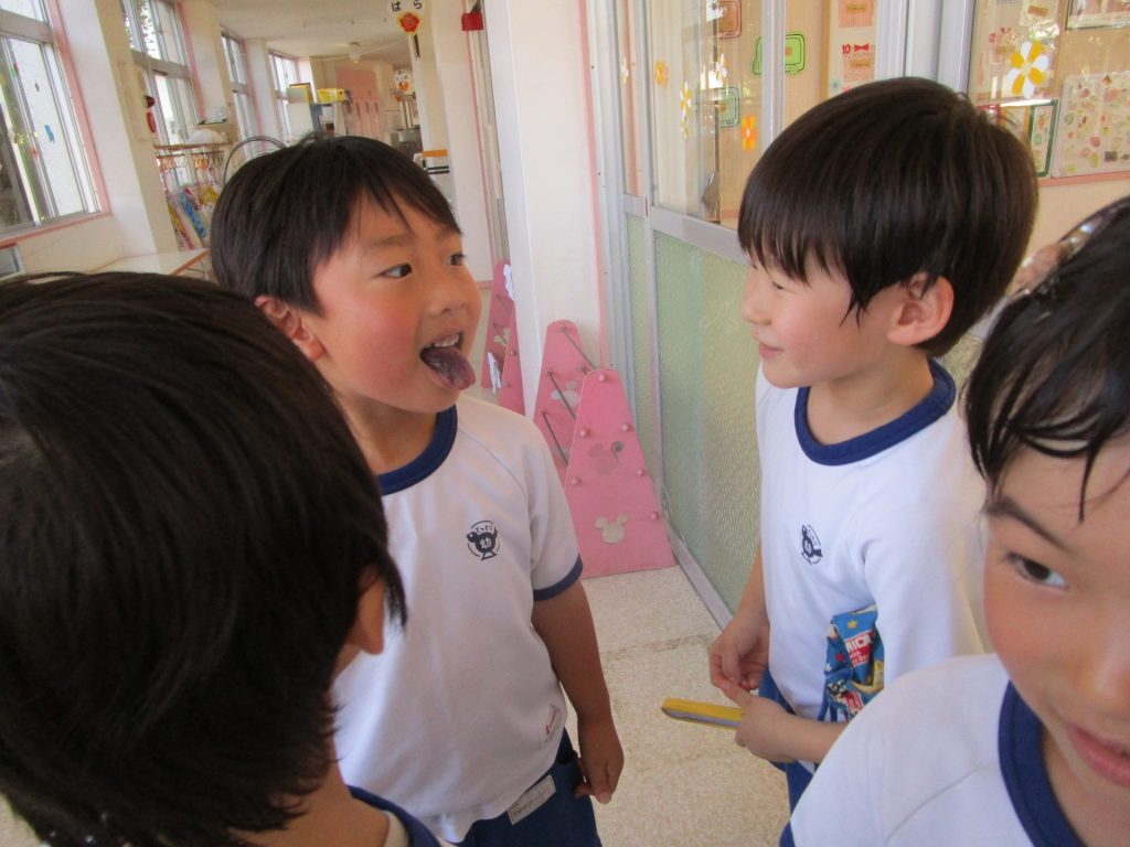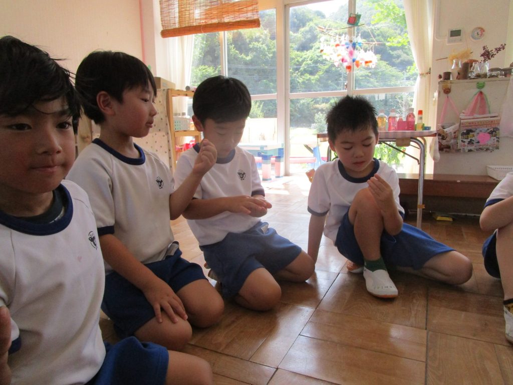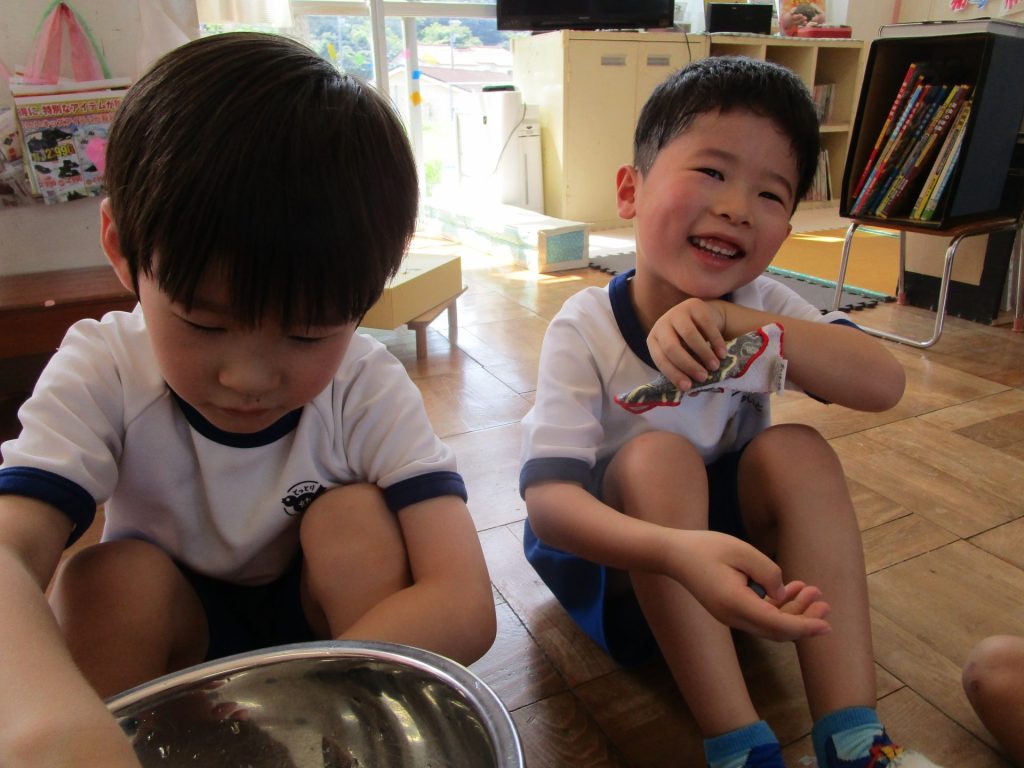 この日の朝の「おはよう」の時間に、できた色水を紹介してくれました。のりのりです。