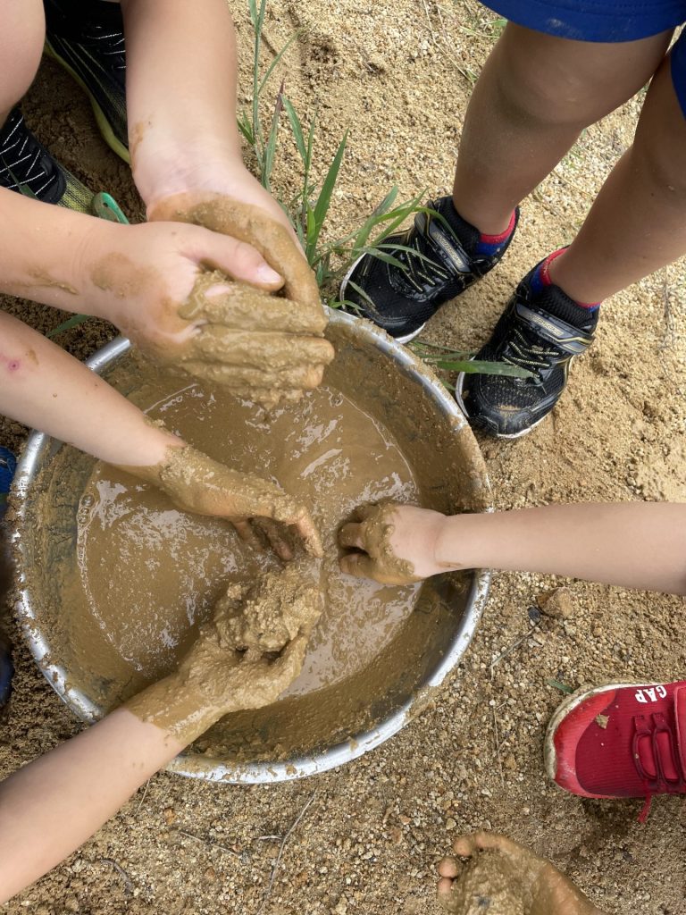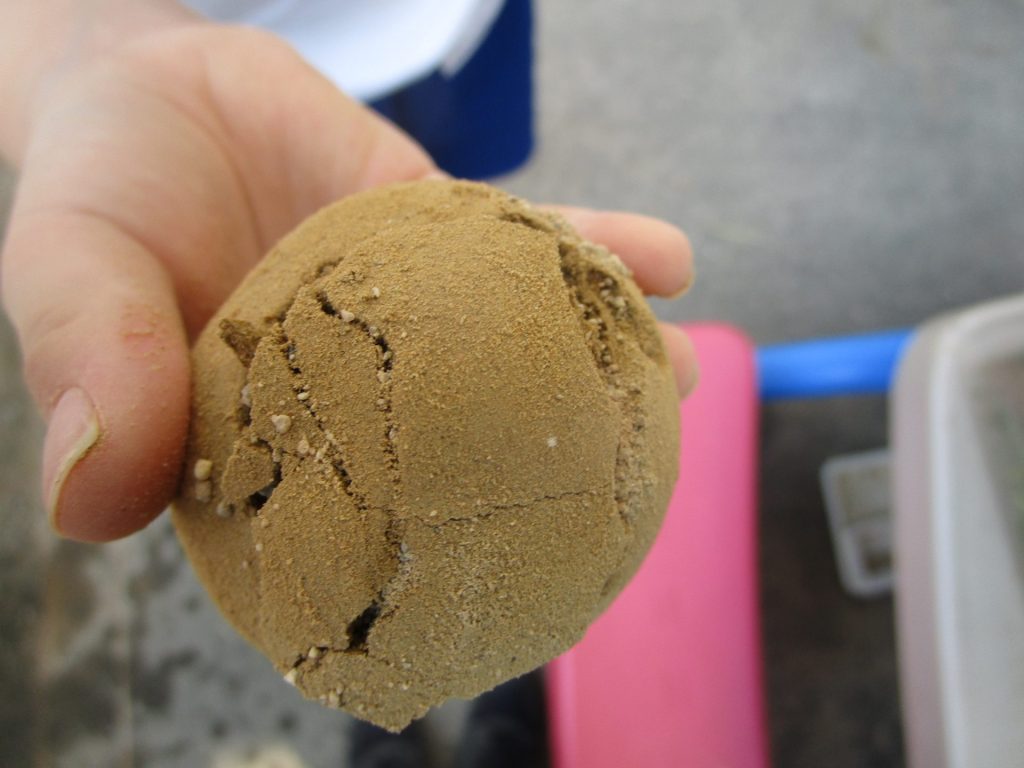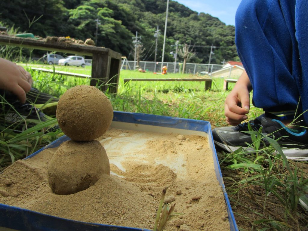 スコップの上に逆さにしたコップを置き・・滑らせて面に置き型を抜く・・・遊びの中で崩れず形を作る方法を見つけたようです。すごい・・・☆!!