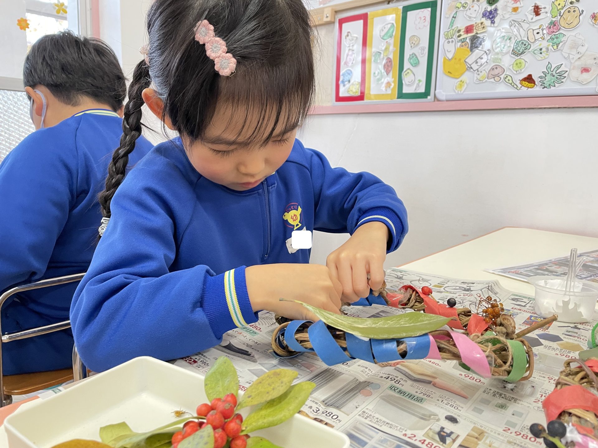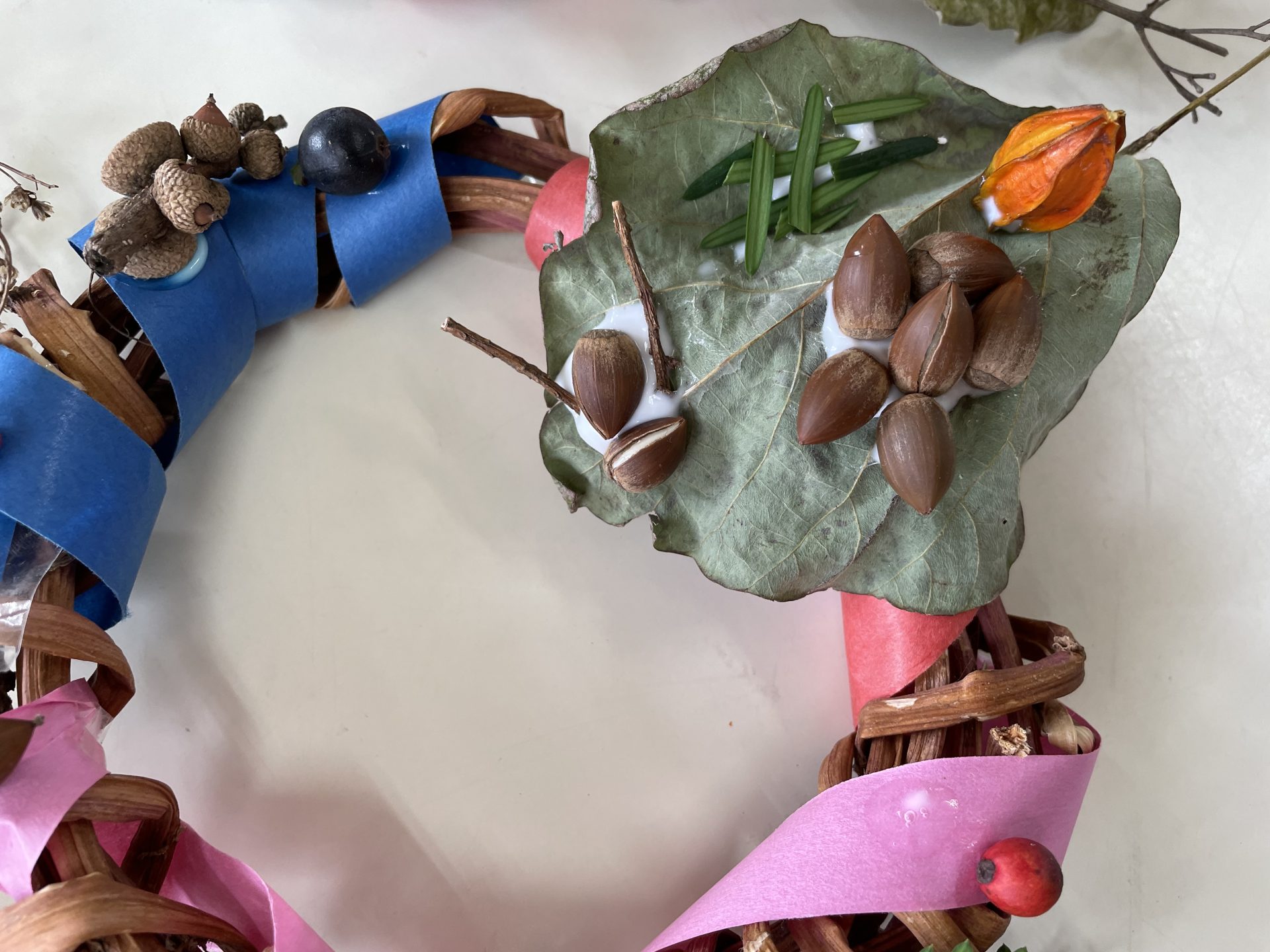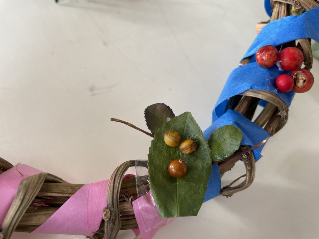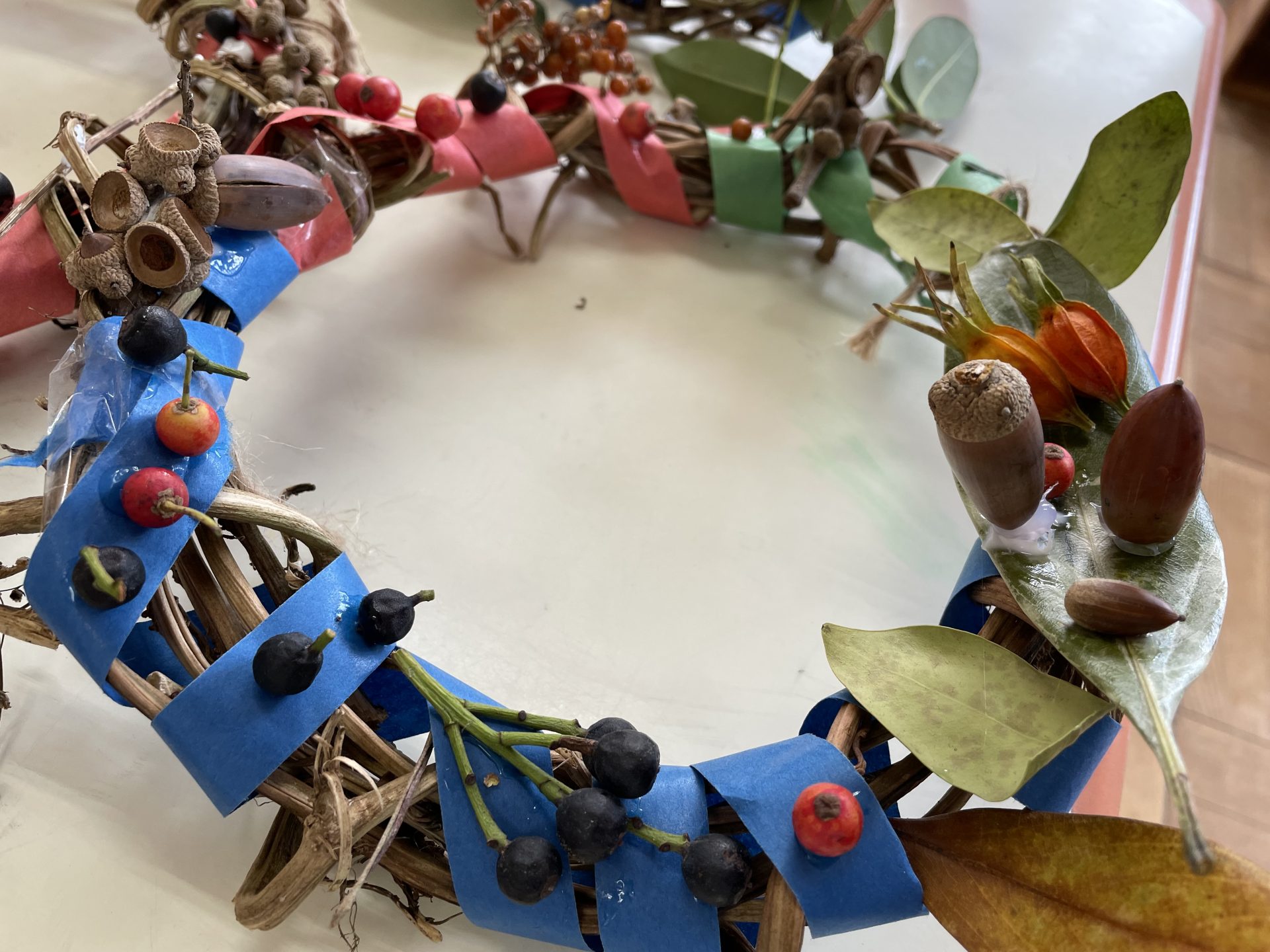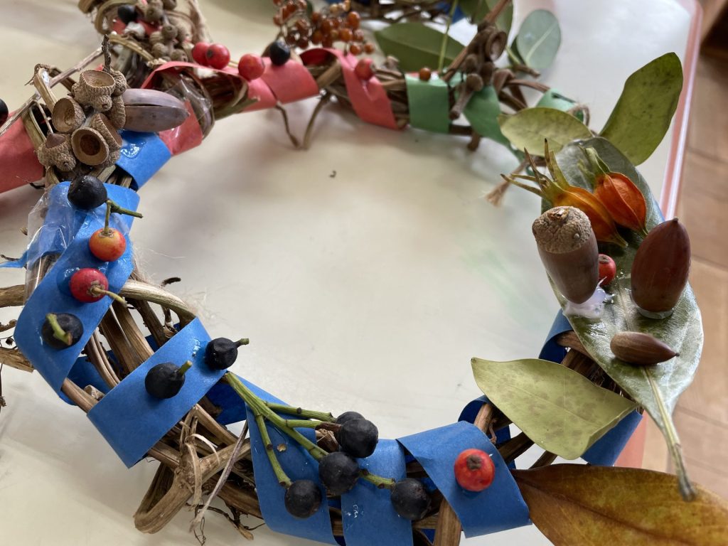 以前拾っていた木の実や、園庭の葉っぱも仲間入り。自然物のやわらしく温かい雰囲気に合わせて・・紙テープを巻きました。