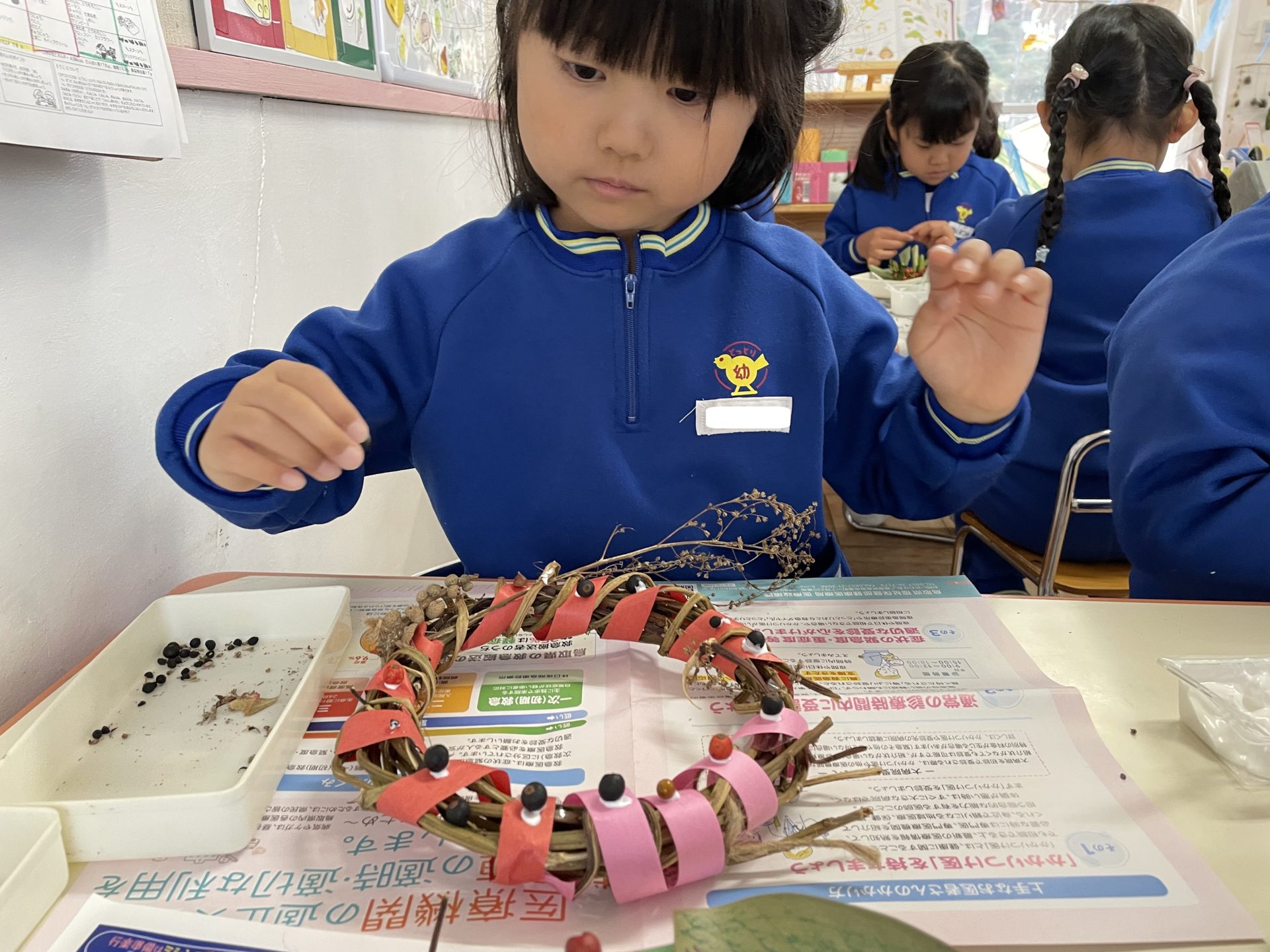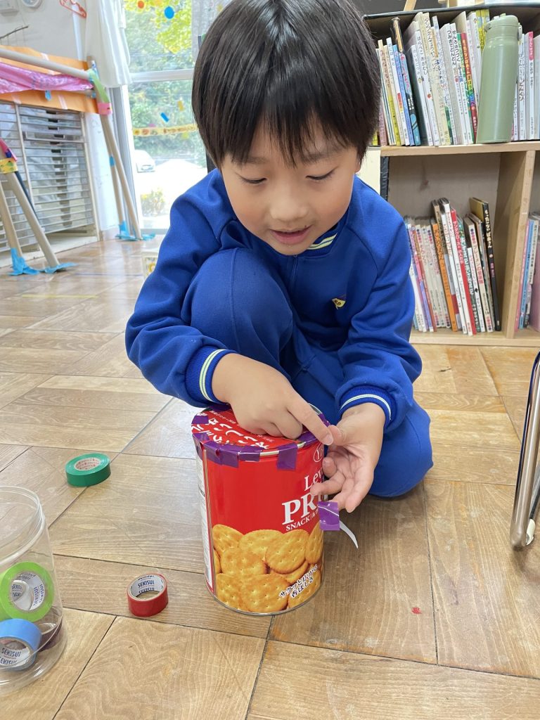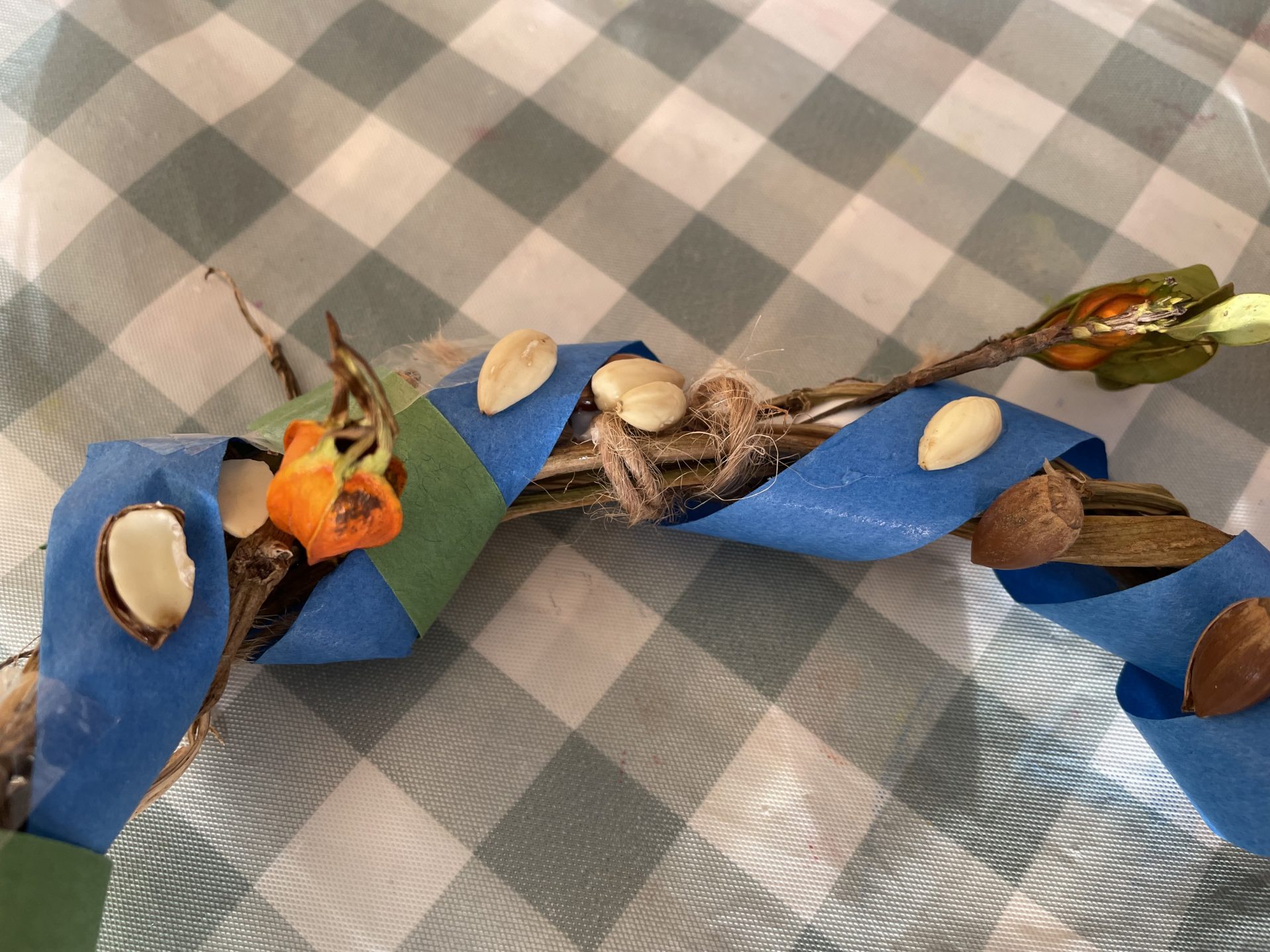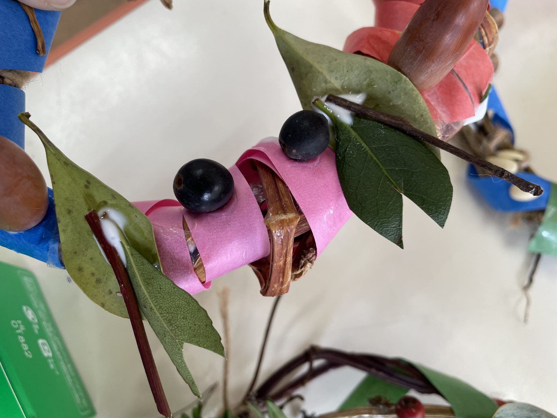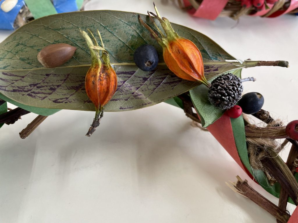 以前拾っていた木の実や、園庭の葉っぱも仲間入り。自然物のやわらしく温かい雰囲気に合わせて・・紙テープを巻きました。