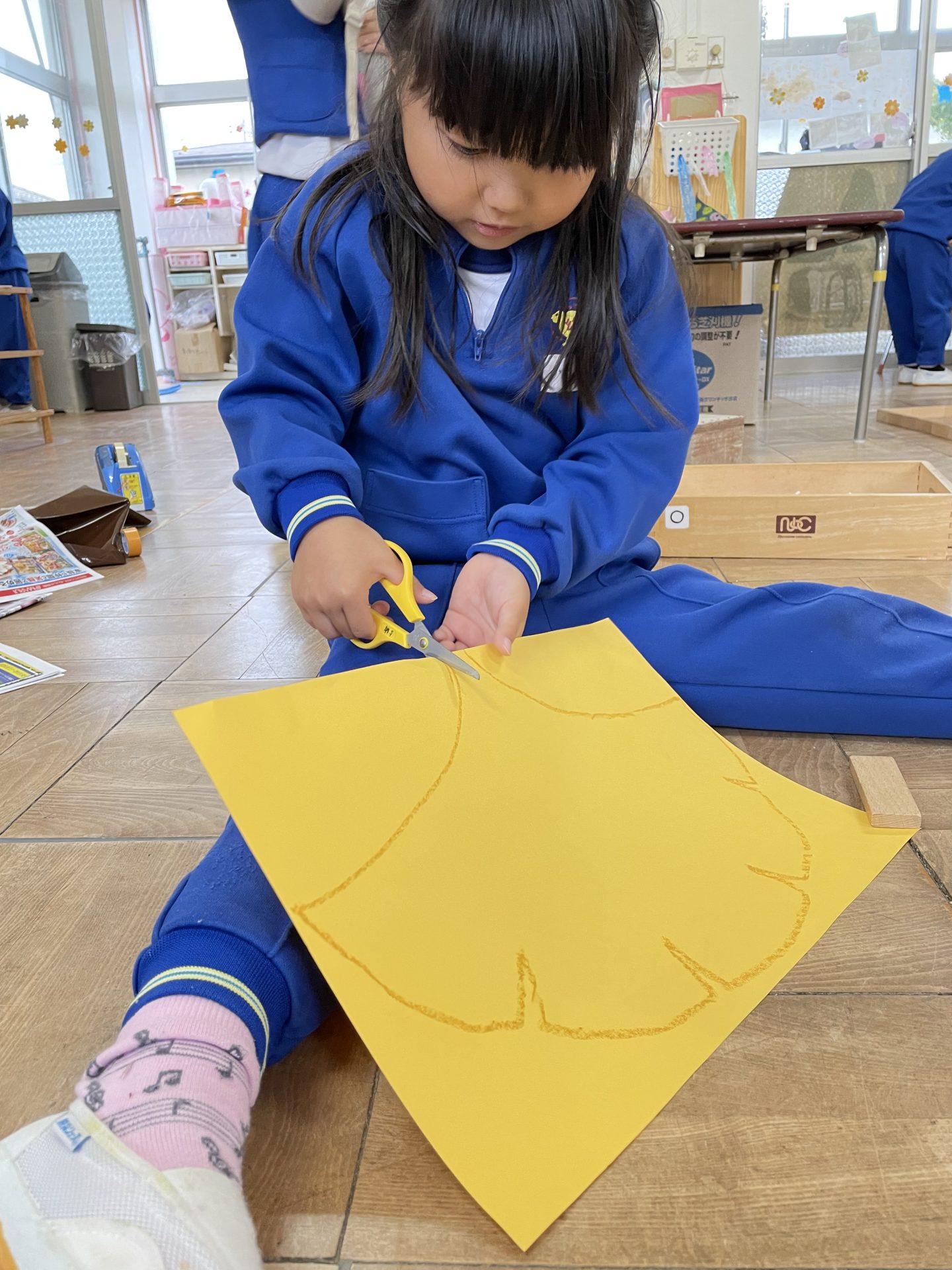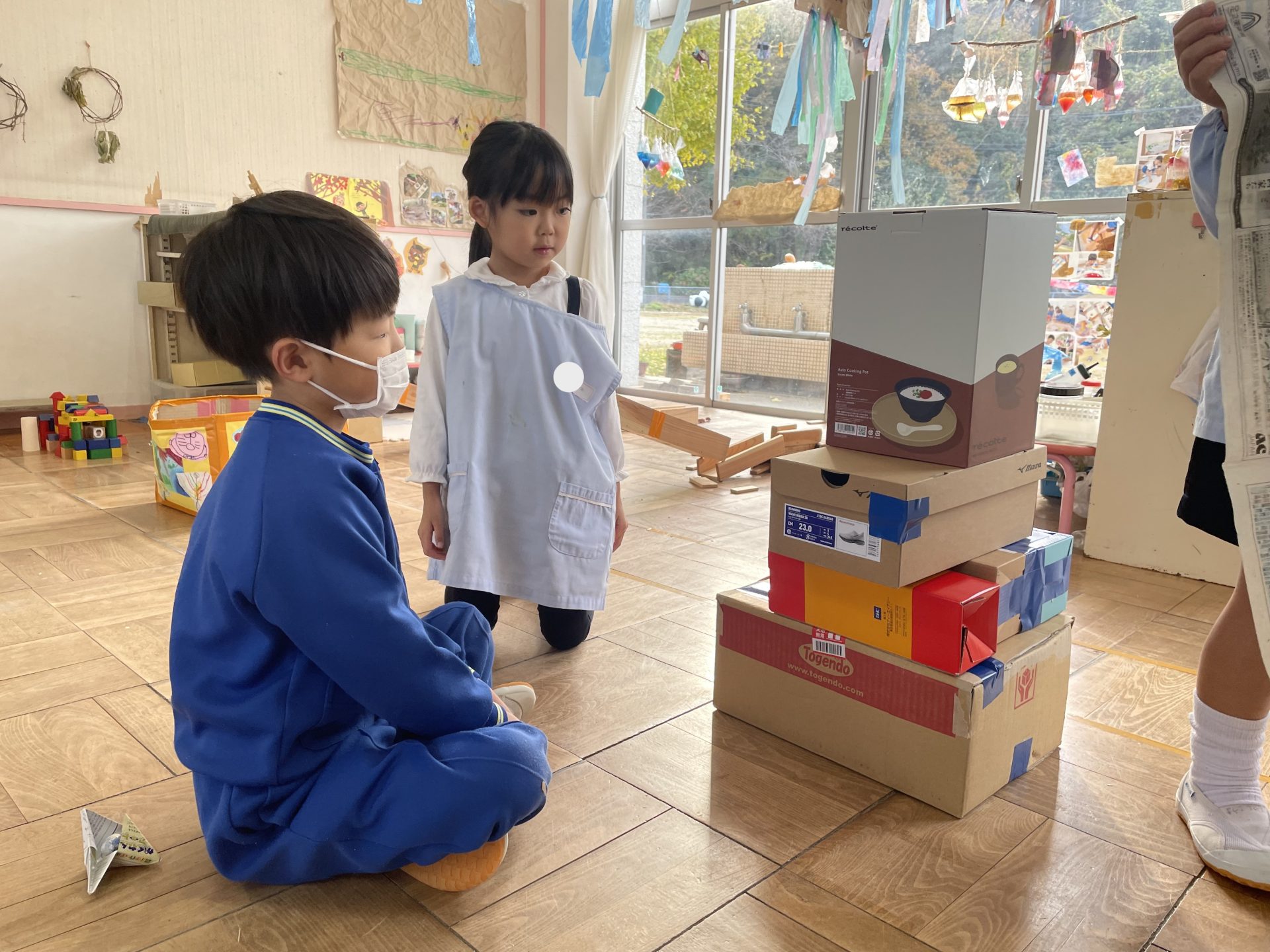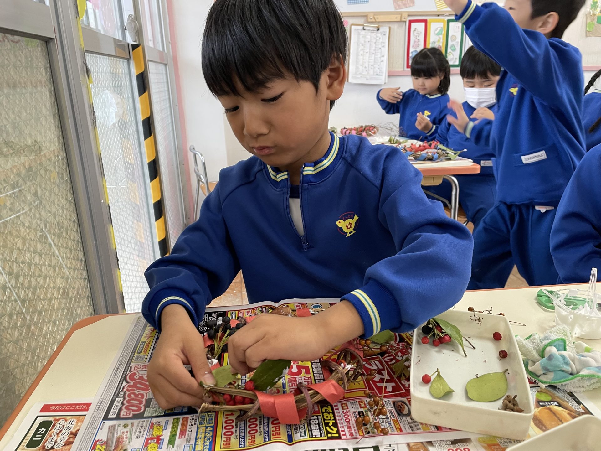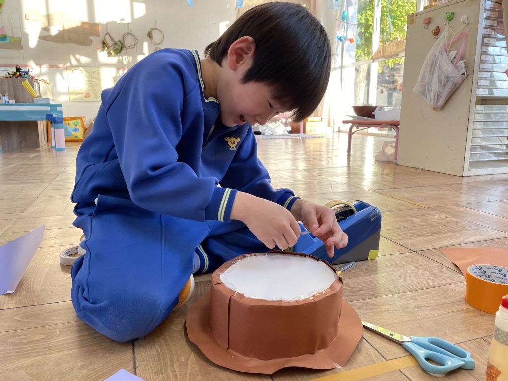 以前拾っていた木の実や、園庭の葉っぱも仲間入り。自然物のやわらしく温かい雰囲気に合わせて・・紙テープを巻きました。