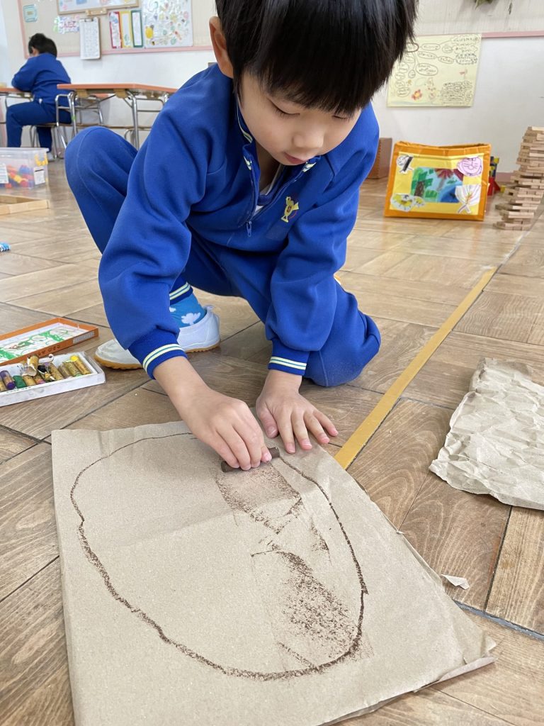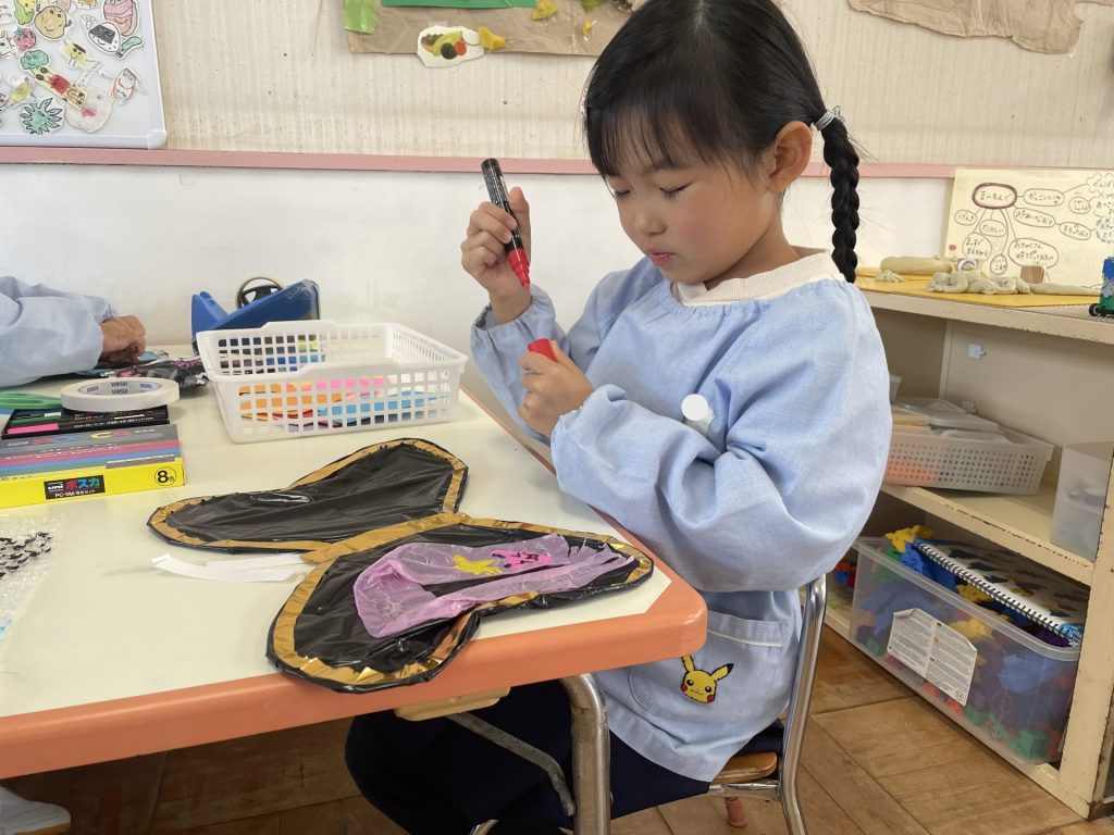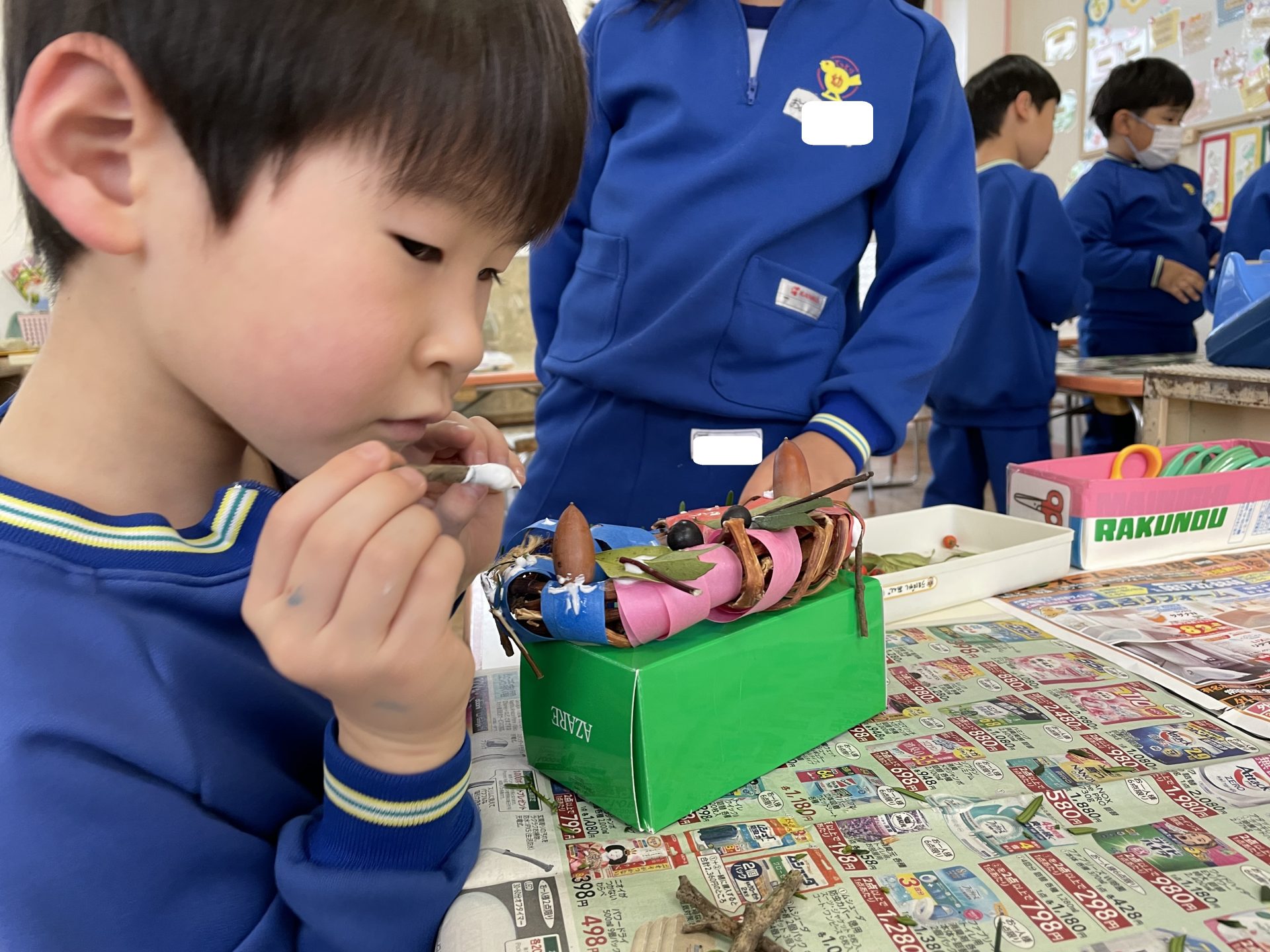「どこにつけようかな~」「カニみたいにしよう!」「一粒ずつつけよう・・」などイメージはそれぞれ・・じっくりと、そしてイメージを膨らませながら作っていました♬