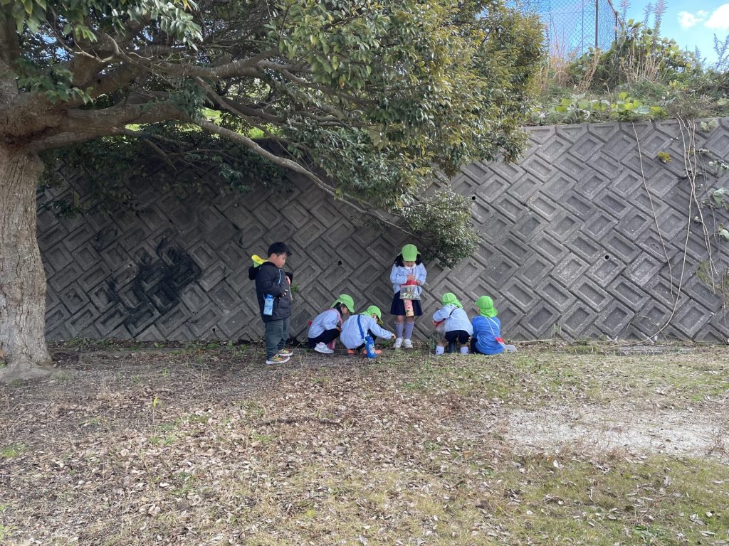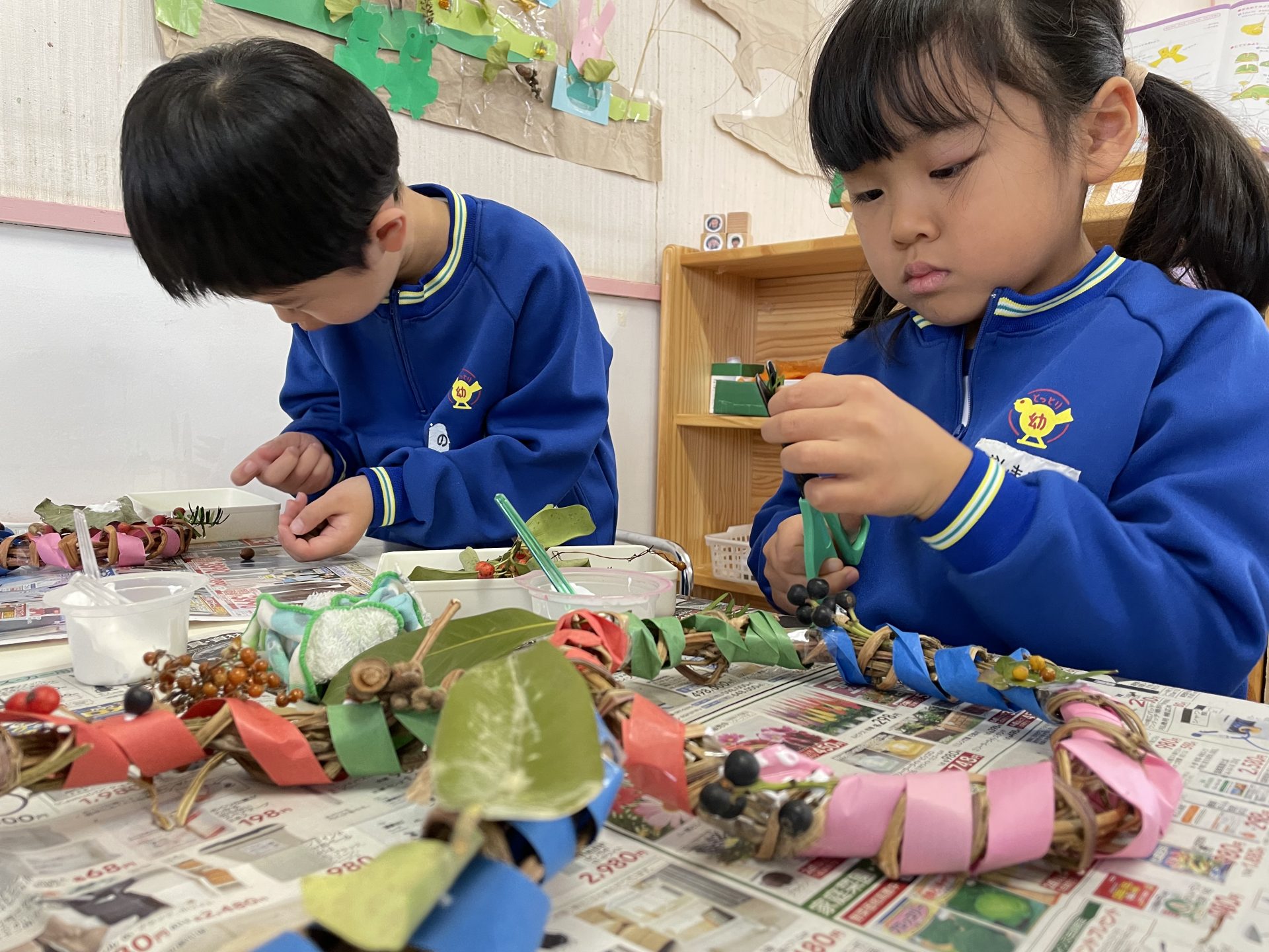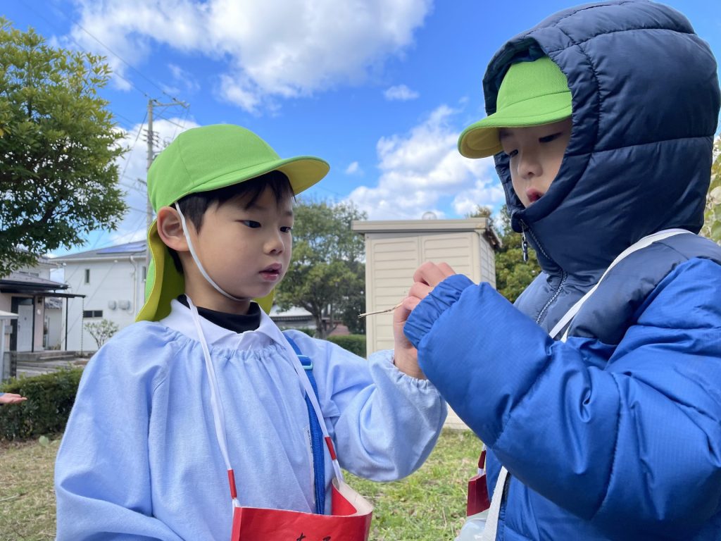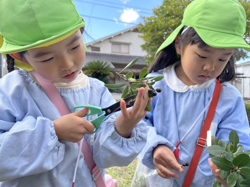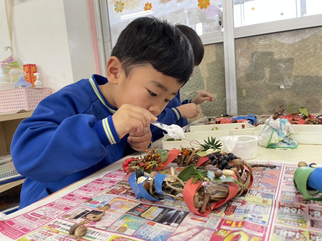 外はひんやり冷え込むようになりました。クリスマスも近づき・・わくわくが止まらない子どもたち🎄そこでみんなで芋づるリースを作ることにしました・・何を飾ろうかな~?「赤い実とか公園にあるよ」とお友達が教えてくれ・・近くの公園へみんなで散歩にでかけました。