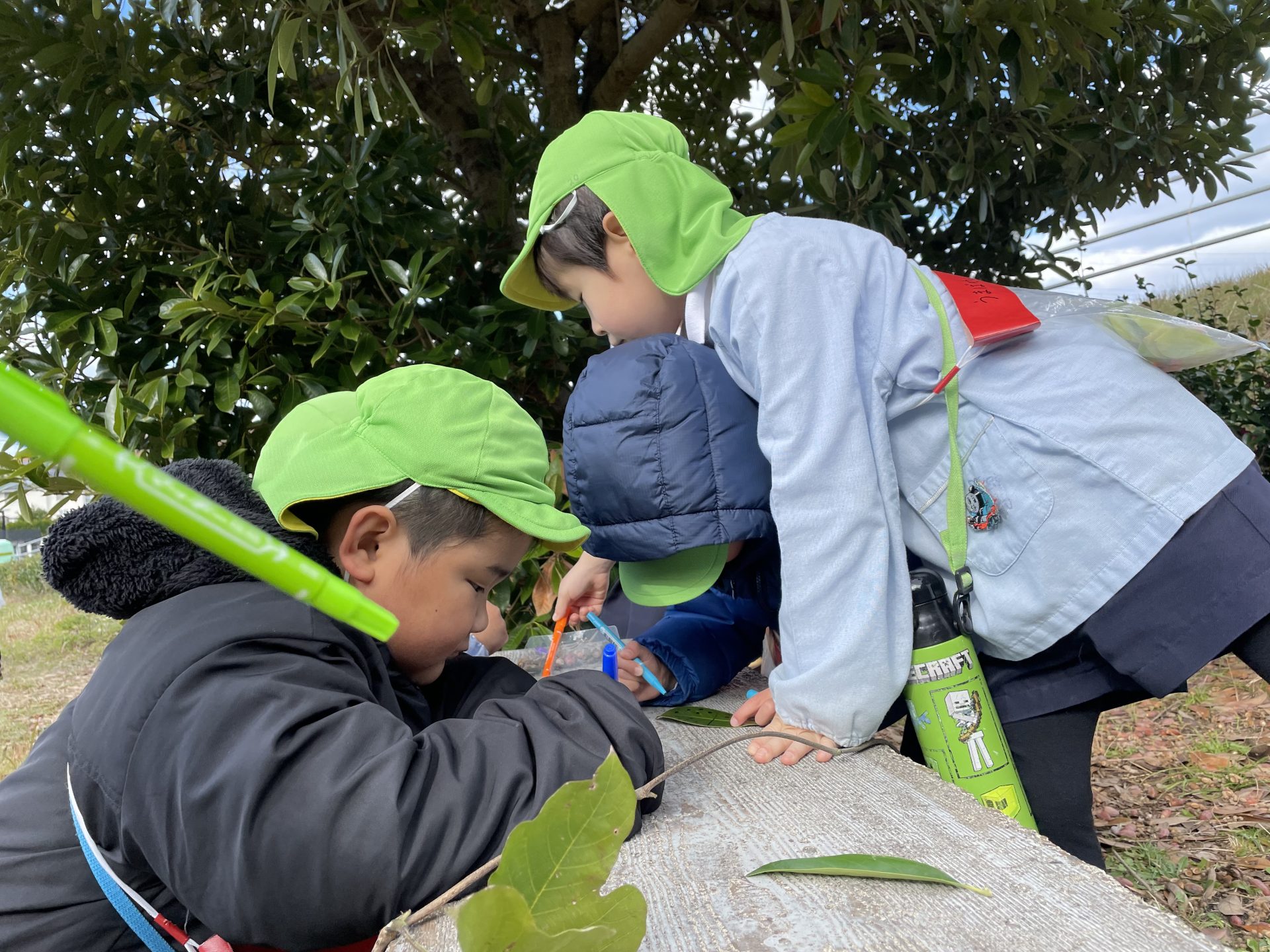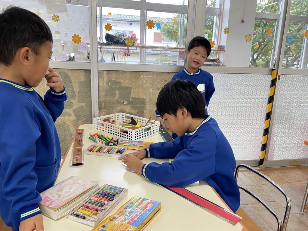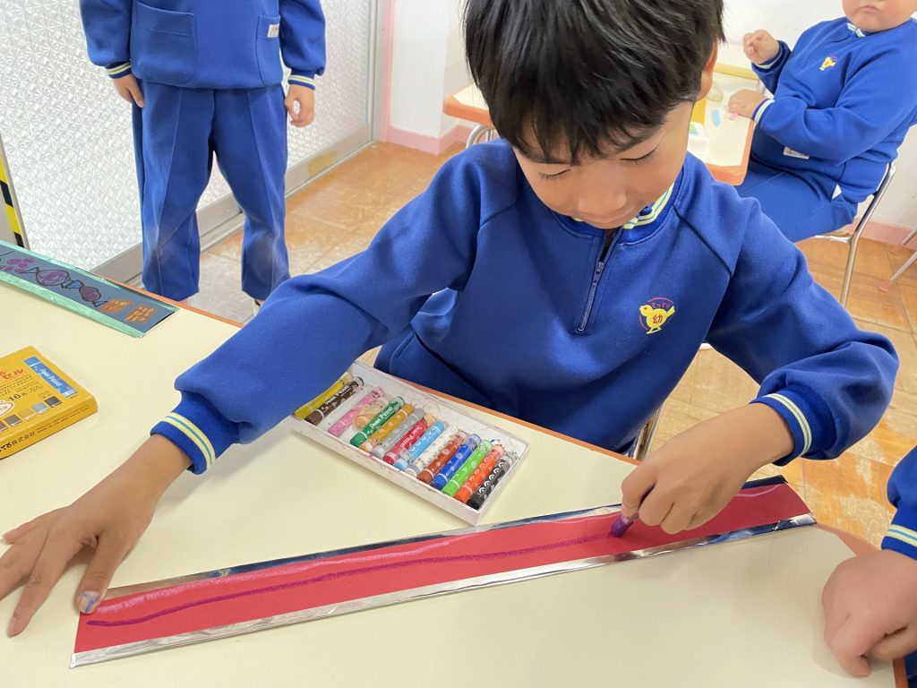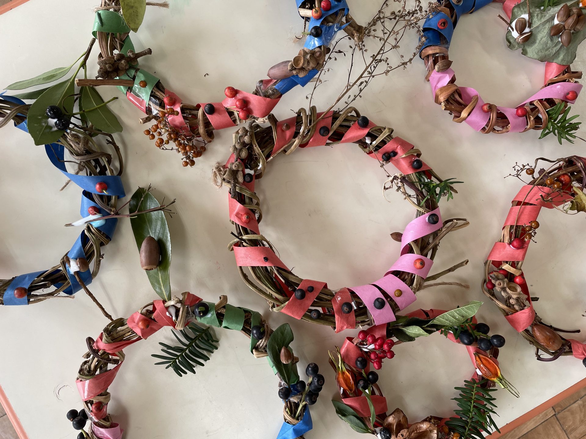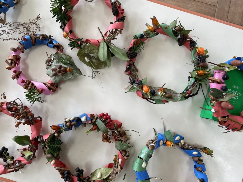 外はひんやり冷え込むようになりました。クリスマスも近づき・・わくわくが止まらない子どもたち🎄そこでみんなで芋づるリースを作ることにしました・・何を飾ろうかな~?「赤い実とか公園にあるよ」とお友達が教えてくれ・・近くの公園へみんなで散歩にでかけました。