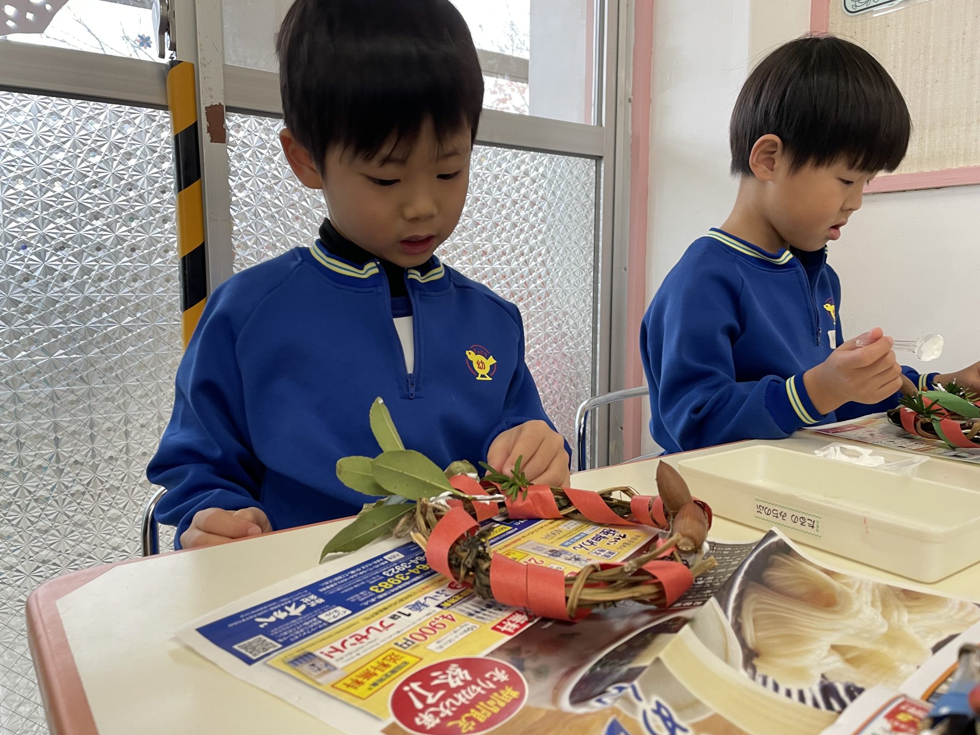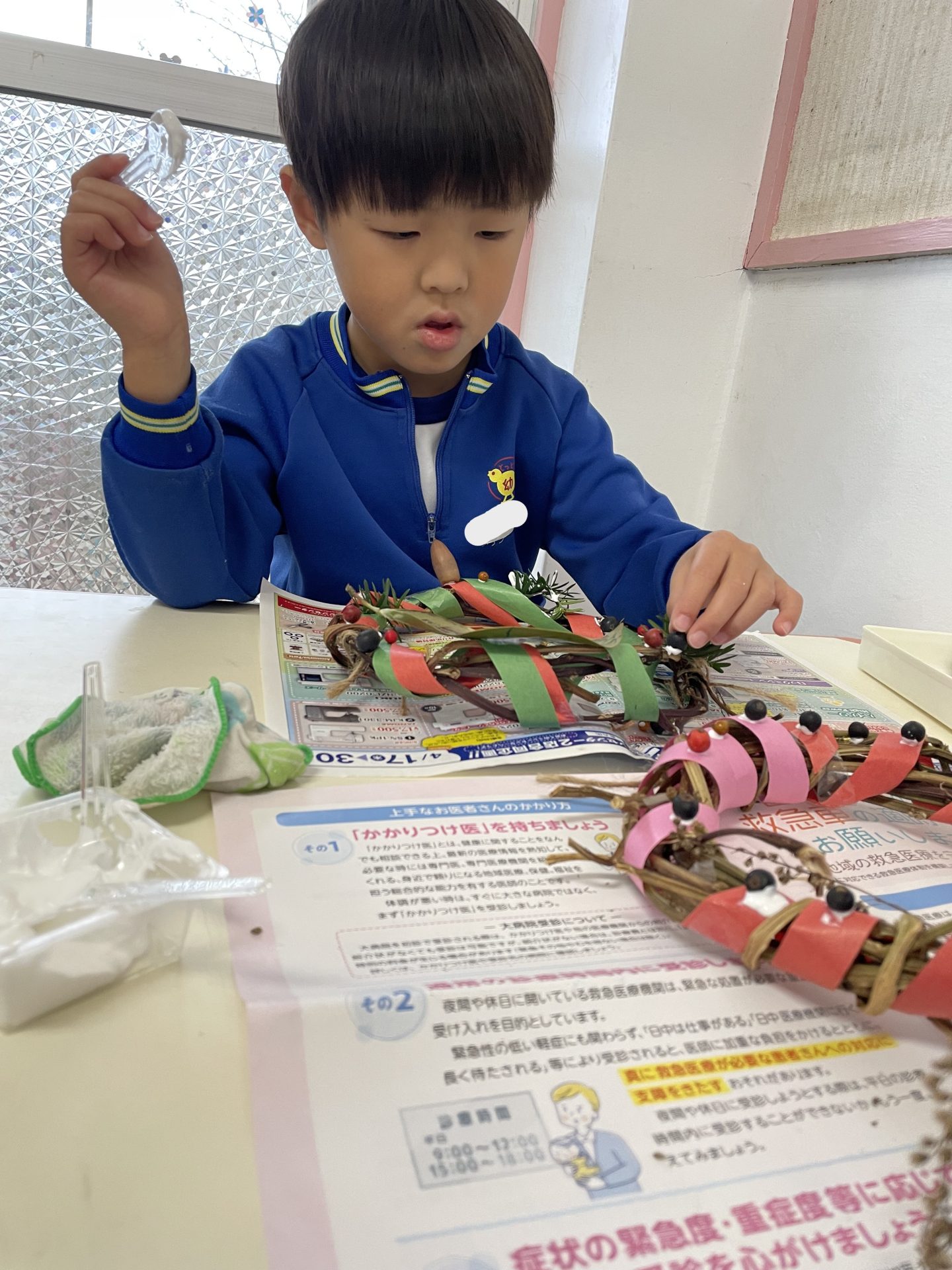 ボンドもなかなかつかなくて難しい・・指先を上手に使いながら飾りをツルの間に挟んだり、平たい場所を探してボンドをつけて飾っていました。