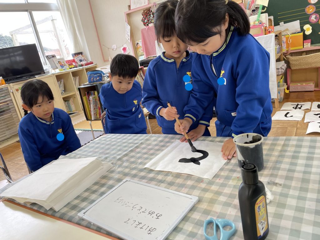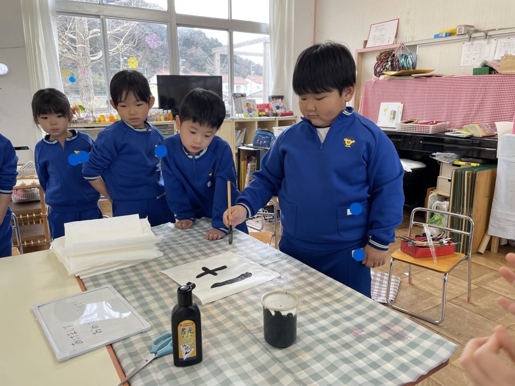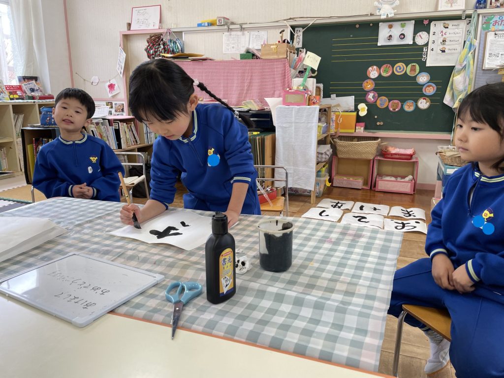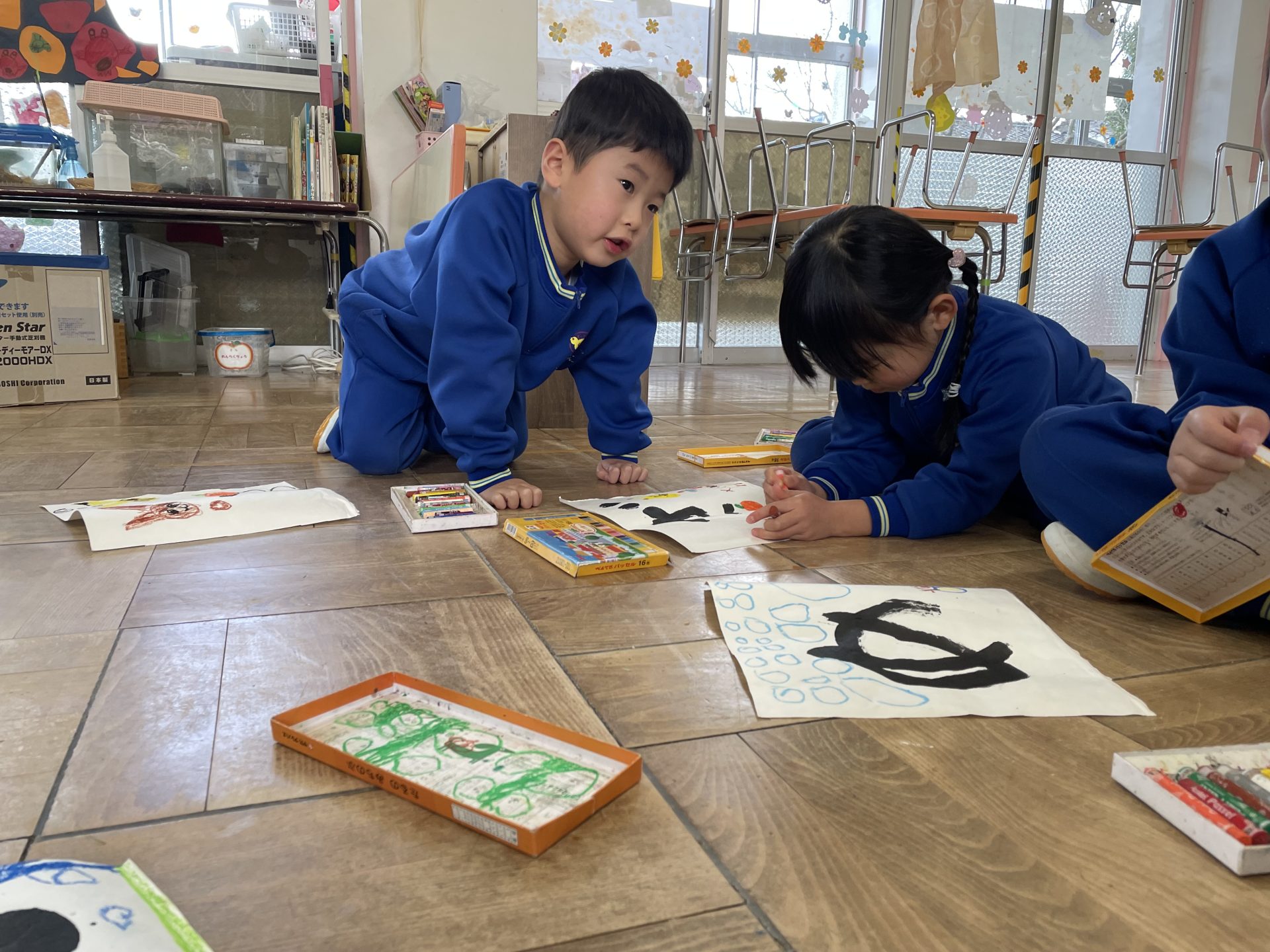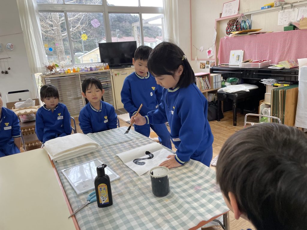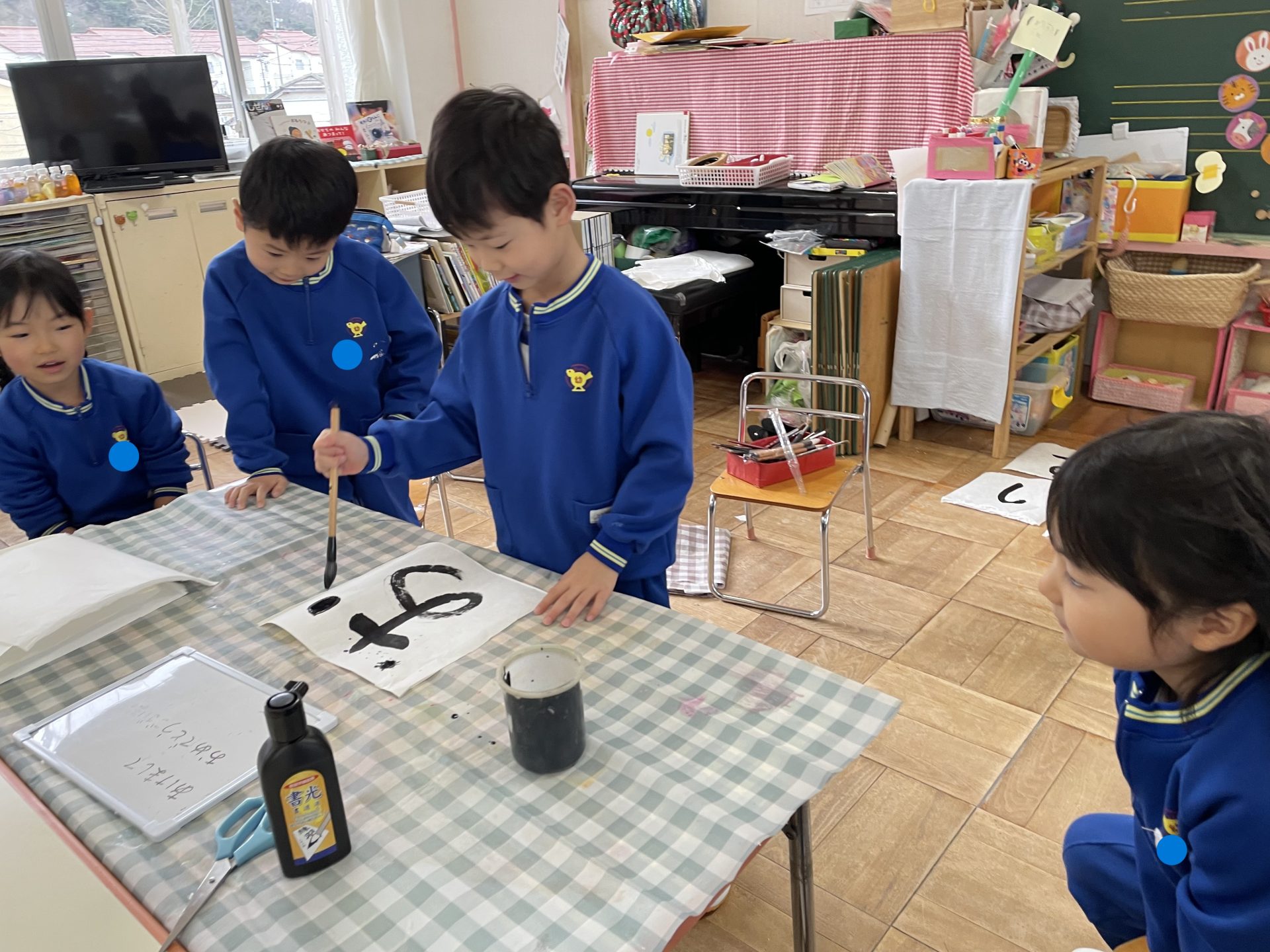 年の初めに・・「書初め」のお話。挑戦してみたいことやがんばりたいことをみんなでお話したりしました。墨の登場に、「学校で使うよ」「神社で墨の字みたことある!」