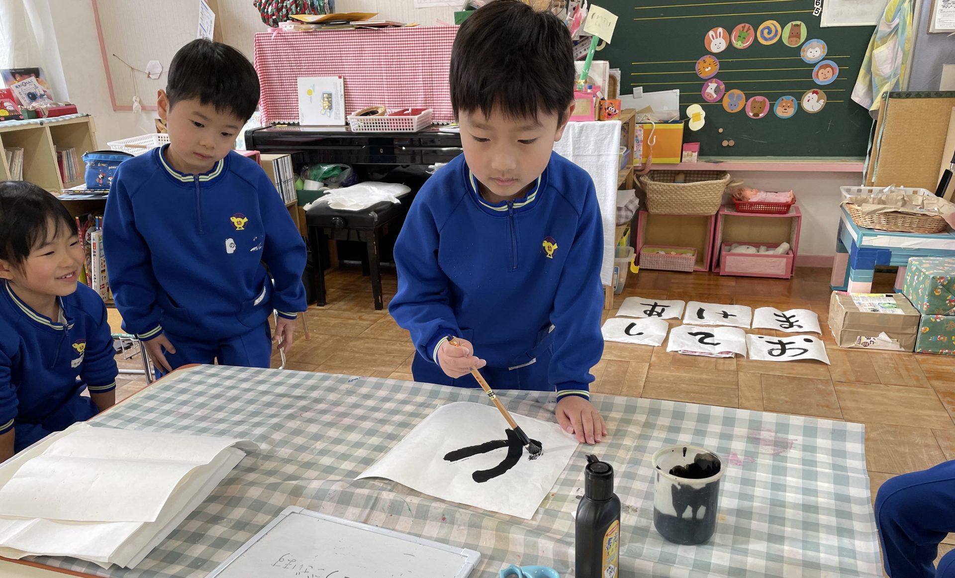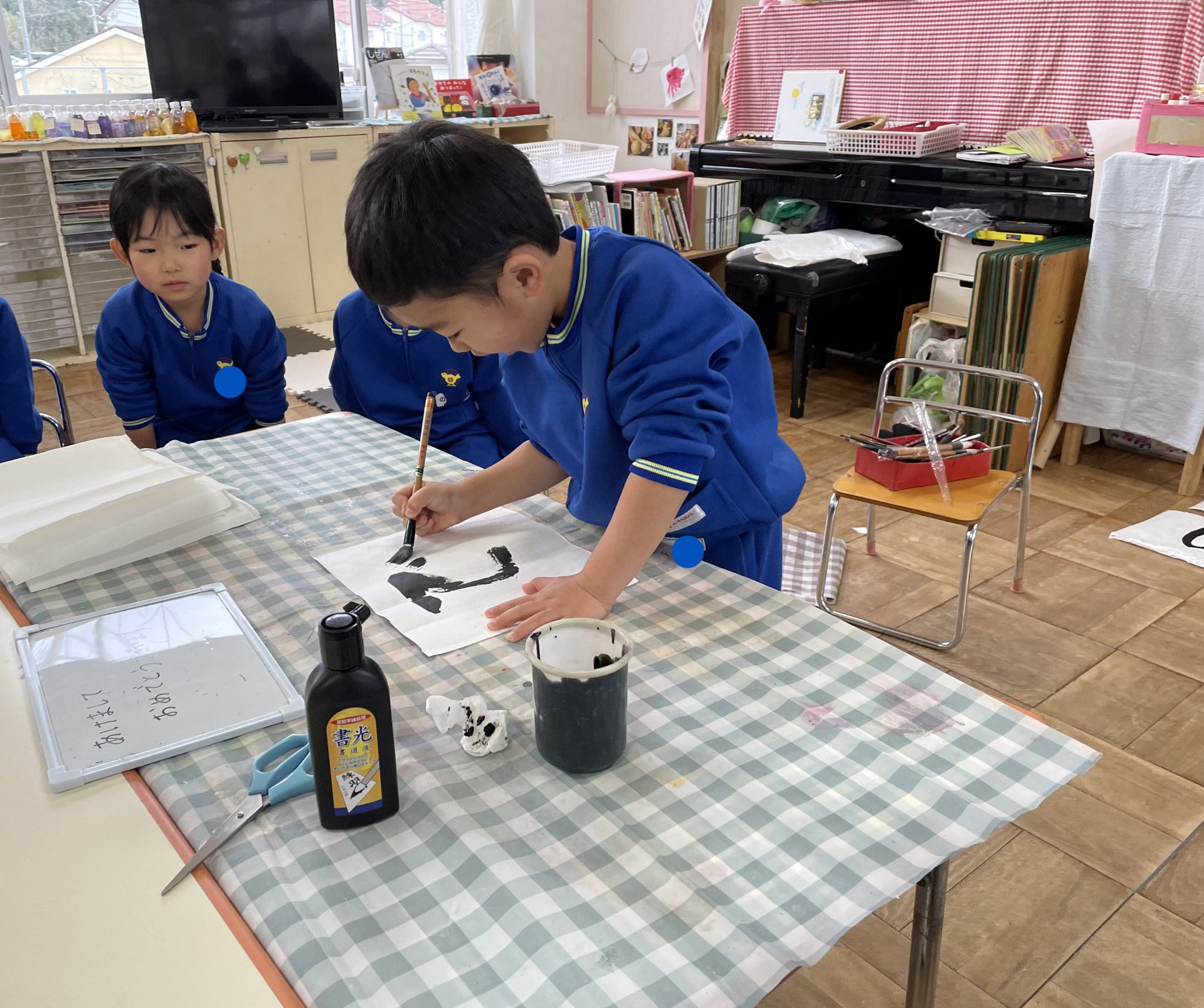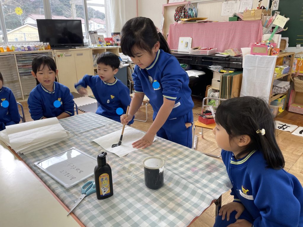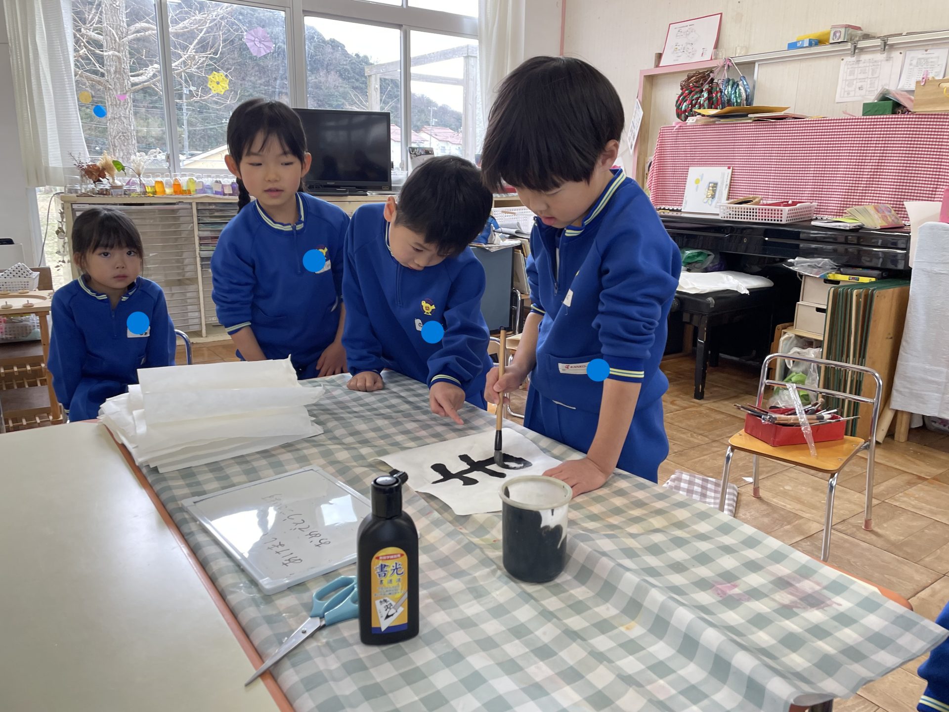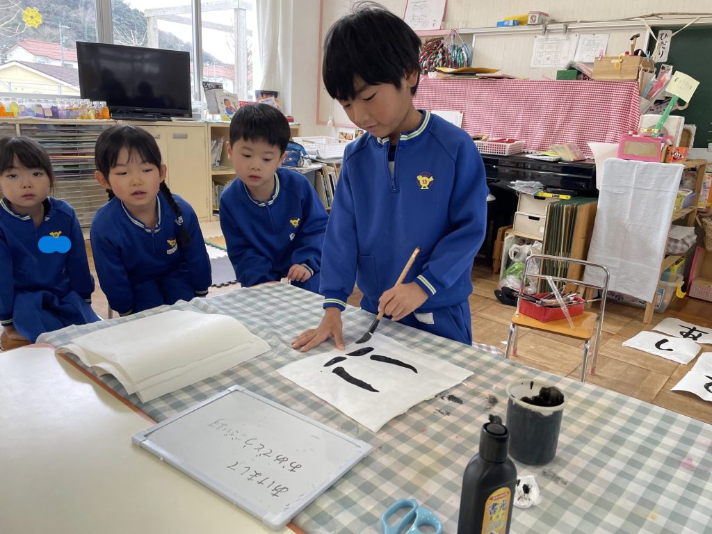 年の初めに・・「書初め」のお話。挑戦してみたいことやがんばりたいことをみんなでお話したりしました。墨の登場に、「学校で使うよ」「神社で墨の字みたことある!」