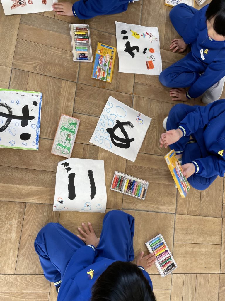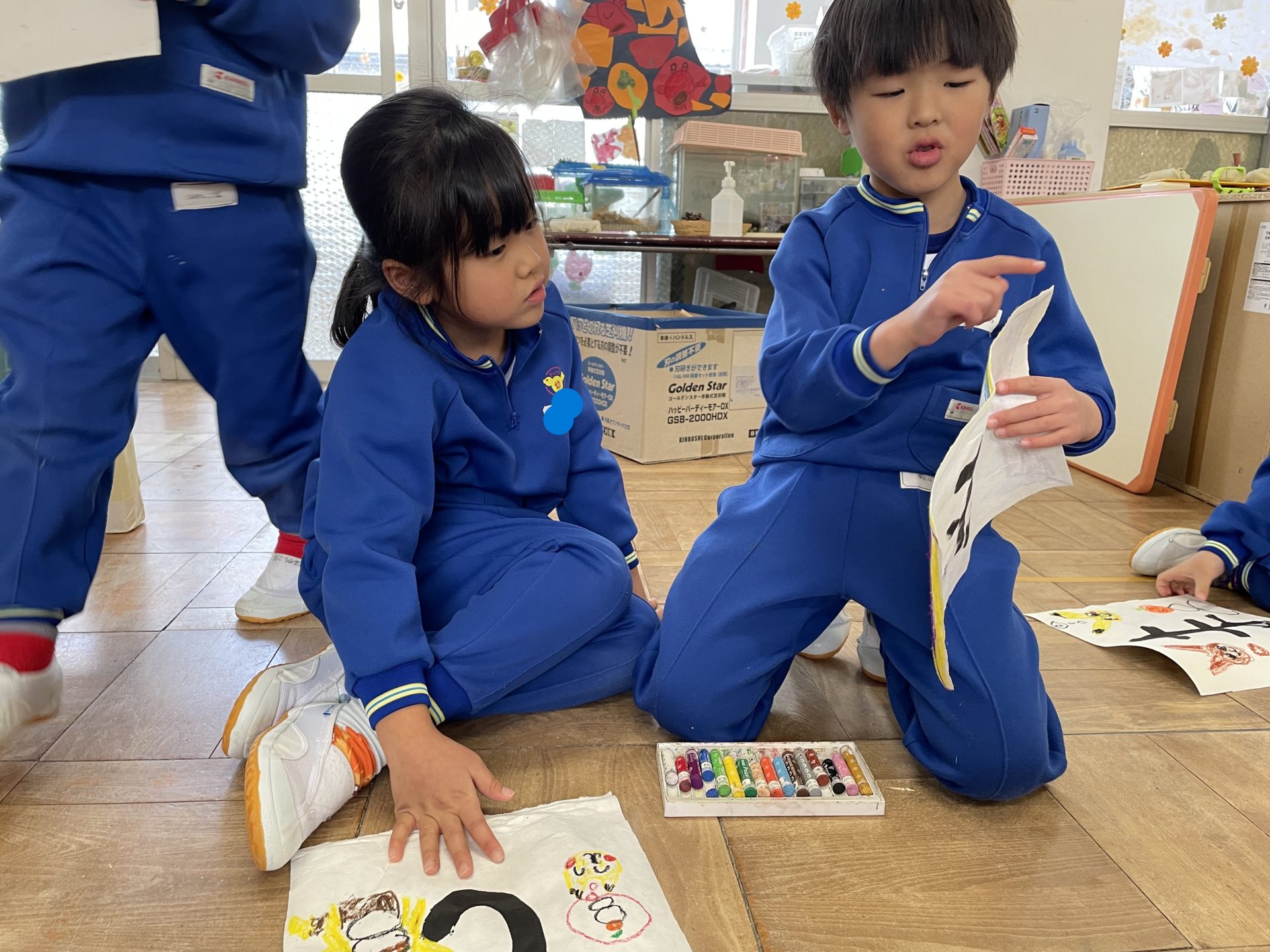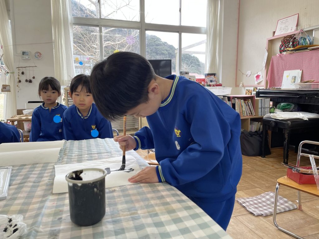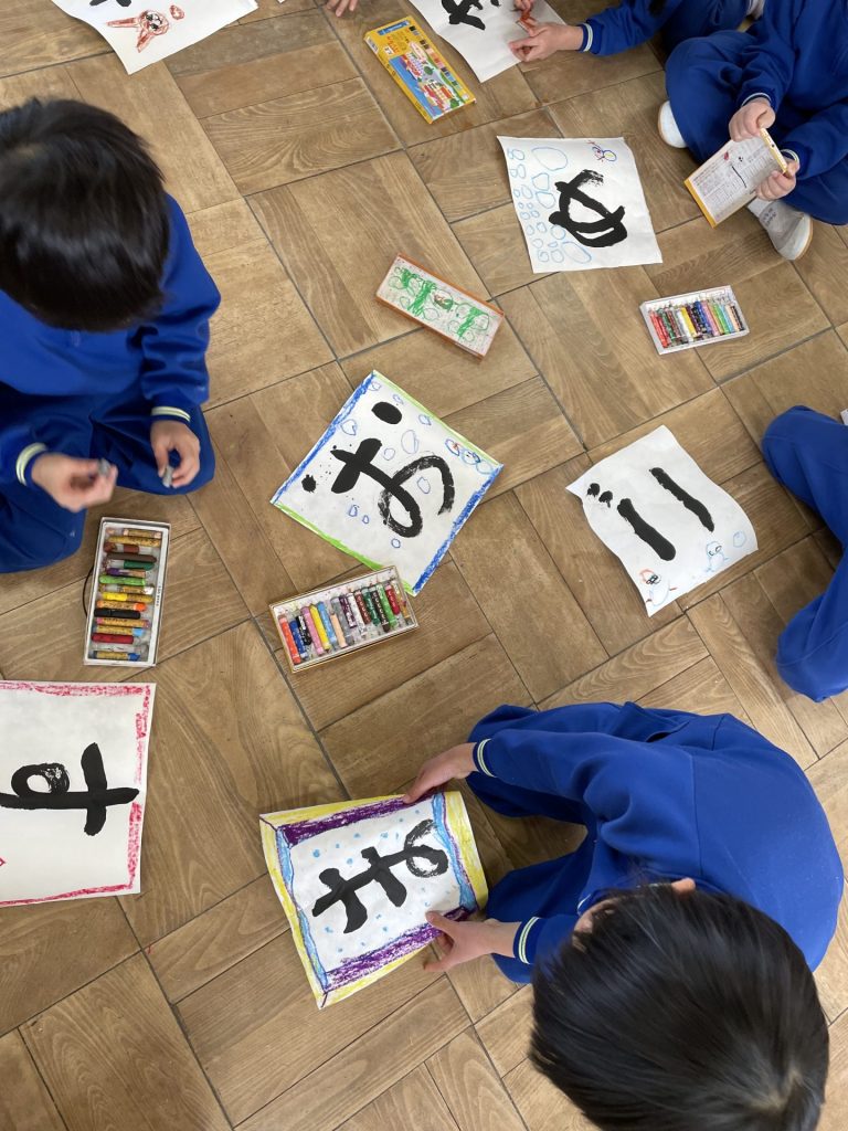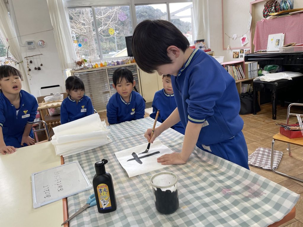 年の初めに・・「書初め」のお話。挑戦してみたいことやがんばりたいことをみんなでお話したりしました。墨の登場に、「学校で使うよ」「神社で墨の字みたことある!」