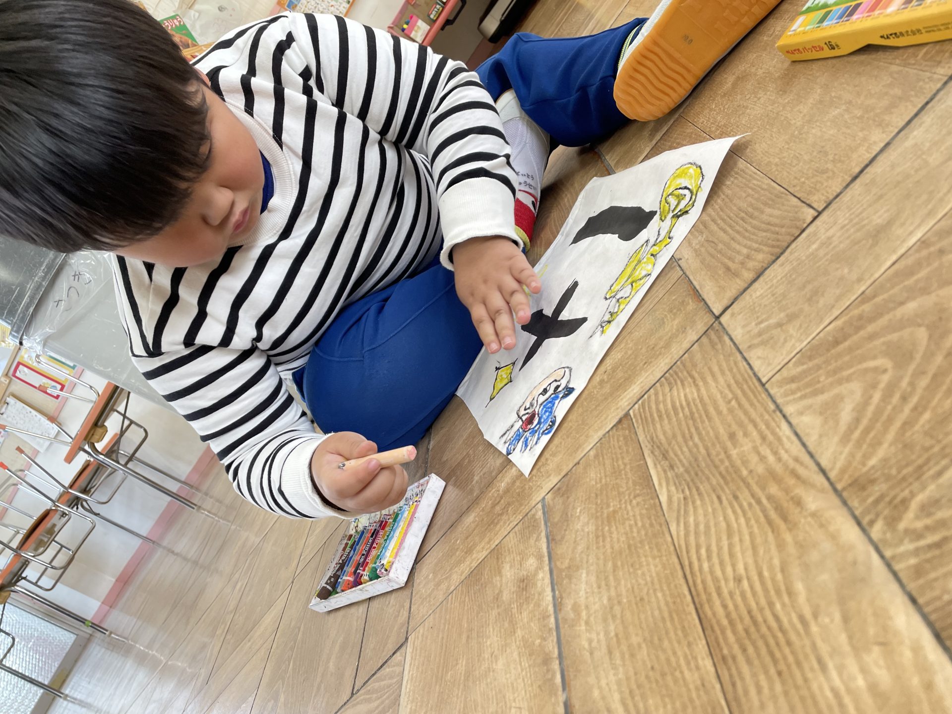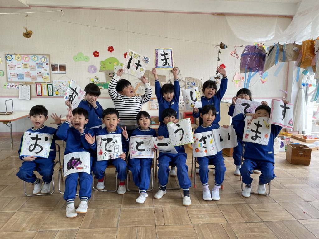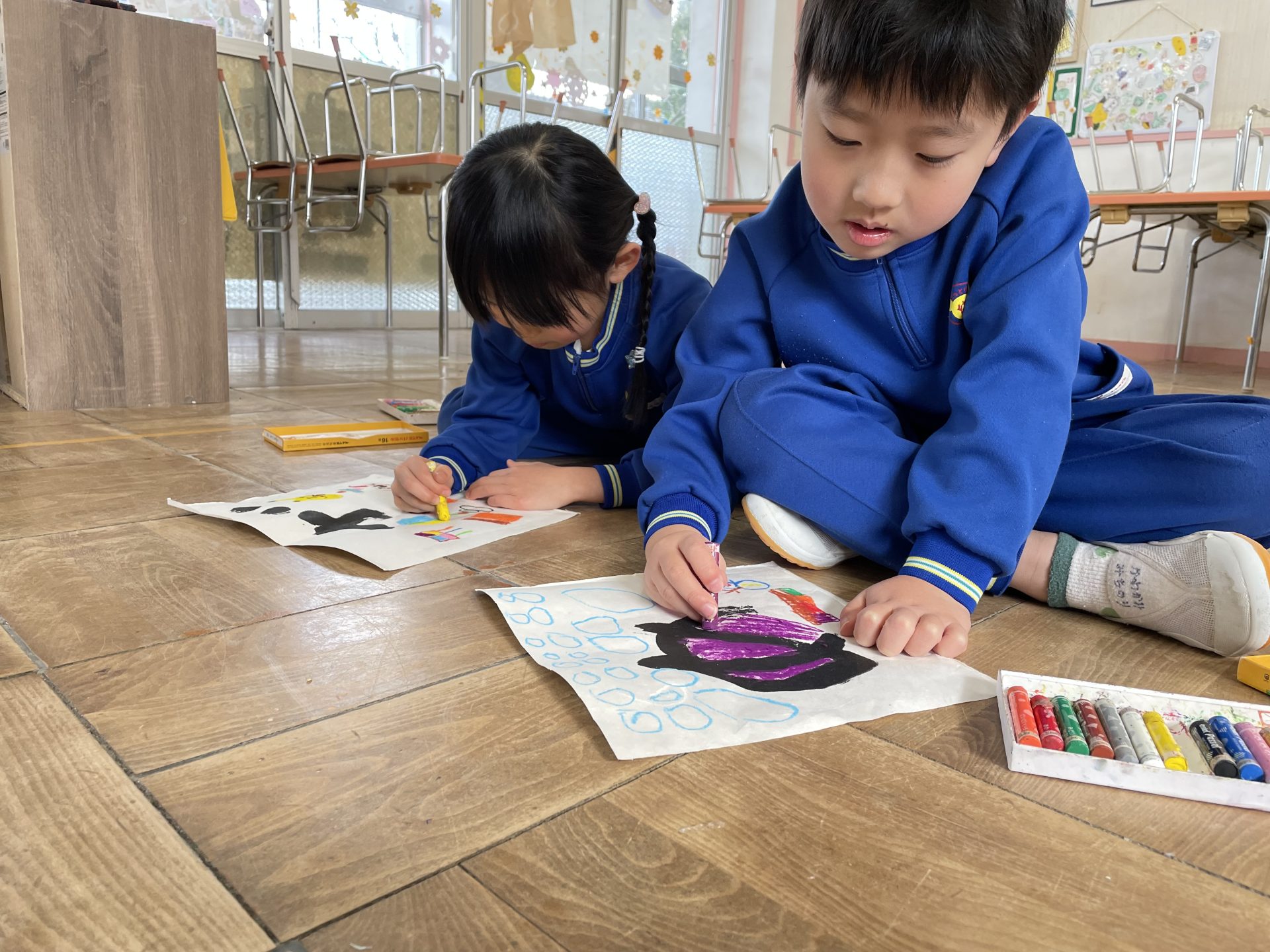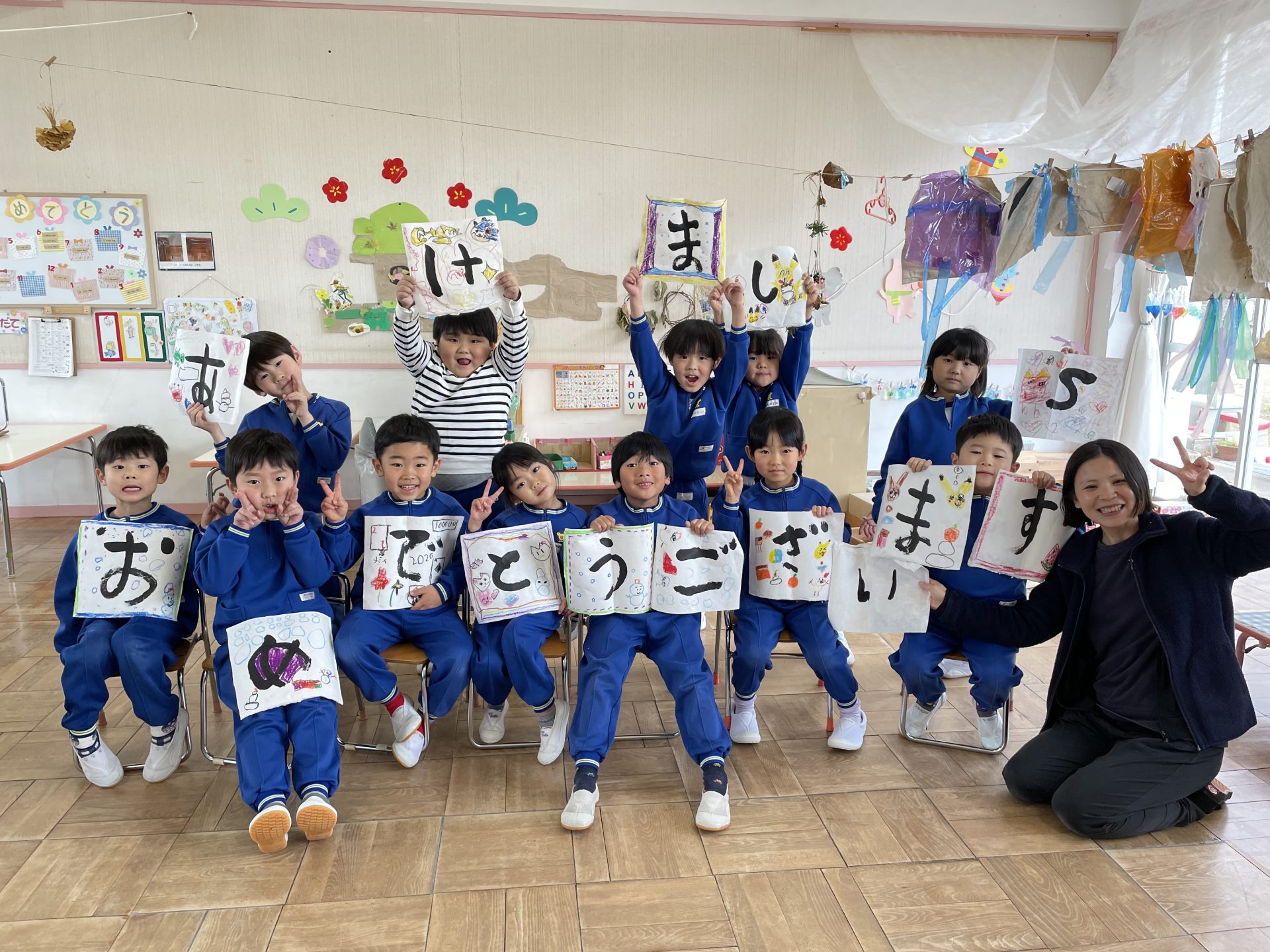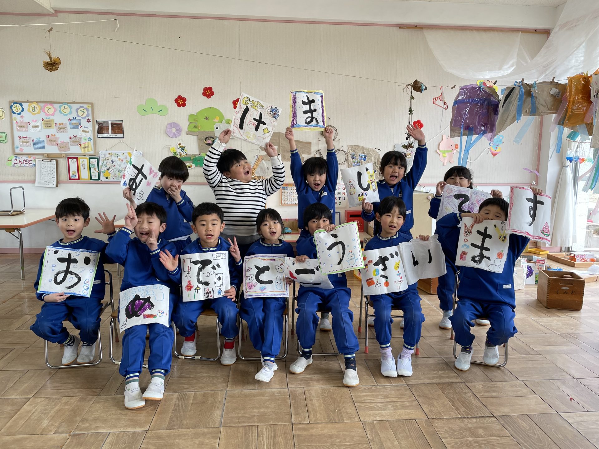 年の初めに・・「書初め」のお話。挑戦してみたいことやがんばりたいことをみんなでお話したりしました。墨の登場に、「学校で使うよ」「神社で墨の字みたことある!」