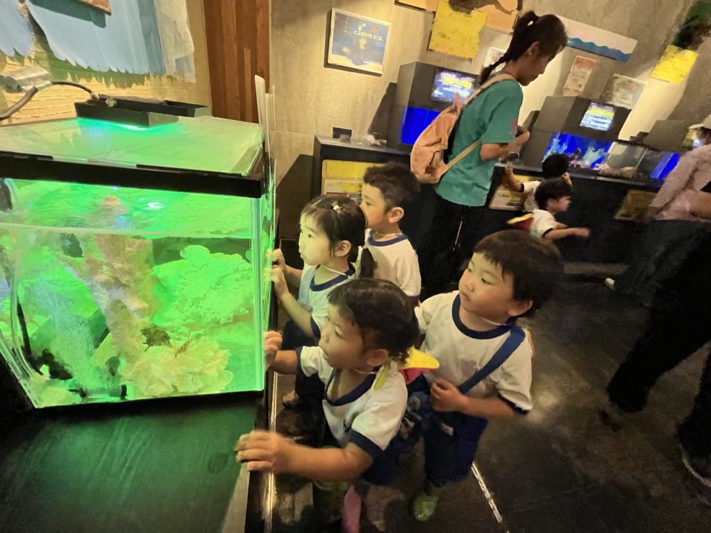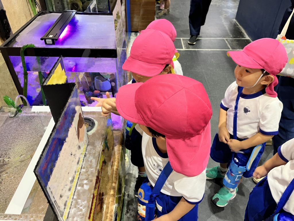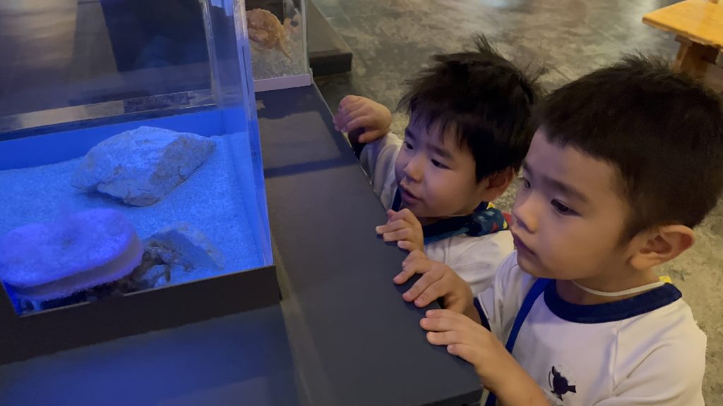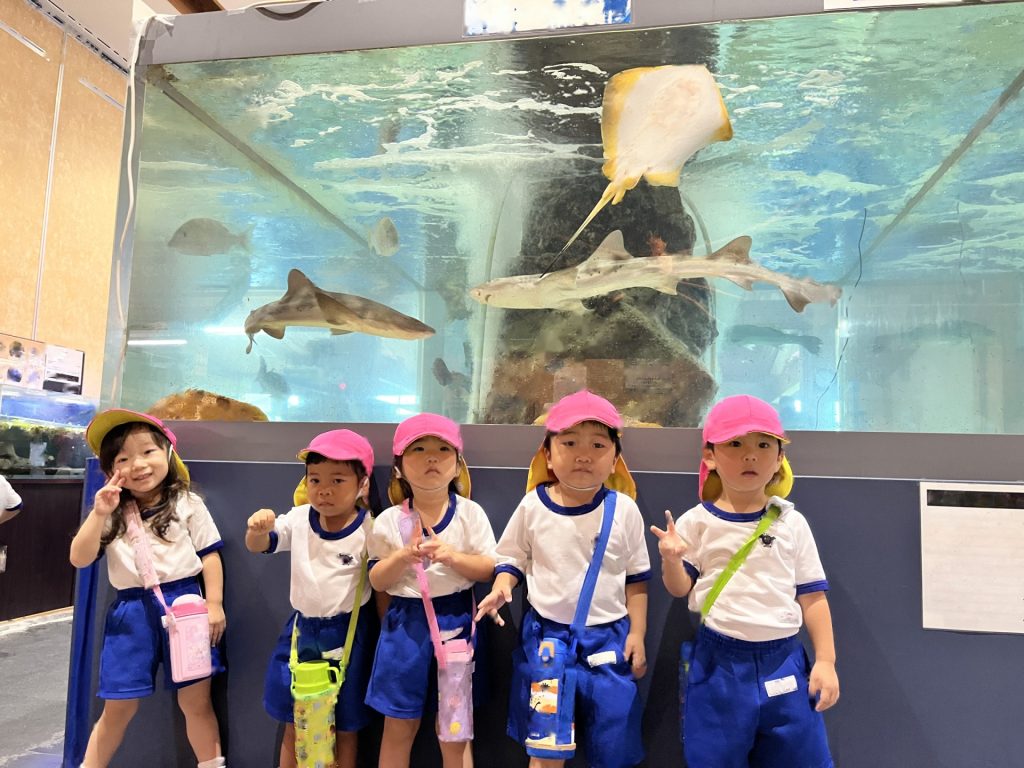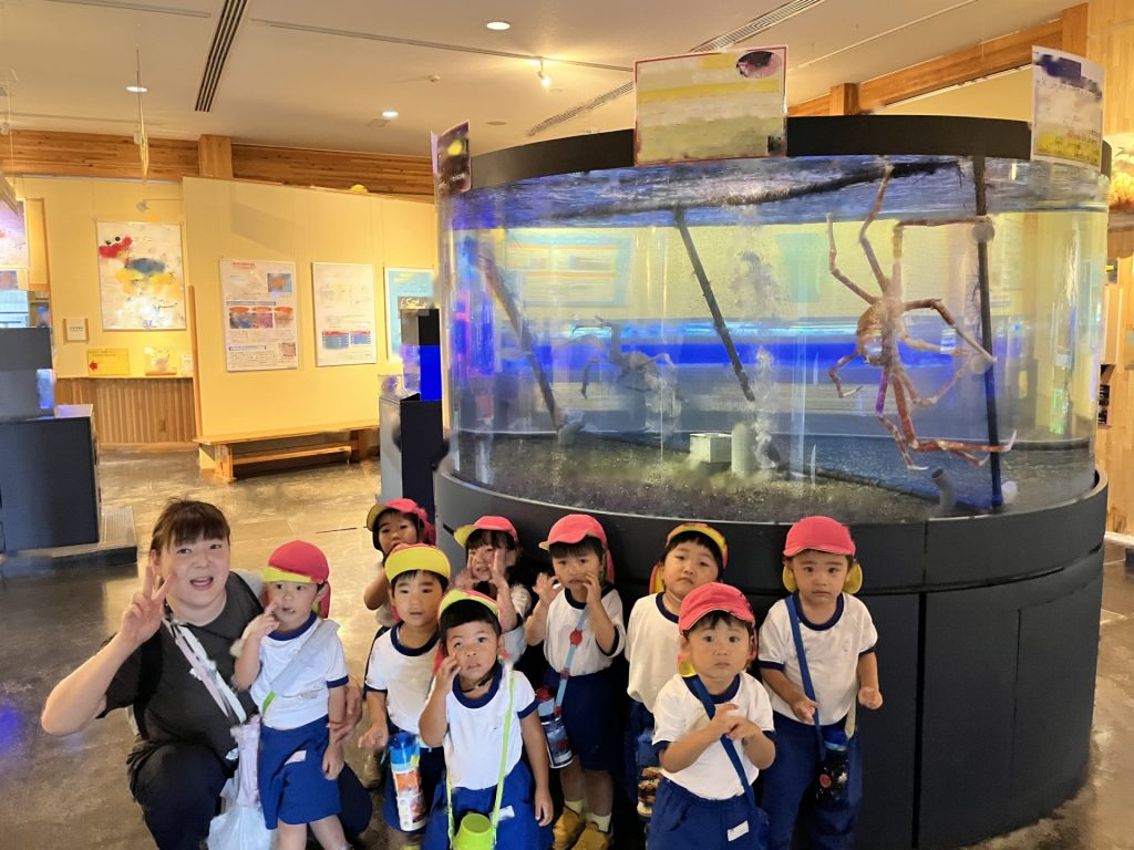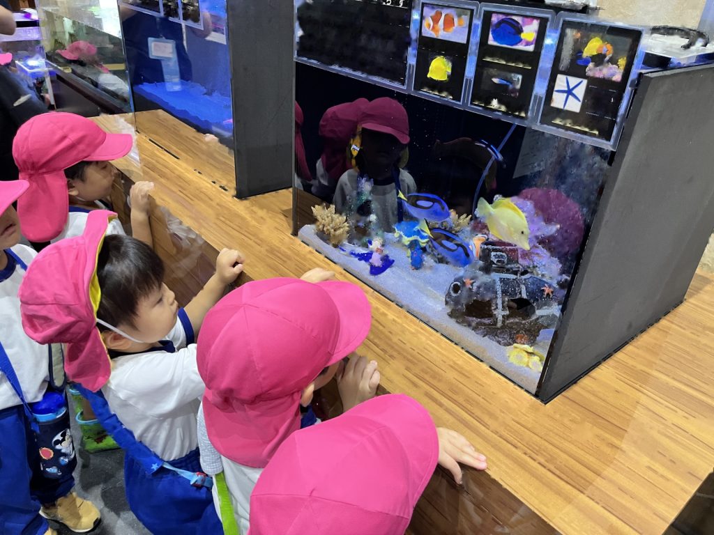 着いてから中の散策を楽しんだり、みんなで写真を撮ったりと館内で自分の見たい魚を見ることを楽しんだたんぽぽ組さん!サメがいることや大きなカニがいることに驚き、一歩後ろに下がって魚を見る微笑ましい子ども達の姿もありました♡