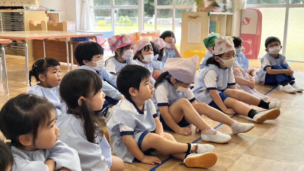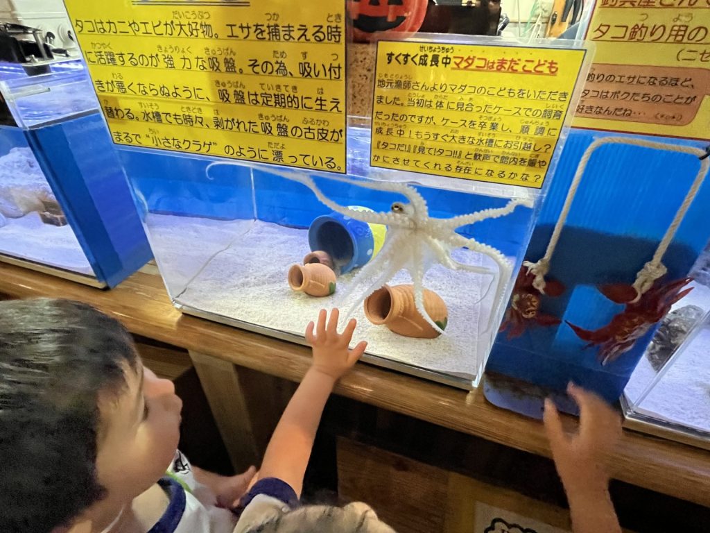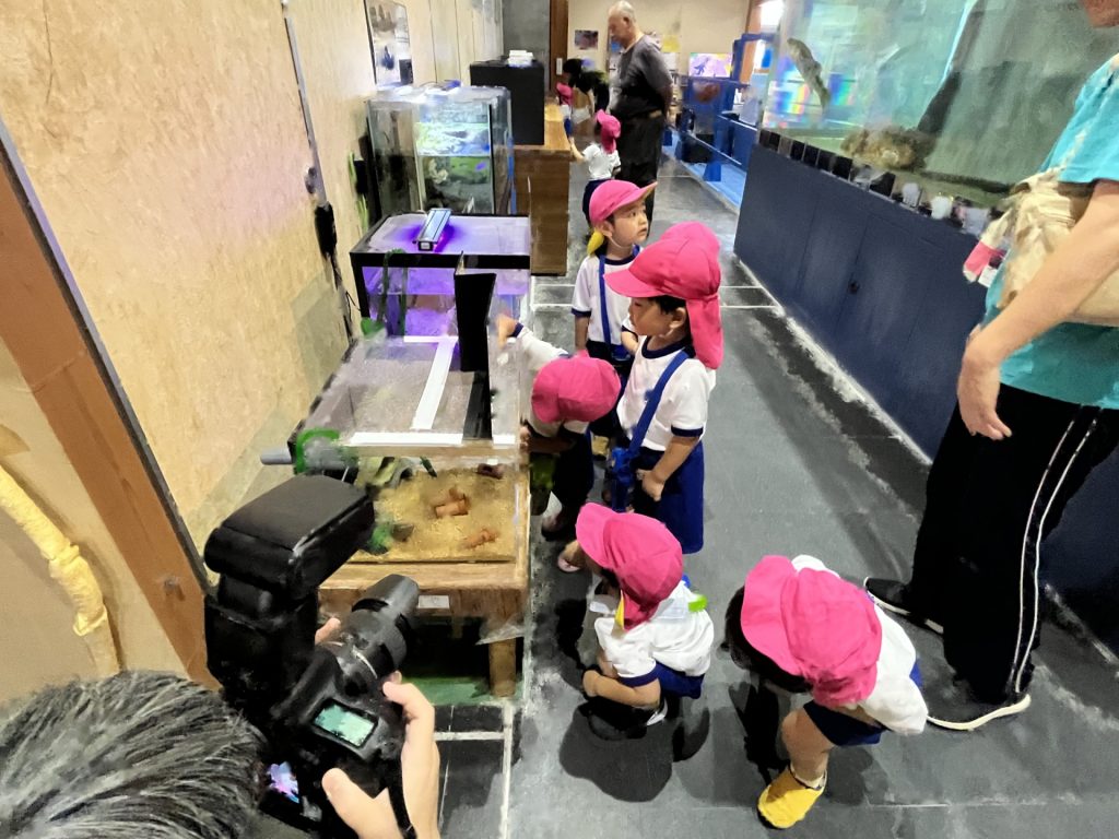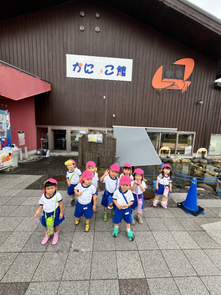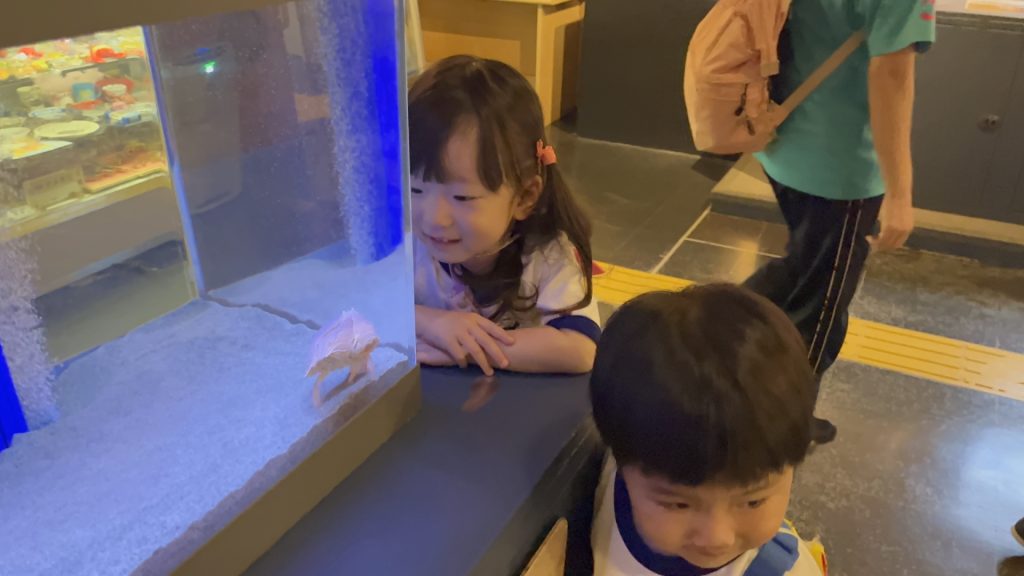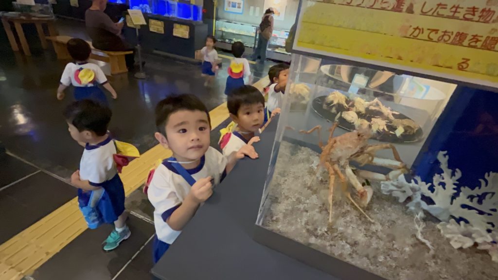 当日、天候は朝から雨で、かにっこ館に行くことを伝えると、「やった~!!」「魚大好き!」「サメもいるよ!」と嬉しさを言葉にして表現することを楽しむ子ども達でした!!